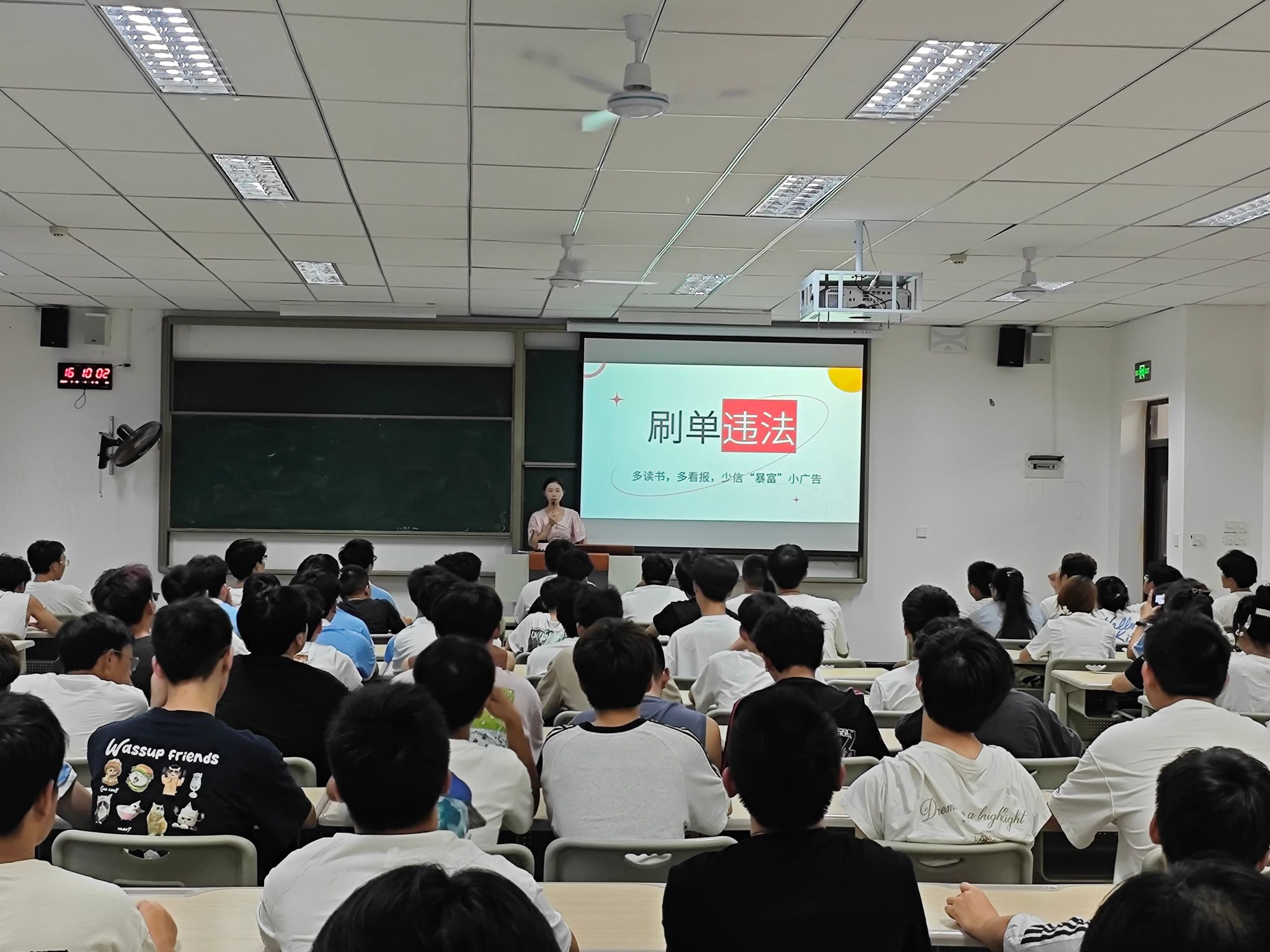 老师们分别通过举例网贷、刷单等案例,警示同学们防止受骗并从中学到反诈“六不”、“八个”凡是,引导每位同学积极下载国家反诈中心APP及加入合川反诈卫士保护圈。其次,老师们也通过校园以往案例及学校的相关文件表示,同学们切勿存在侥幸心里,不要轻信来历不明的电话和短信。