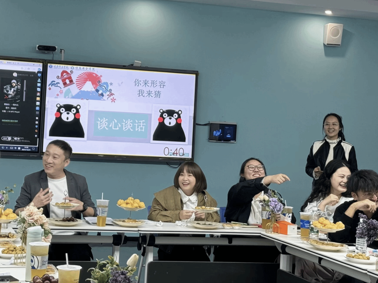 主持人李阳介绍活动内容及游戏规则。游戏环节开始,以尹院长为代表的甲队和以邹主任、温书记为代表的乙队展开较量。“心有灵犀一点通”中,关键词为辅导员平时的工作内容——“谈心谈话”“完满”“查课查寝”“奖勤助贷”“迎新晚会”“志愿服务”“闪耀移通”“安全警示大会”等,一个个词条在屏幕上闪过,两个队伍的老师们通过队友夸张的动作、丰富的表情、恰当的表述捕捉信息。现场气氛火速升温。