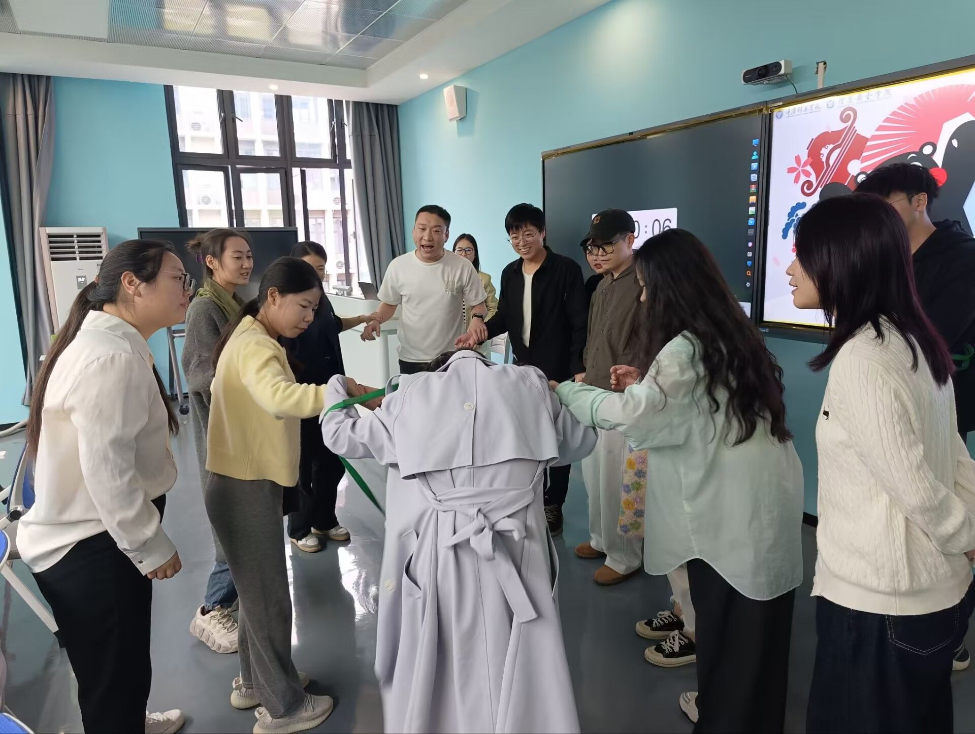 在“穿越时空”中,两个队伍的成员拉着手腕围成一圈,灵活调动四肢,依次穿过套绳。邹主任在团队中不断指导大家、帮助队友规避错误,缩短用时。两支队伍各自朝着目标而努力着,套绳从最后一个老师身上穿过时,大家不约而同鼓掌庆祝着团体的成功。