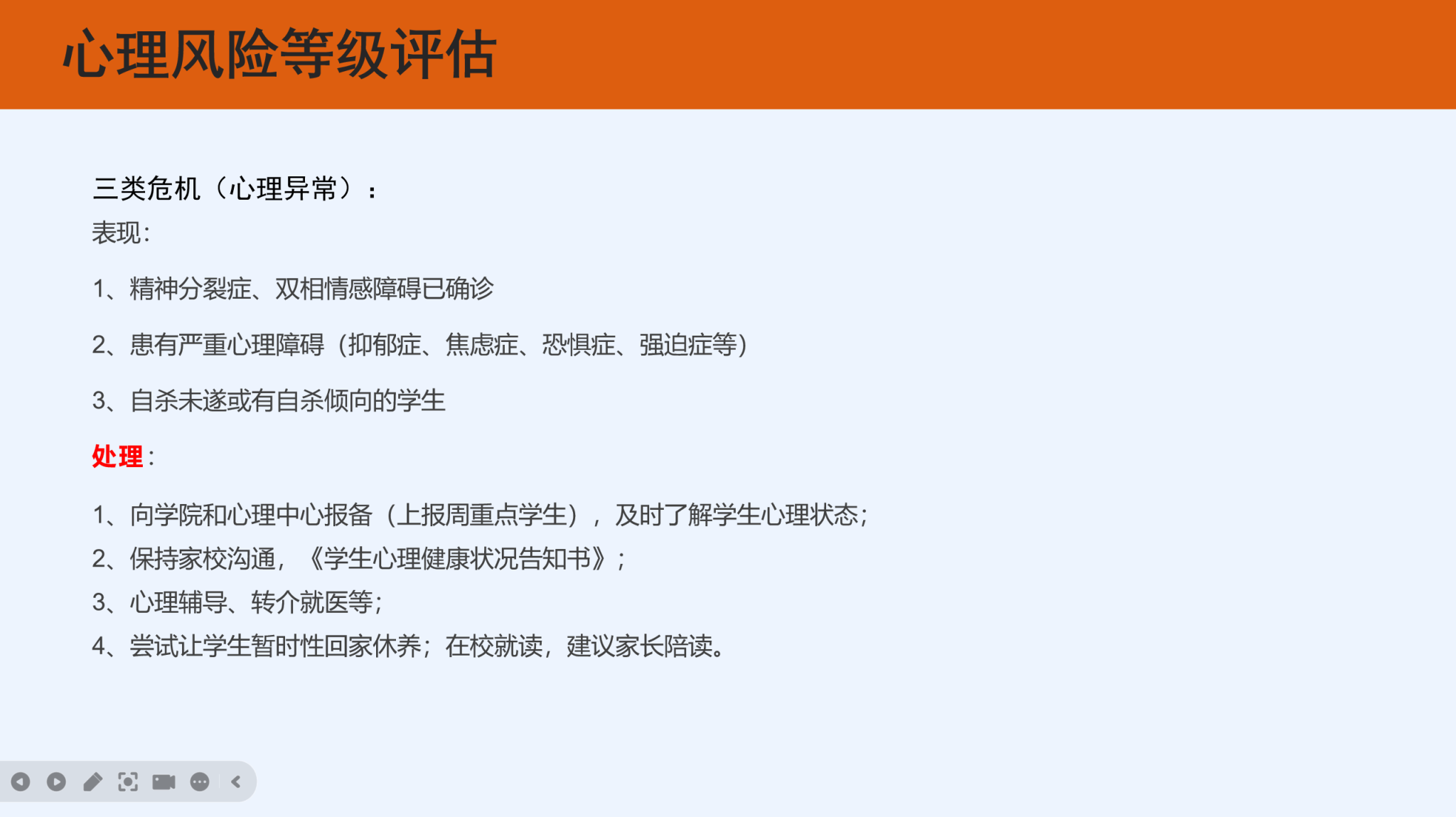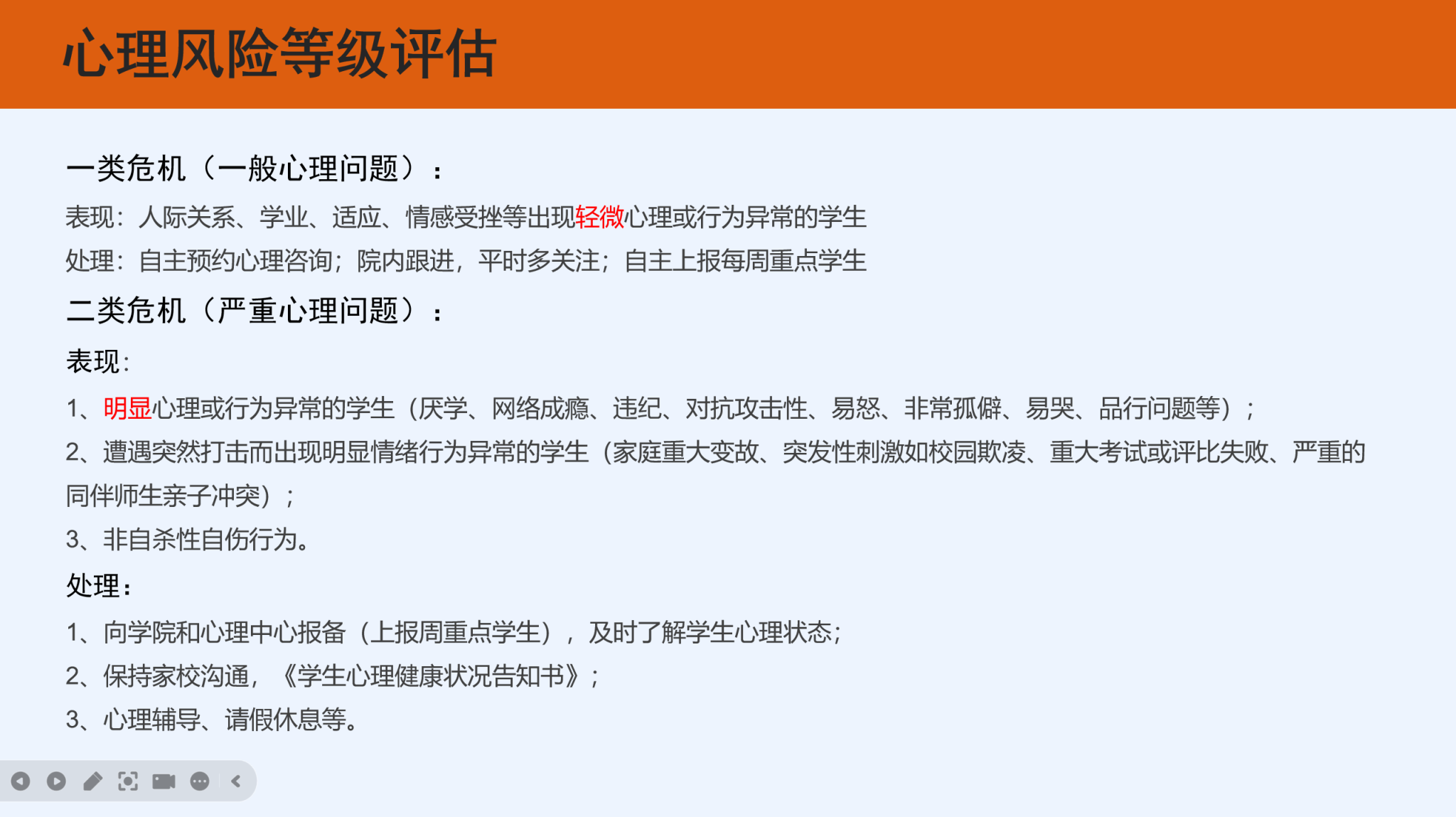 一是设置学院心理调查问卷。动态化、常态化、持续化了解学院每月、每周各专业学生心理健康概况,建立心理健康专项台账,监测与反馈心理异常学生,并对此开展有针对性的介入服务。