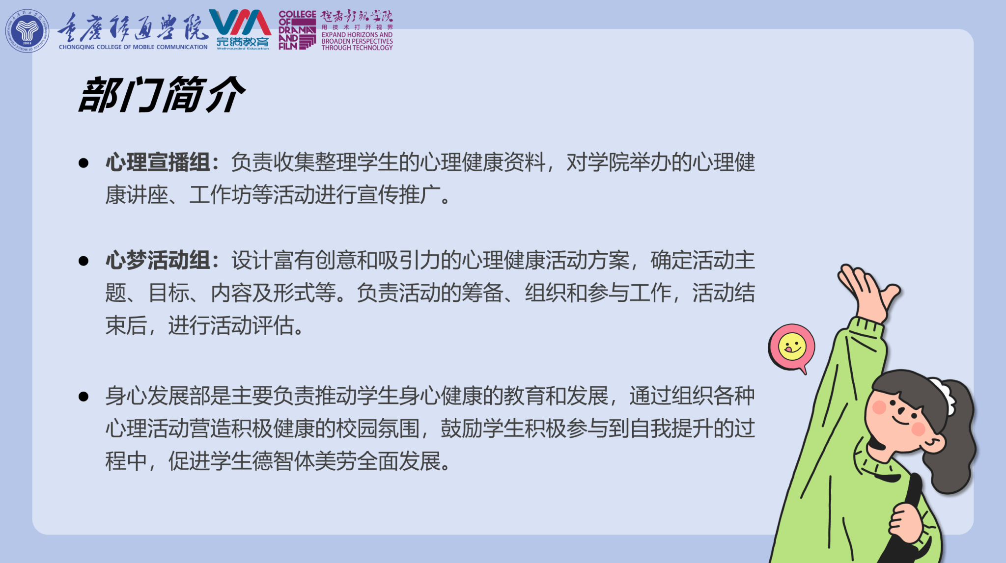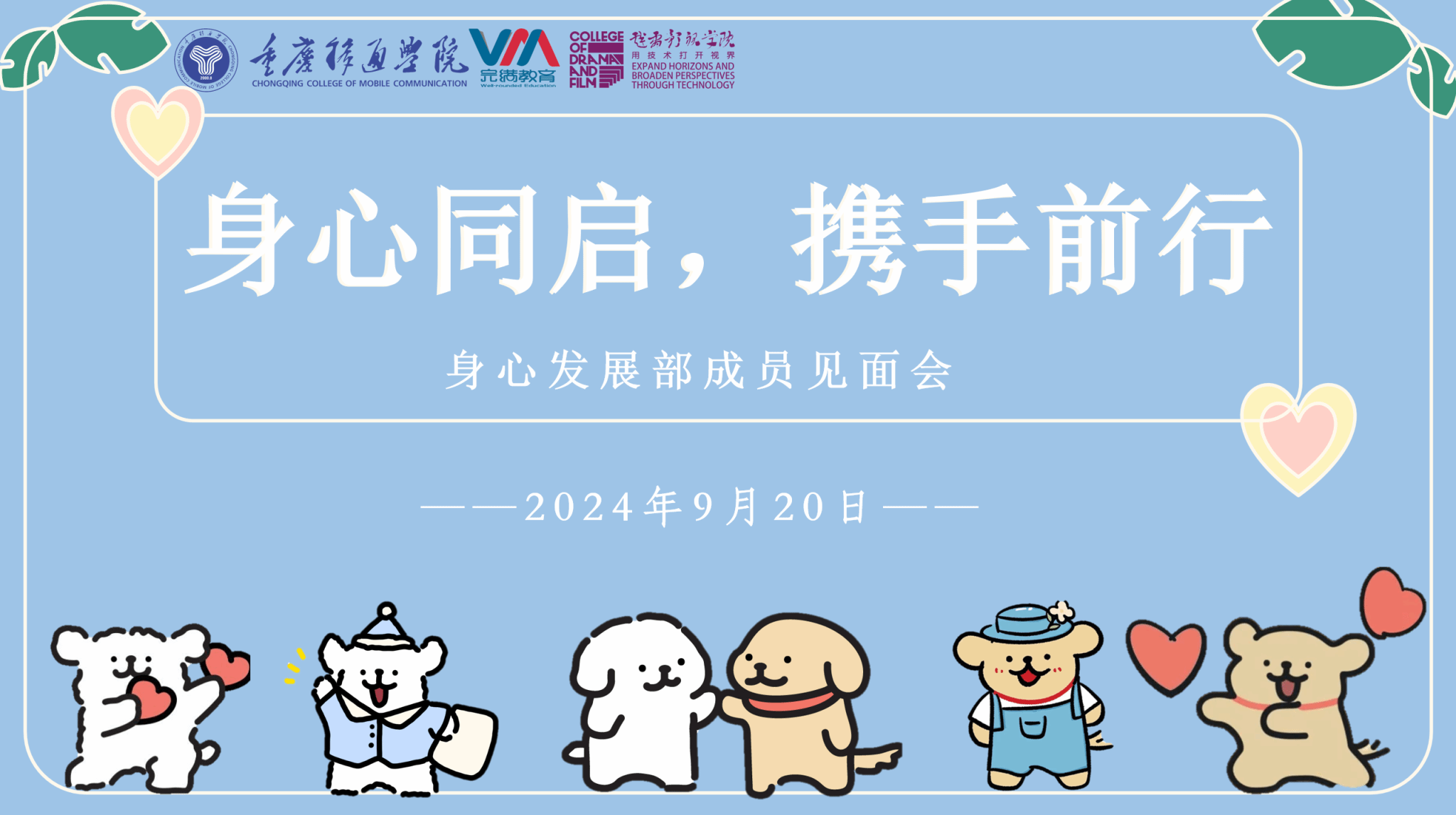今年9月,戏剧影视学院成立身心发展部,作为学院心理健康教育的核心力量。部门致力于打造一个温馨、包容、和谐、开放的心理支持环境,促进同学们的身心健康,为他们的学习之路铺设坚实的心理基石。身心发展部目前主要分为心理宣播组和心梦活动组,同时协助心理健康专项小组梳理与整合材料,通过一系列活动让同学们更好地体会到校园生活的绚丽多彩,切实提高戏影学子们的幸福感、满足感、归属感,鼓励学生积极参与到自我提升的过程中,促进德、智、体、美、劳全面发展。身心发展部的小伙伴们希望他们的存在如同一盏温暖的灯塔,能够照亮着每一位戏娃的心灵之旅。