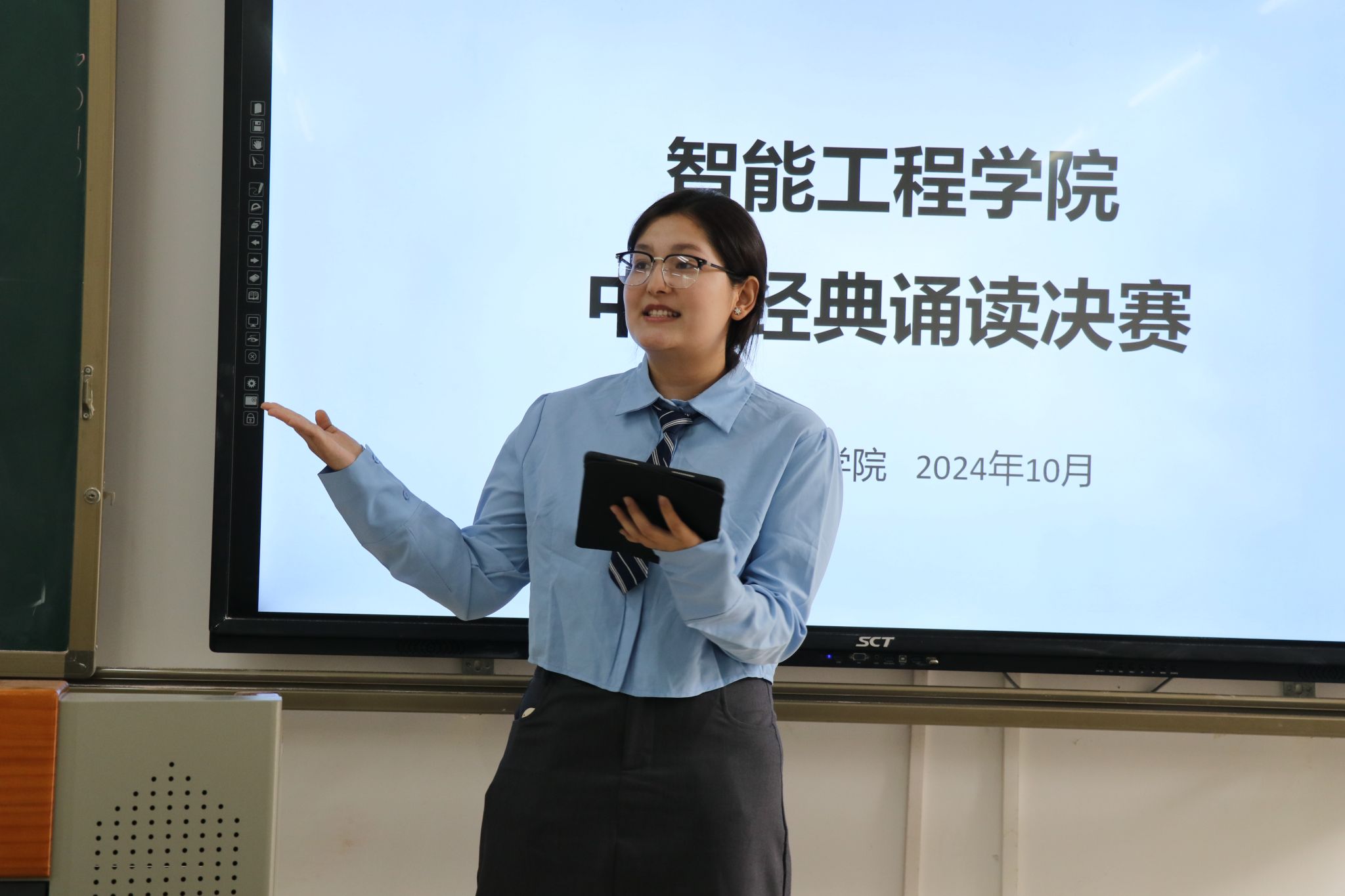在历史时间的长河中,中华文明走过5000年漫漫古道,遗留下了数不尽的文学经典,脉脉相传的文学经典在新时代的潮流中永不落幕。智能工程学院于2024年10月29日在松格113开展经典诵读大会决赛。经过“经典诵读”大会初赛选拔,众多优秀的朗诵者脱颖而出,齐聚于此,异彩纷呈,展开了一场别开生面的中华经典诵读大会。此次诵读大会旨在传承中华优秀传统文化,弘扬经典文学魅力,丰富校园文化生活,提升学生的人文素养,为智工学子们提供了一个展现自我风采的平台。此次大赛由刘桃、张秋婧、殷蓉、吴家家、雷艳、黄一、黄体明、陈林、唐宇几位老师担任评委。