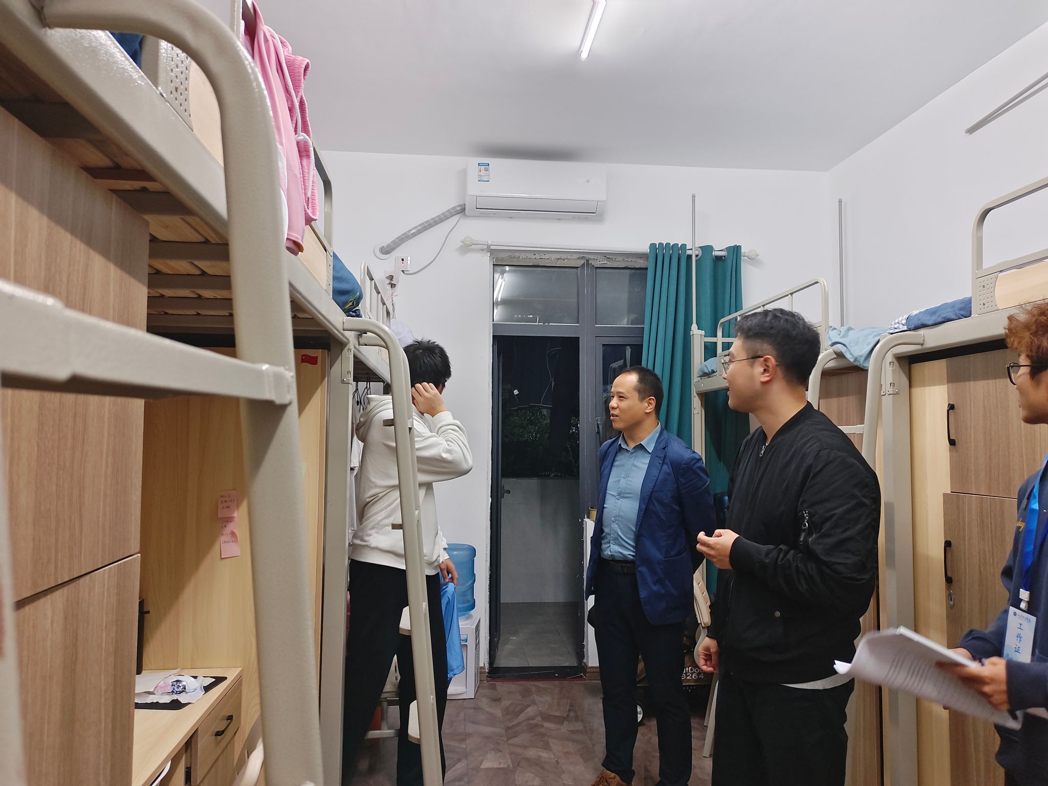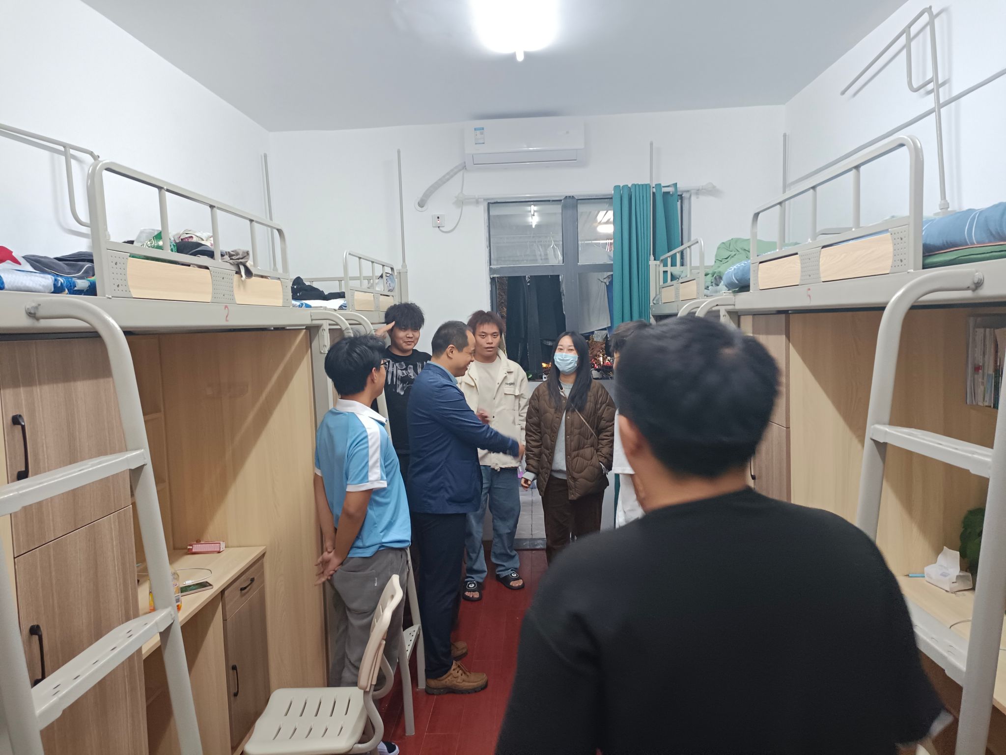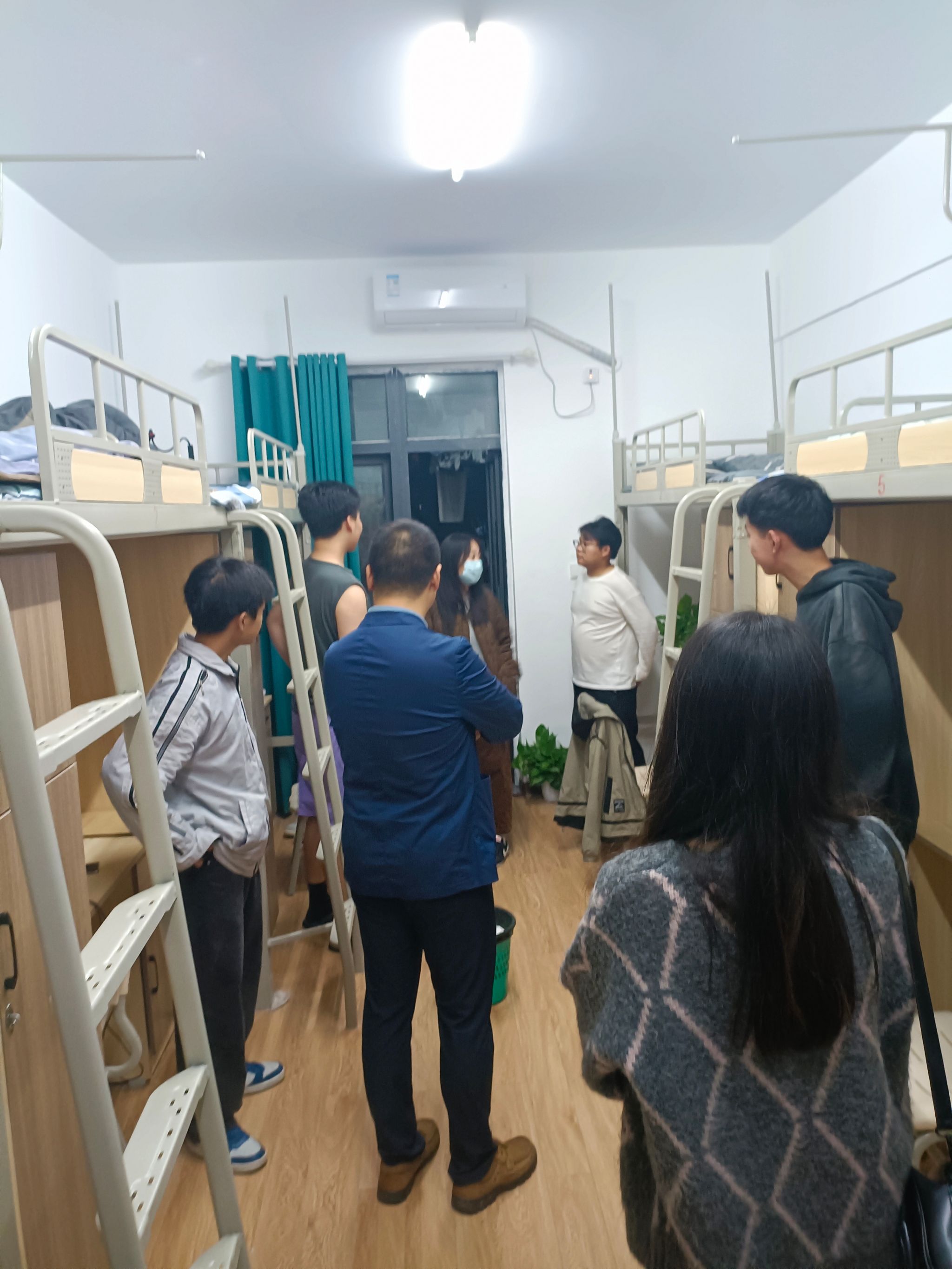 同时,老师们对同学们的宿舍卫生和生活环境表示关心,鼓励大家保持良好的个人和公共卫生习惯,营造温馨舒适的宿舍氛围。同时,还与同学们亲切交流,了解他们在学习和生活上是否遇到困难,叮嘱同学们要注意作息规律,互帮互助,共同营造良好的宿舍文化。
