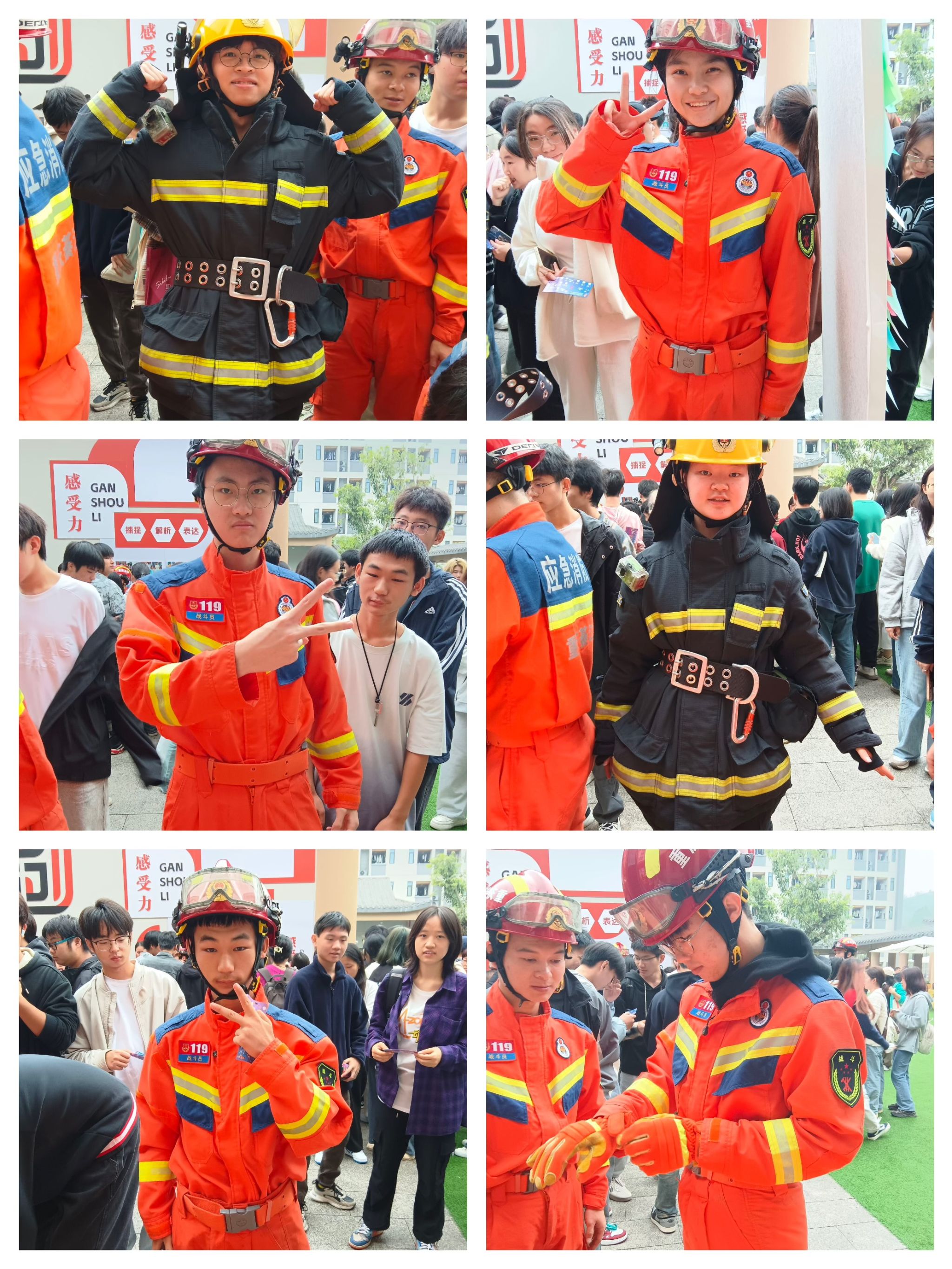 躬行知不易,力行见真知。在消防技能体验区,同学们认真聆听消防员讲解关于消防车、储水罐、高压水枪等设备的功能结构,并在消防员的指导下学习使用各类消防器材。体验穿戴消防头盔、消防防护服、消防靴、消防手套、消防腰带并学习安全绳打结技巧等。一系列实操训练揭开了消防的神秘面纱,拉近了同学们与消防之间的距离。实践操作应万变,通过消防技能体验,同学们学习到了更多的消防安全知识,也体会到了“火焰蓝”工作的艰辛与不易。