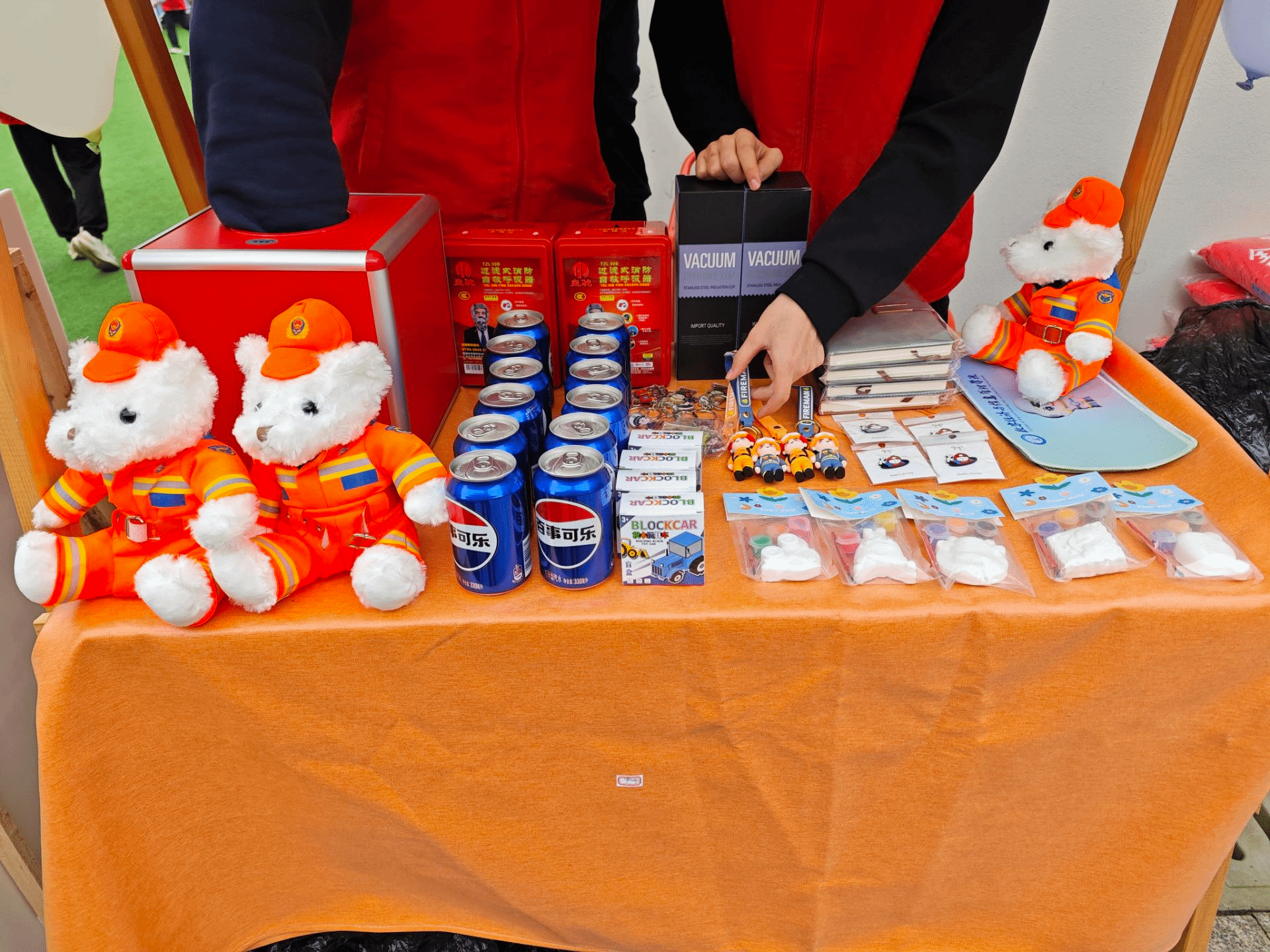 集满点位印章10个以上便可获得1次抽奖机会或者2个套圈,赢取精美消防主题奖品。套圈区域不一会便堆满了人,地上堆满了消防小熊、消防主题钥匙扣等精美礼品。参与者认真选定站立位置,将一个个套圈瞄准自己心仪的奖品,套中者喜笑颜开,未套中者再接再厉,继续准备着下一次套圈。