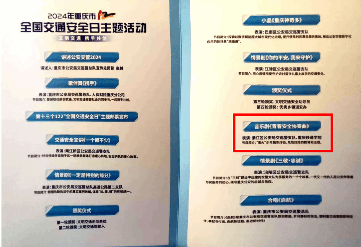 12月2日,第十三个122“全国交通安全日”来临之际,重庆市“全国交通安全日”主题活动在巴南区盛大启幕。本次活动由重庆市公安局、市委文明办等多部门联合主办,市公安局交巡警总队与巴南区公安分局承办,吸引了各界代表700余人参与。我校艺术教育中心与远景学院携手綦江区公安局交巡警支队精心创作的原创音乐剧《青春安全协奏曲》亮相活动现场,为交通安全宣传注入了我校青年大学生的强劲力量。