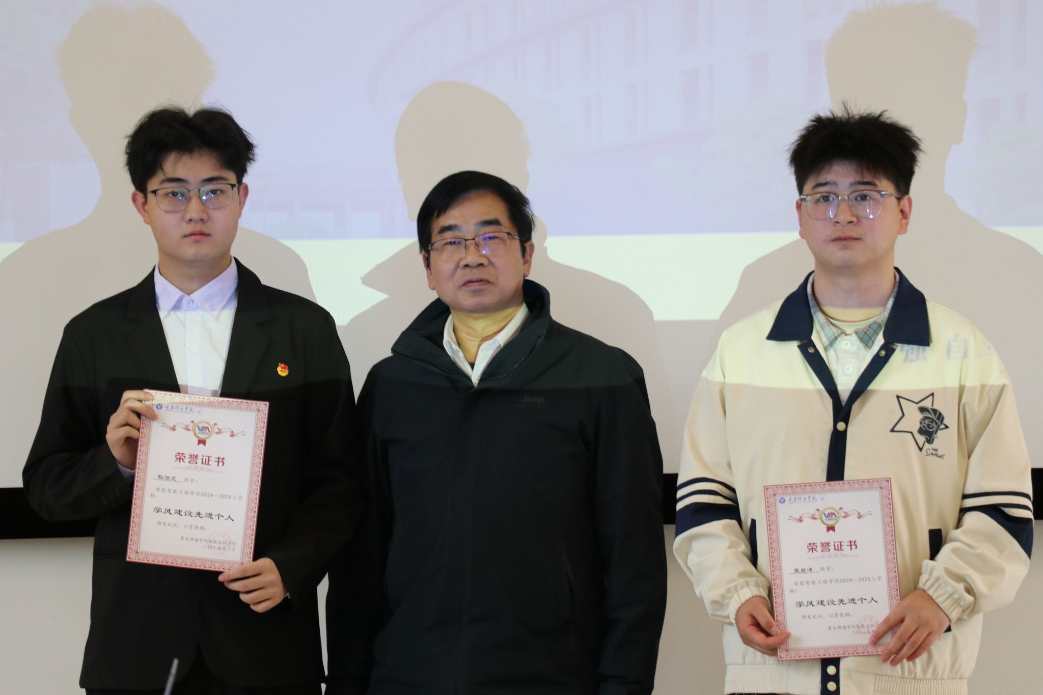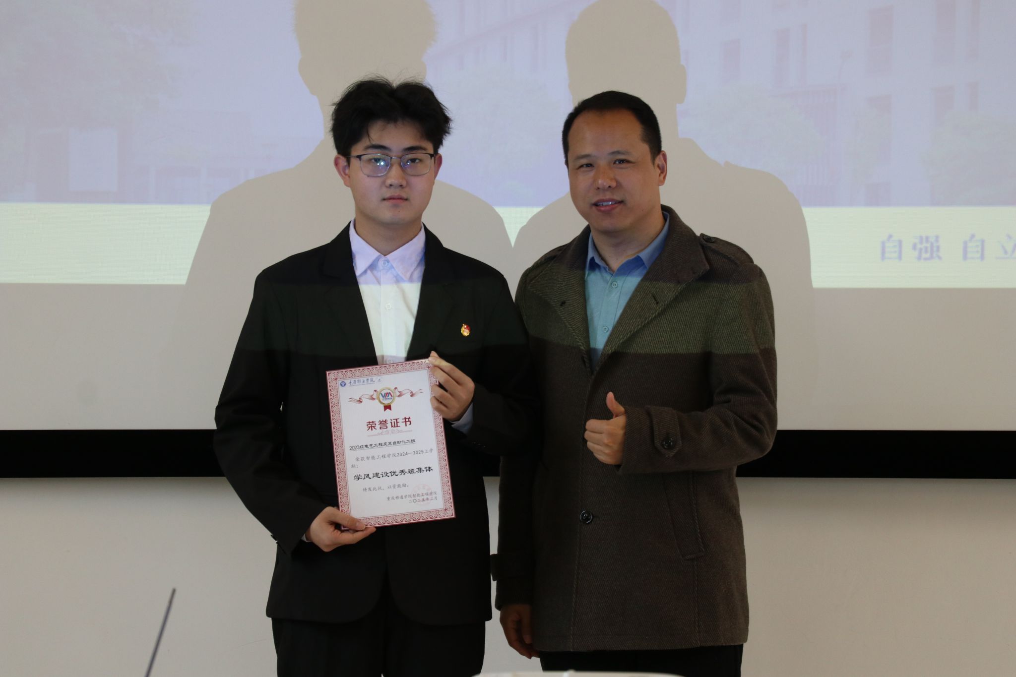 大会的首个议程——表彰优秀。主持人通报了在过去的一学期里,学院表现出色的个人和集体,辅导员殷蓉、黄体明、王辉明等7名老师周出勤率达100%,怀高度责任之心,坚守岗位树立敬业榜样。其中,2023级电气工程及其自动化2班100%的周出勤率和42%的前排率获评了学风建设先进集体,学生优秀代表、学风建设工作突出贡献者孙浩文、王自炜获评学风建设先进个人。学院祝玮副院长和教师代表尹超林老师为先进集体和先进个人颁发了荣誉。