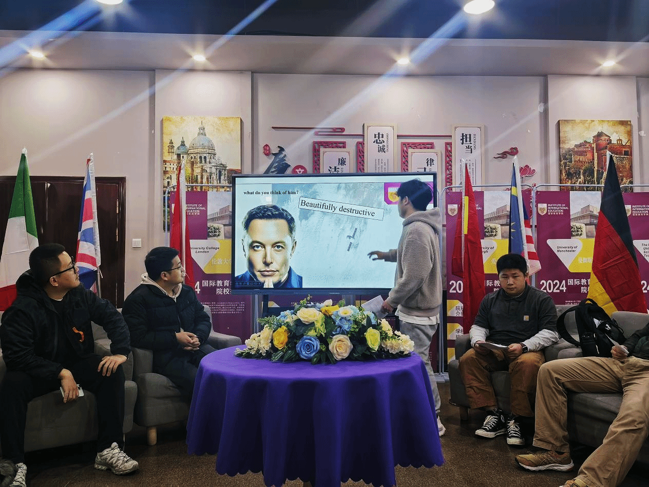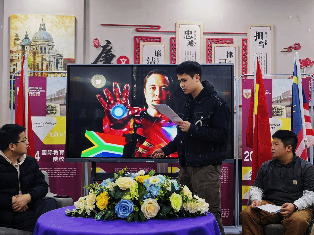 活动伊始,刘桐驿、秦子恒和孙浩原三位同学分别用英语的方式分享了他们对《埃隆·马斯克传》的读后感。秦子恒以“星际视野与脚踏实地的悖论统一”破题,强调马斯克用“十倍思维”重新定义可能,这正是Z世代突破内卷困局的关键;孙浩原深度剖析SpaceX九死一生的创业史,提炼出“危机领导力”内核:“从‘猎鹰1号’三连败到星链崛起,马斯克证明了真正的领导者是在绝望中为团队点燃确定性”;刘桐驿则聚焦可持续科技革命,指出“特斯拉开放专利、脑机接口挑战生命伦理,这种‘激进共享主义’正在重塑全球科技伦理的坐标系”。