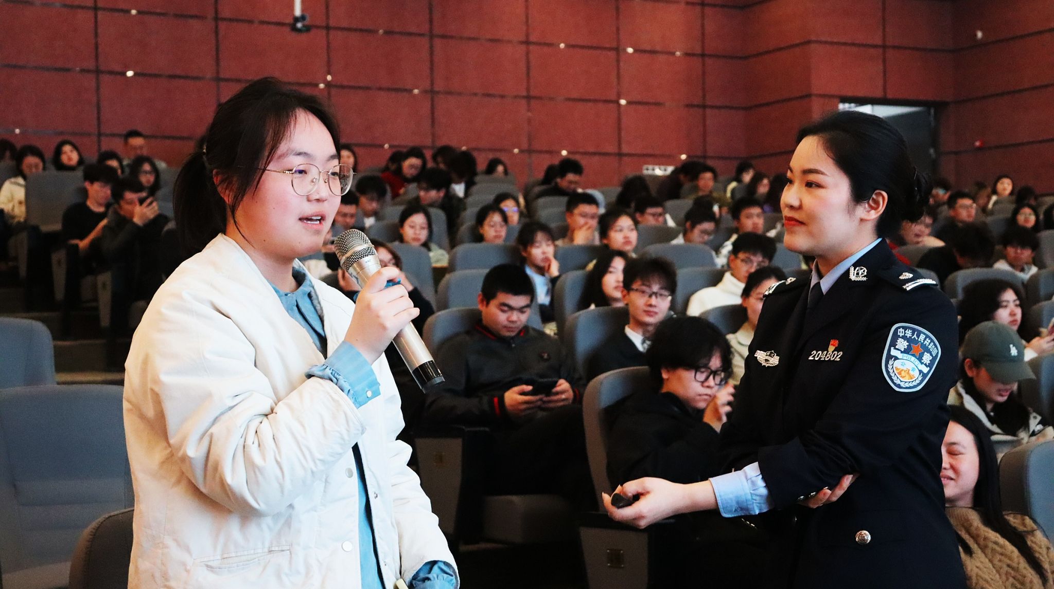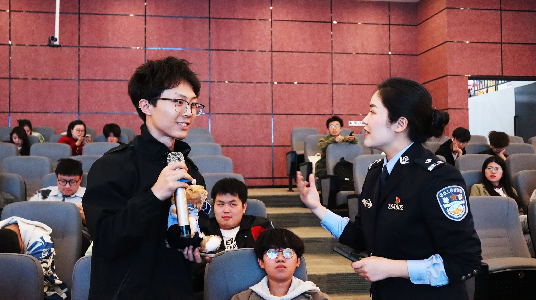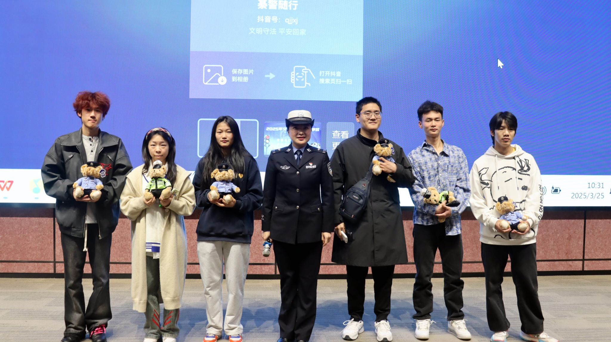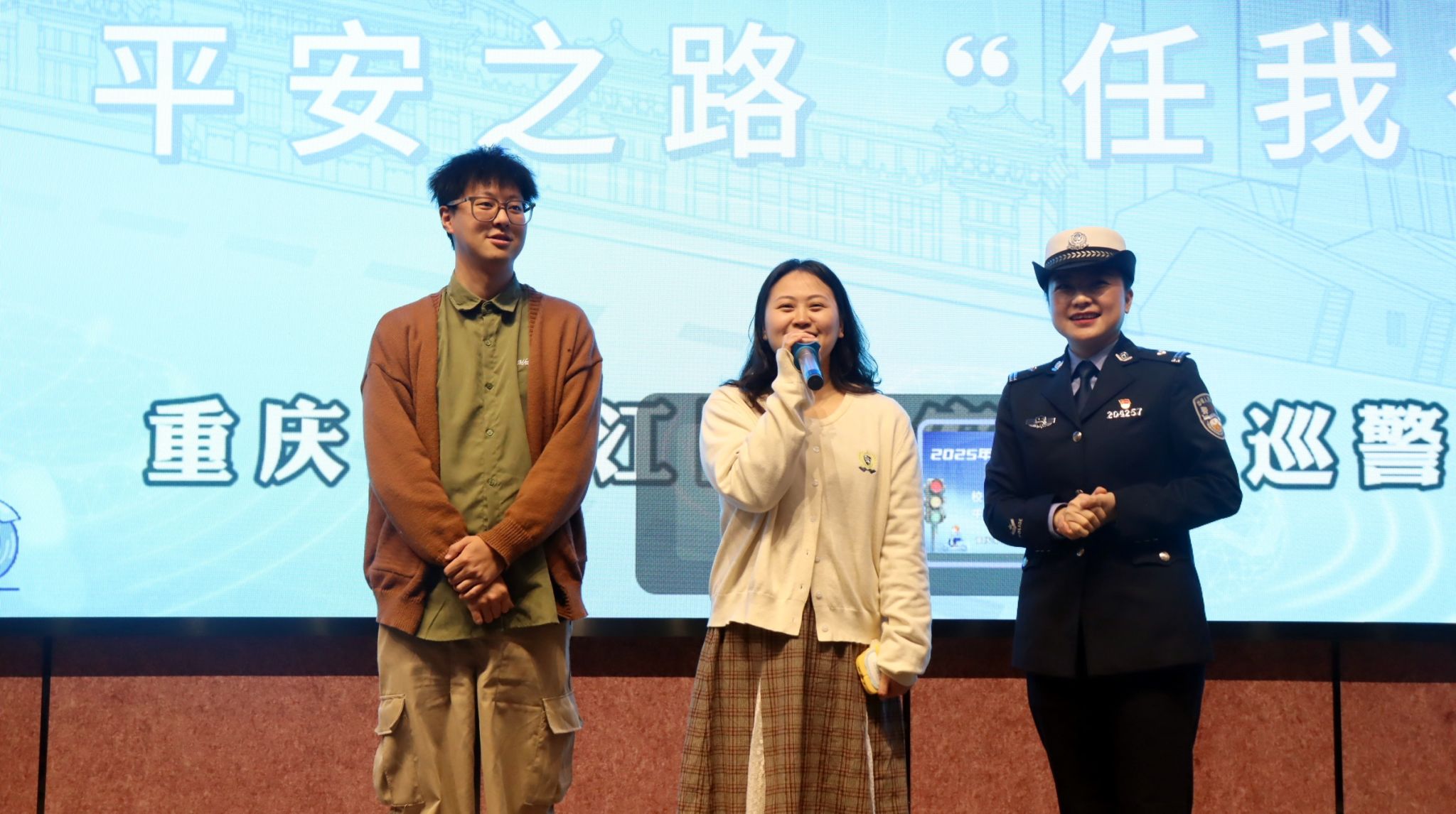 綦江区公安局交巡警支队的曹莹警官以“一盔一戴”为开场白,瞬间点燃现场观众的热情。戏剧影视学院的辅导员廖炳屹老师快步冲上台,自信作答:“我知道,一盔一带指的是头盔和安全带。”“回答正确!”曹警官与师生们展开的现场互动,场面异常热烈,大家踊跃参与,竞争激烈。每一位回答问题的同学,不仅展现出自身对交通安全知识的熟知程度,还收获了一份心仪的礼品,可谓是知识与惊喜兼得。
