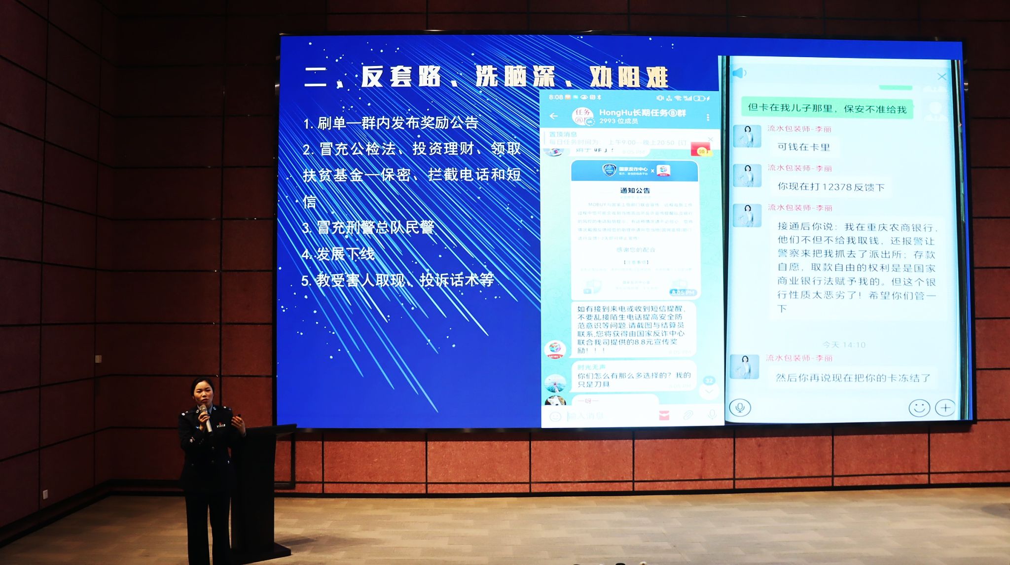 互动环节过后,何警官深入探讨刷单行为对电商平台、消费者以及社会经济发展的多维度影响。她结合学校发生的两起真实案例,细致入微地讲解了兼职刷单、交易退费、网络交友等层出不穷的新型刷单骗术。何警官还精心设置模拟训练,从受害者视角层层剖析诈骗分子惯用的诱骗伎俩。在场师生皆屏气敛息,认真聆听,在惊叹诈骗手段花样翻新、更迭迅速的同时,也收获了满满的反诈骗知识。