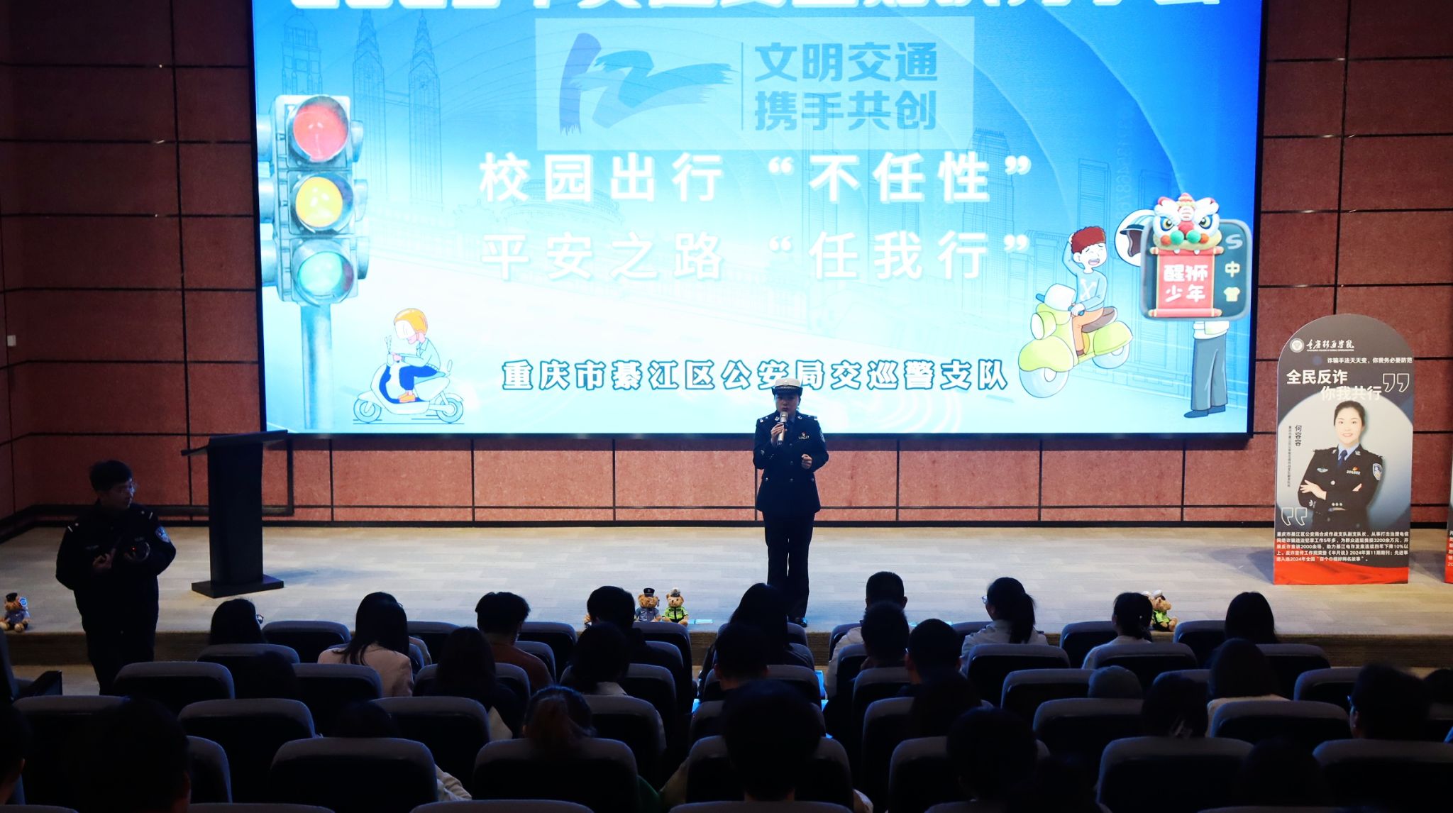 为深入贯彻落实国家法律法规政策,普及交通安全知识,提升全校师生反诈意识,重庆移通学院綦江校区于3月25日上午10点在贤者楼423报告厅成功举办法治大讲堂第11期“反诈行动齐聚力,交通安全同践行”主题讲座。