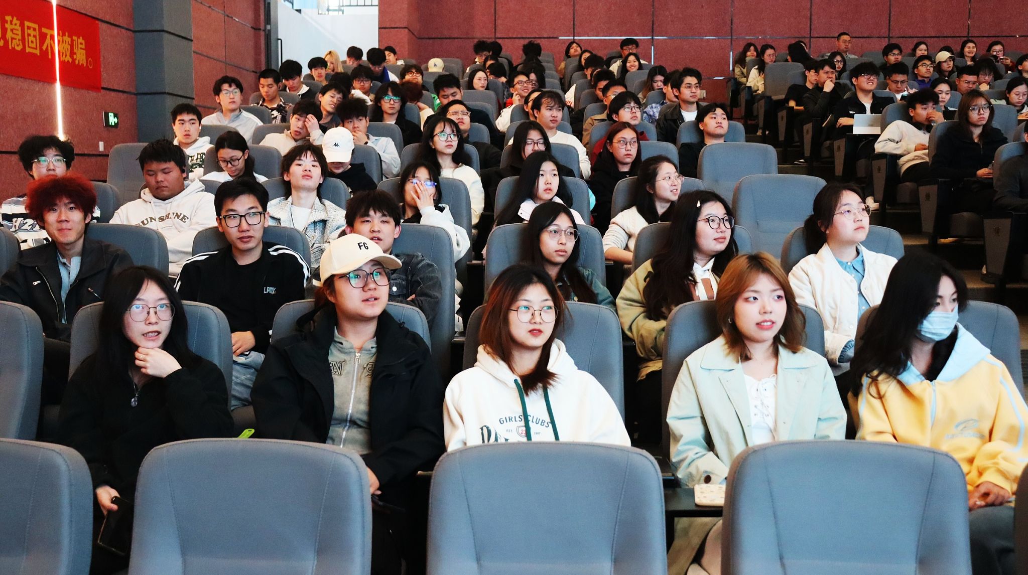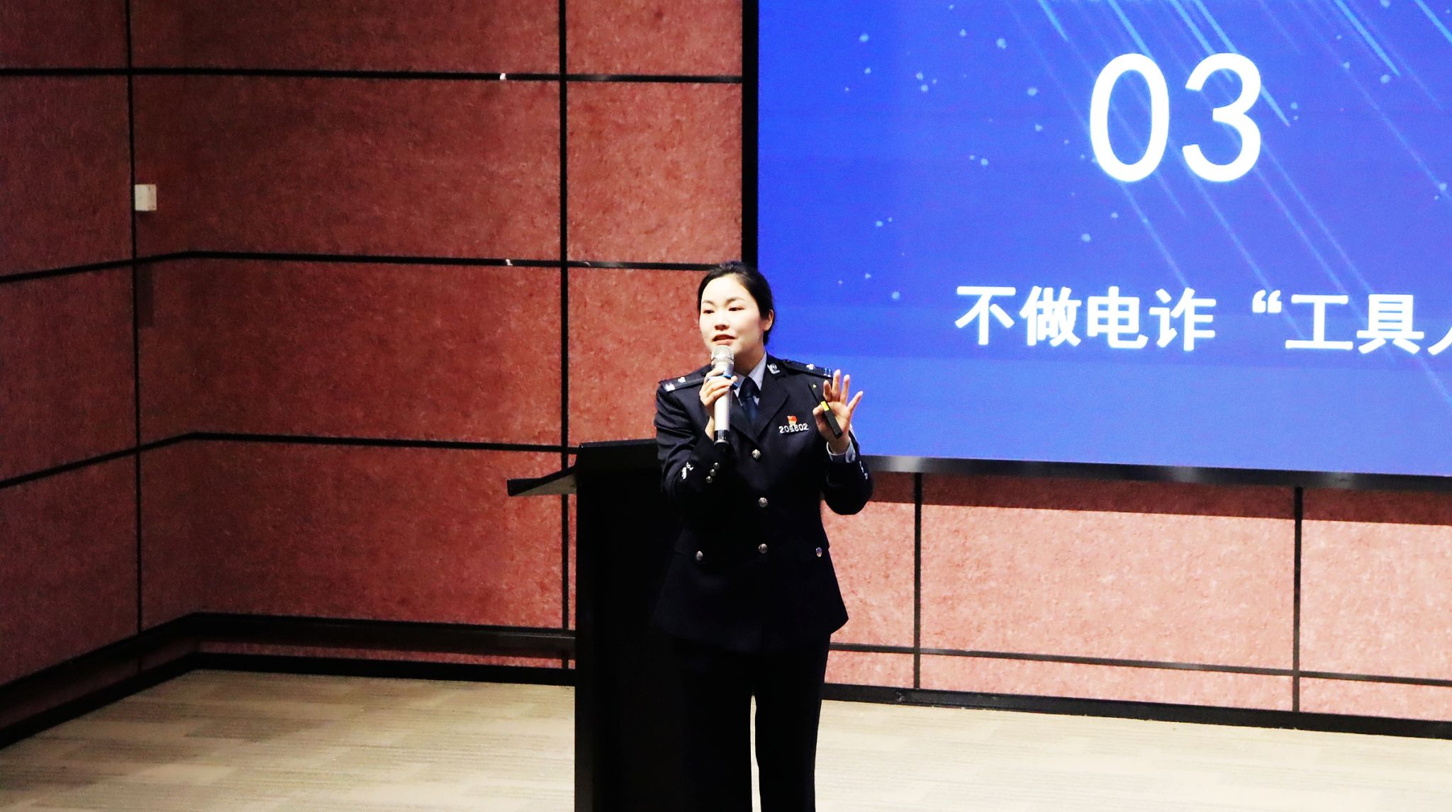 “你知道,最大的诈骗案件金额是多少吗?是2400万!”现场爆发出一阵惊呼,綦江区反诈骗中心的何容容警官以一个简单的提问便深深吸引住了全体师生注意力。紧接着,何警官以“防范电信网络诈骗”为主题进行了反诈教育,从讲解电信网络诈骗的新变化,再到分析高发诈骗类型,最后提醒所有观众不做电诈“工具人”,内容丰富详实,既有高屋建瓴的理论阐释,又不乏鲜活生动的案例佐证。加之互动环节的巧妙穿插,现场师生热情高涨,气氛热烈非凡。
