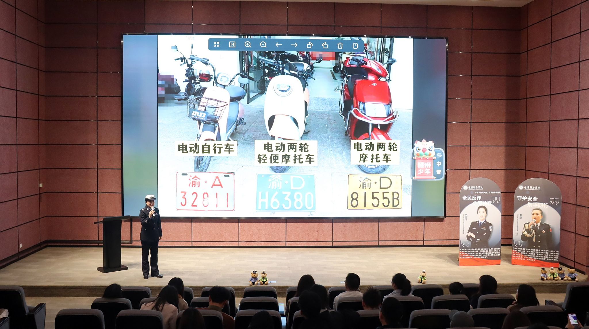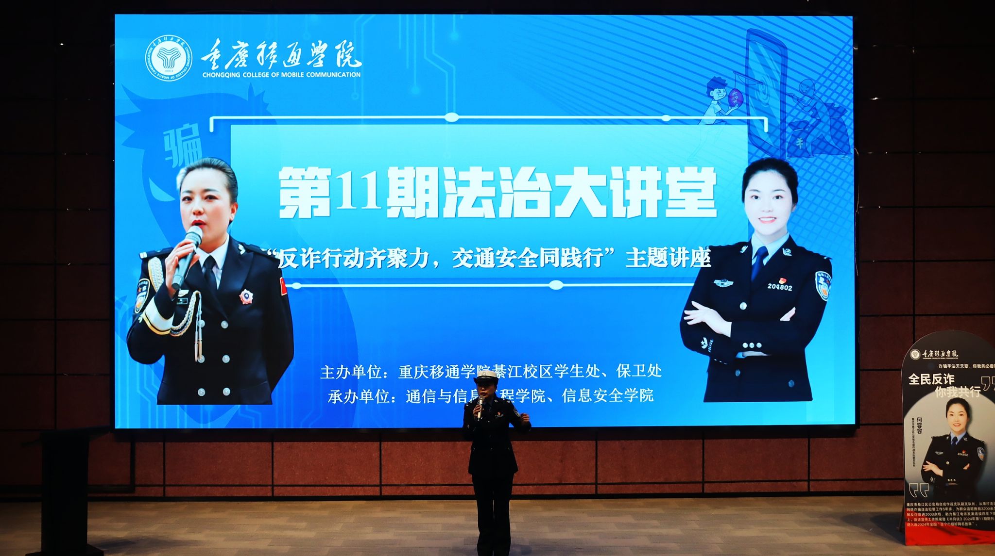 本期法治大讲堂由学生处、保卫处主办,通信与信息工程学院和信息安全学院承办,邀请綦江区公安局交巡警支队民警曹莹警官、綦江区反诈中心何容容警官莅临现场讲解,綦江校区全体辅导员、学生代表共计200余人共同参加本次讲座。