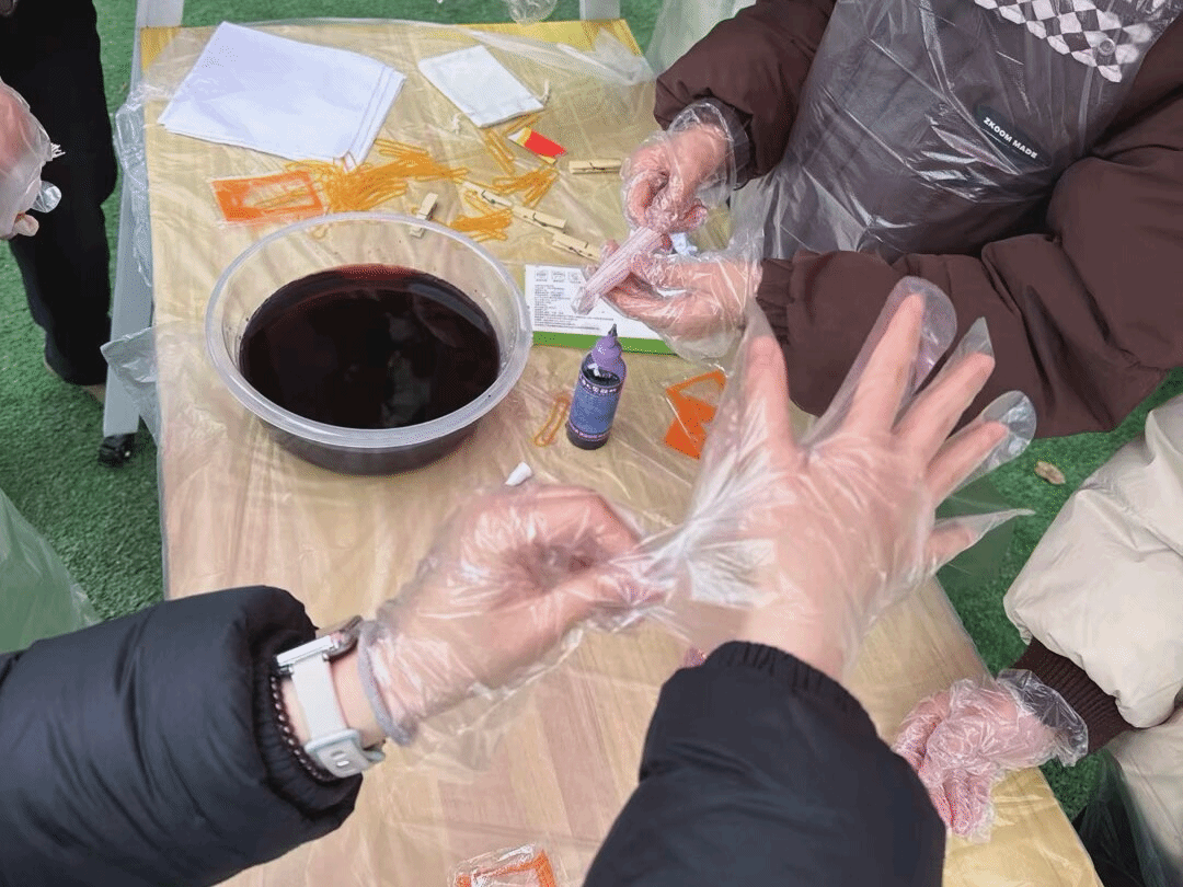 “扎染的美,就在于既有意外的惊喜,又有精心设计的巧妙,二者相互交融。”在实践环节,指导老师亲自上阵,现场演示“风车折”“鹿胎缬”“鱼子缬”这些快要失传的经典纹样扎法。同学们都安静极了,全神贯注地看着,有的用竹尺仔细量布,有的拿着针线,像在布上作画。有的同学照着大理周城白族的“卷压缝扎”四种方法一起用,还有的用黄豆、卵石当作天然的防染材料,模仿《资治通鉴》里唐代宫廷“青碧缬衣裙”那种冰裂纹的效果。染缸里,用板蓝根、蓼蓝、木蓝混合制成的古法靛水翻涌着,经过氧化,原本白白的布慢慢变出“雨过天青”“月白风清”这些好看的中国传统颜色,大家看了都忍不住赞叹。