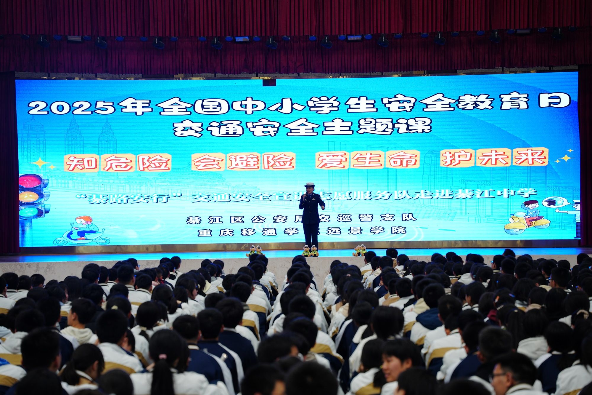 2025年3月31日是第30个全国中小学生安全教育日。为进一步增强青少年交通安全意识,重庆移通学院远景学院“綦路安行”交通安全志愿服务队联合綦江区公安局交巡警支队,走进綦江中学开展了一场生动有趣的交通安全主题宣传活动。此次与你“童”行·綦路安行主题活动,通过短剧表演、互动、警示片观影等形式,为同学们带来了一堂别开生面的交通安全课。