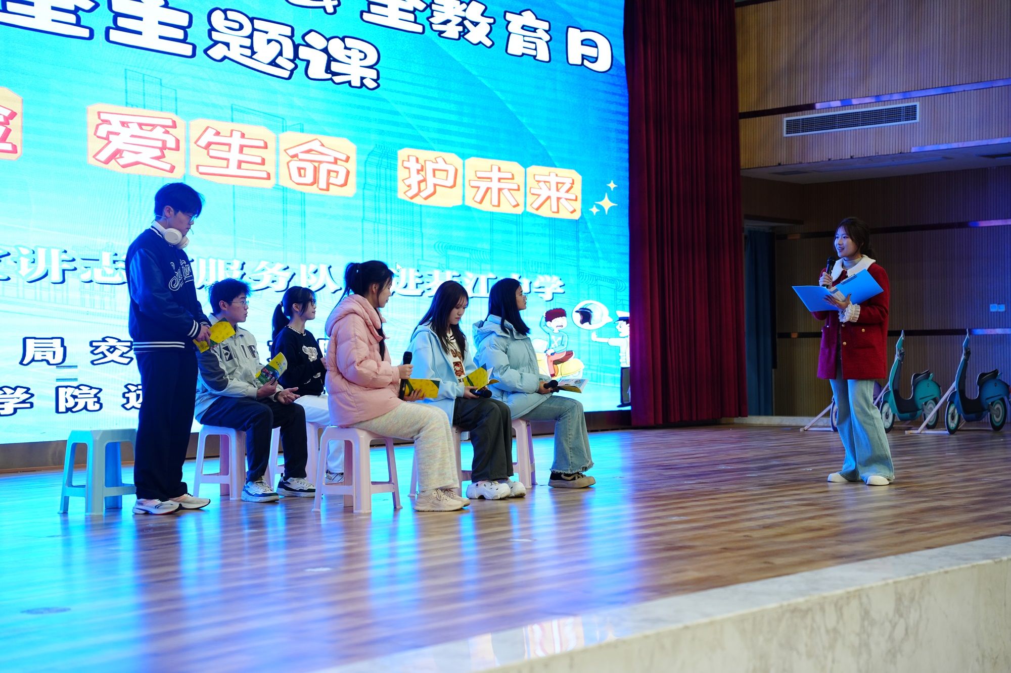 “綦路安行”交通安全志愿服务队的志愿者们为綦江中学的同学们带来了自编自导自演的短剧——《交通安全无小事》。志愿者们以生动鲜活的表演,将同学们在日常对交通安全教育的不重视以及日常戴着耳机骑车的不规范、危险性行为搬上舞台,通过幽默诙谐又不失教育意义的情节,向同学们传递遵守交通规则的重要性。同学们的注意力紧紧跟随着舞台上的表演,现场不时爆发出阵阵笑声与热烈的掌声。短剧收获了同学们的由衷喜爱,在欢声笑语中,交通安全理念也更加深入人心。