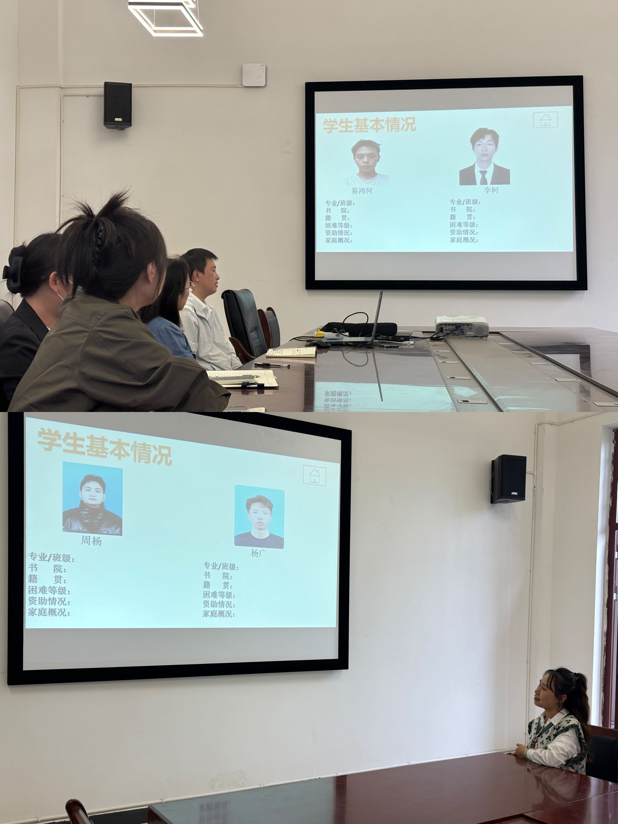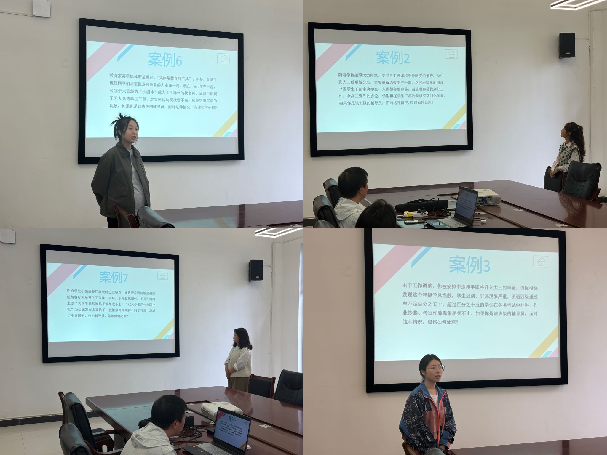 4月22日14时,第二轮比赛在梅若书院207会议室展开,本轮设置“学情知识答题”与“案例解析”两大环节,王琳、杨铭、李珊珊、何欢四位辅导员为大家作了很好的呈现。在“猜猜我是谁”环节中,四位老师根据学生姓名,陈述学生基本信息、困难等级、学生籍贯、获评奖助和家庭情况,旨在明晰辅导员在日常工作中对学生情况的掌握程度,复盘前期的资助育人工作。
