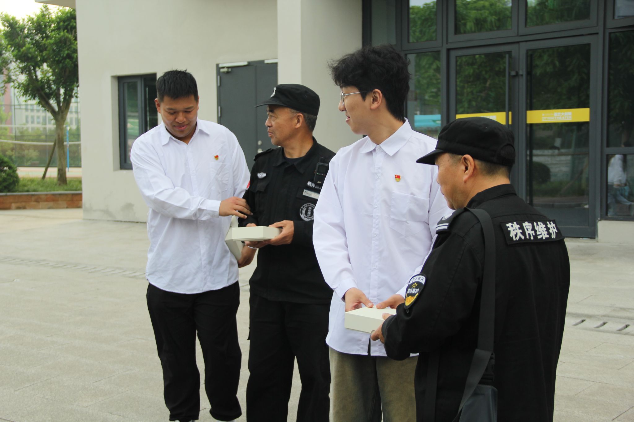 劳动绘就幸福底色,奋斗铸就时代丰碑。在劳动节来临之际,綦江校区学生党支部与各位党员携手,手提满载温情的慰问物资,深入校园各个角落,为那些在平凡岗位上书写不凡篇章的劳动者们送去节日的关怀与敬意。他们将心意传递至每日用扫帚丈量校园洁净的环卫工人手中,致敬这群以簸箕为笔、以街道为纸的“校园美容师”,更将关怀带给昼夜坚守、用责任筑牢安全防线的安保团队,感恩这群以岗为家、以身为盾的“平安守护神”。学生党员诚挚地向他们致以劳动的问候,以党员模范弘扬劳动精神,以党员光辉引领实践发展,以党员劳动为笔,以汗水为墨,书写属于自己的精彩篇章。