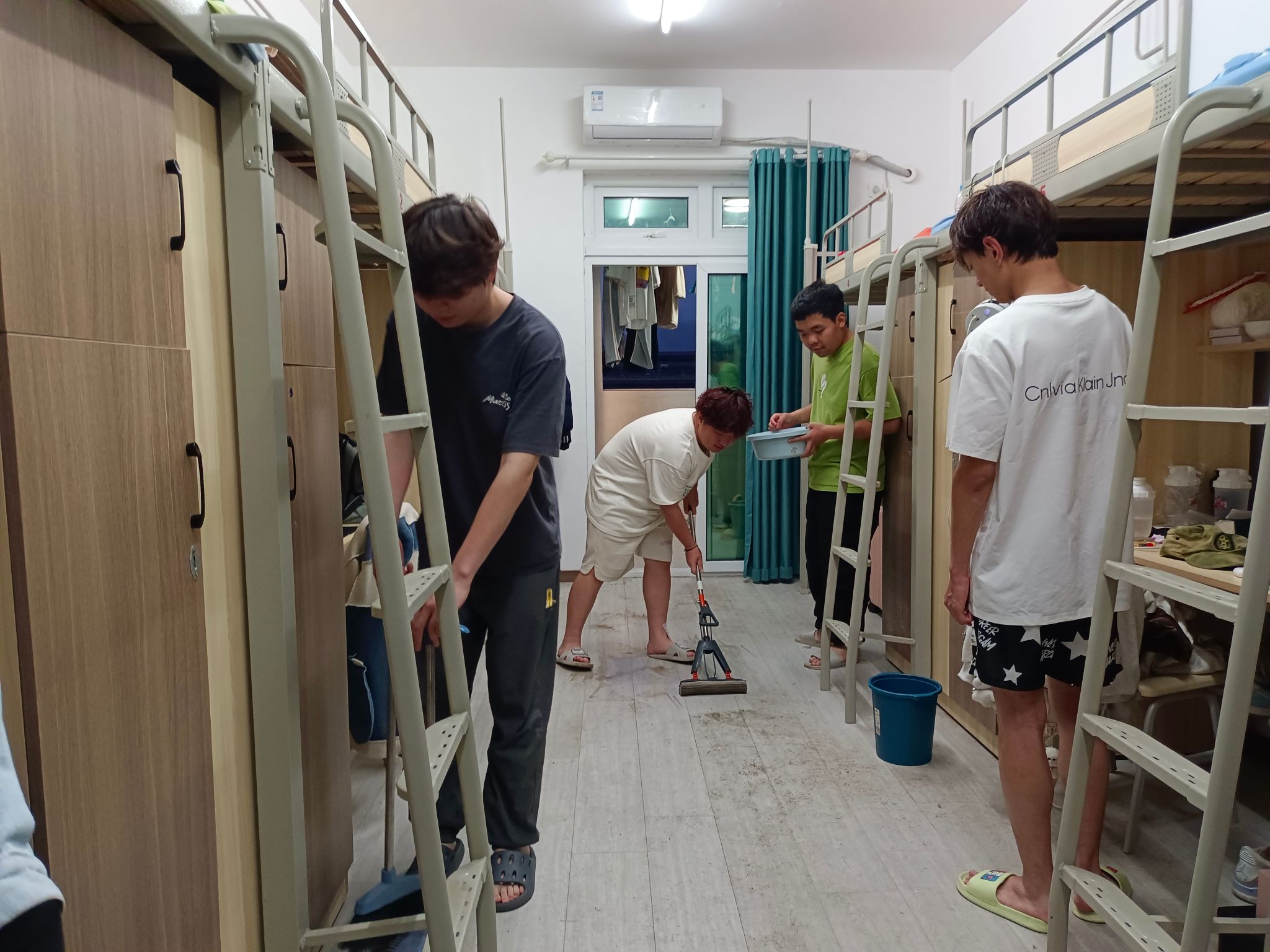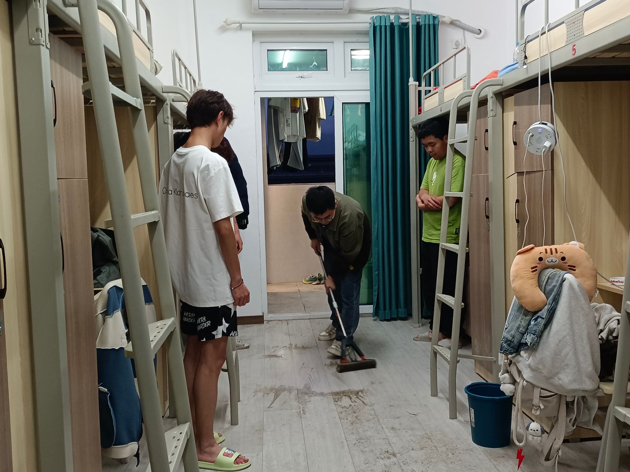 查寝时,学工副院长周俊发现地面不整洁、杂物堆积的寝室,二话不说拿起拖把示范起来。“先扫灰,拖把别太湿,从角落开始按顺序拖,顽固污渍用清洁剂。”他边操作边耐心讲解。看着原本脏乱的地面很快变得洁净明亮,一旁围观的同学小声感叹:“原来拖地还有这么多讲究!”示范结束,周院长温和地说:“宿舍是咱们共同的家,每天花几分钟收拾,住着舒服,心情也舒畅。”这番话让大家心里暖暖的。在院长的带动下,同学们主动帮忙整理物品,查寝现场满是齐心协力打造温馨宿舍的温馨画面。