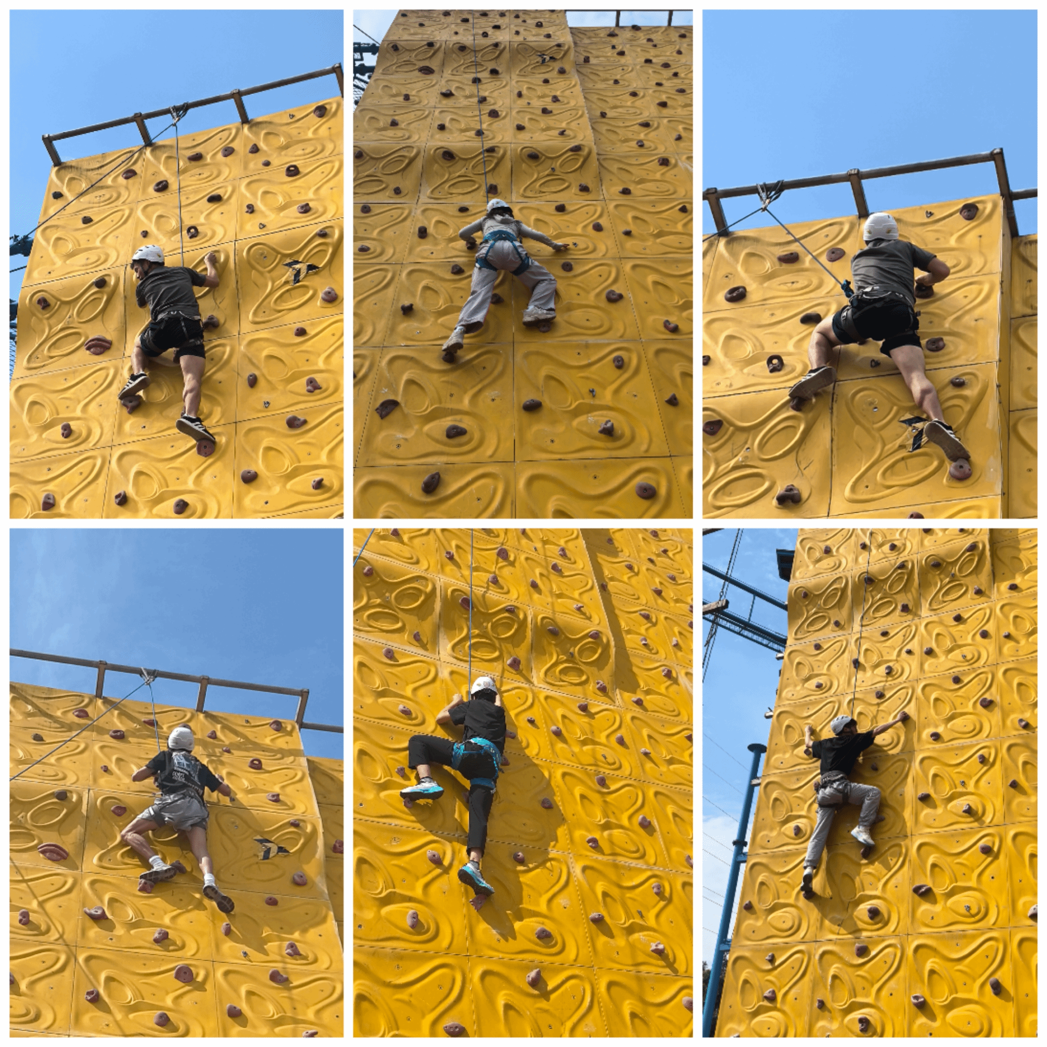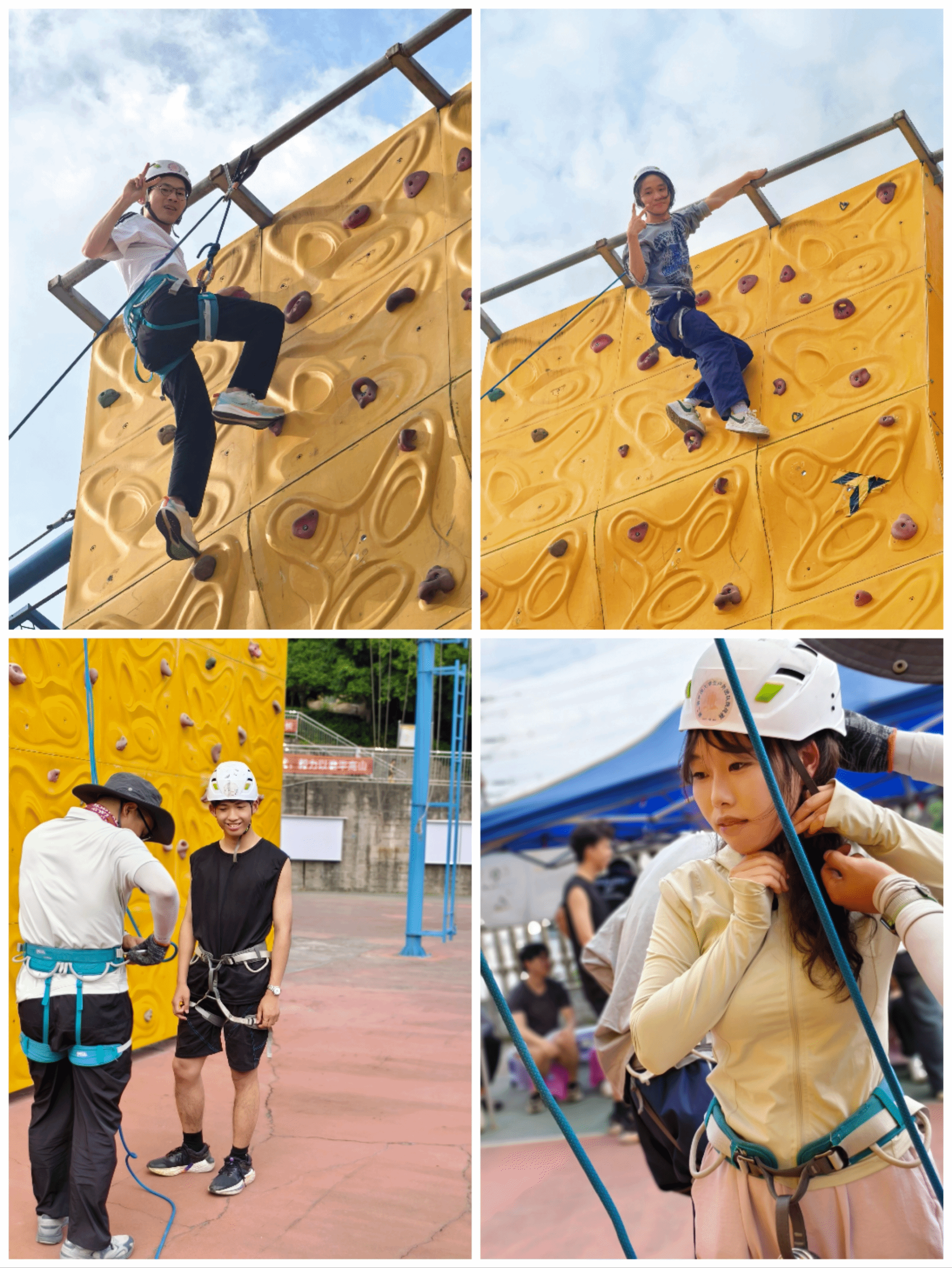 面对8米高的岩壁,高空攀岩挑战正式拉开帷幕。隆巍老师引入军事作战思维,指导团队制定“侦察-支援-突破”战术:由经验丰富的退伍军人担任“侦察兵”,分析岩壁支点;学生干部发挥组织协调能力,组建地面支援组,通过手势信号传递路线信息;体能充沛的队员主动承担“先锋”角色,为后续攀登者固定安全绳。攀登过程中,多次出现队员体力不支的情况,地面团队立即启动“能量补给”方案,通过节奏口号提振士气,这一过程不仅展现了个体突破极限的勇气,更诠释了“分工明确、优势互补、相互托举”的协作真谛。