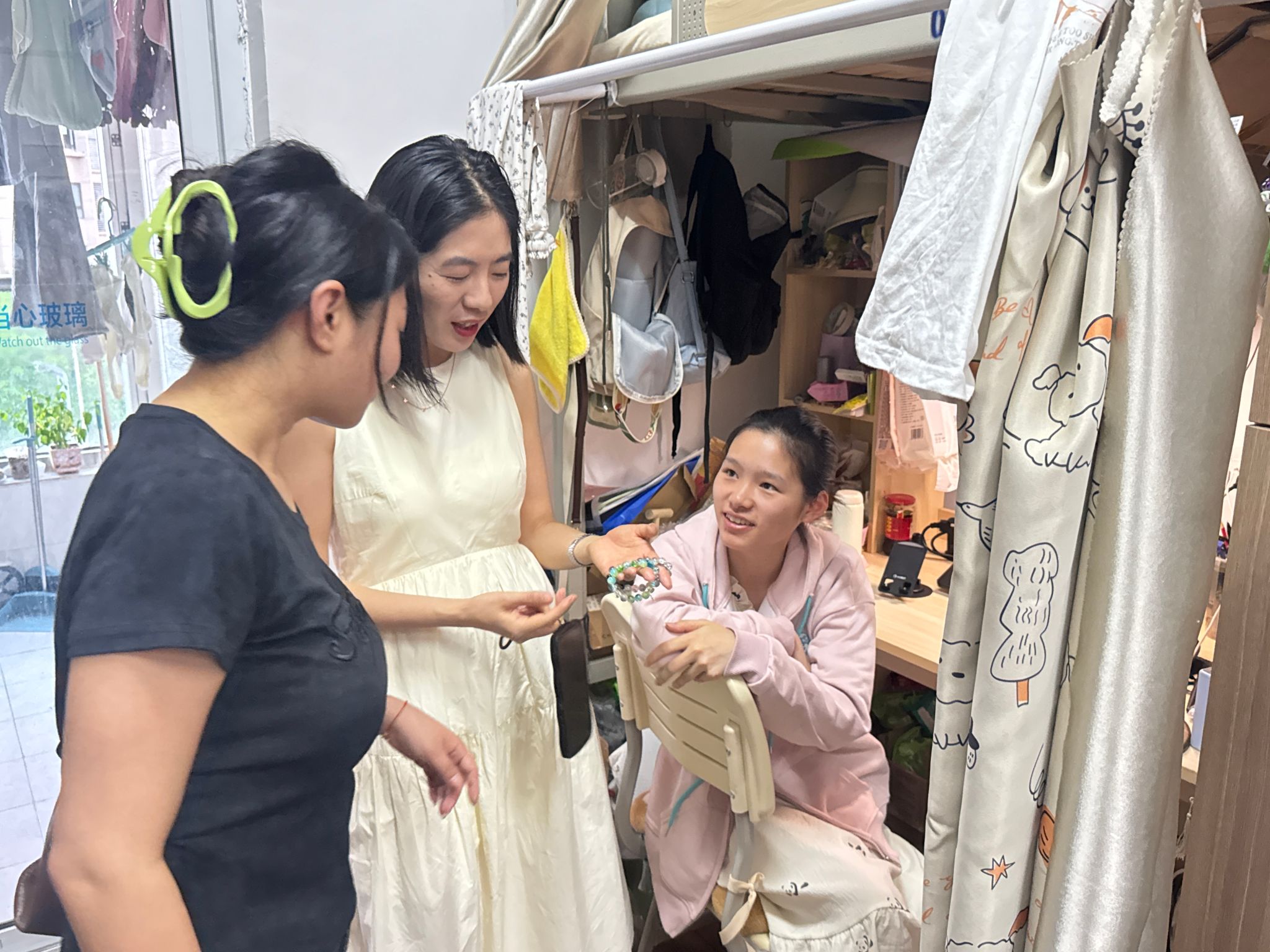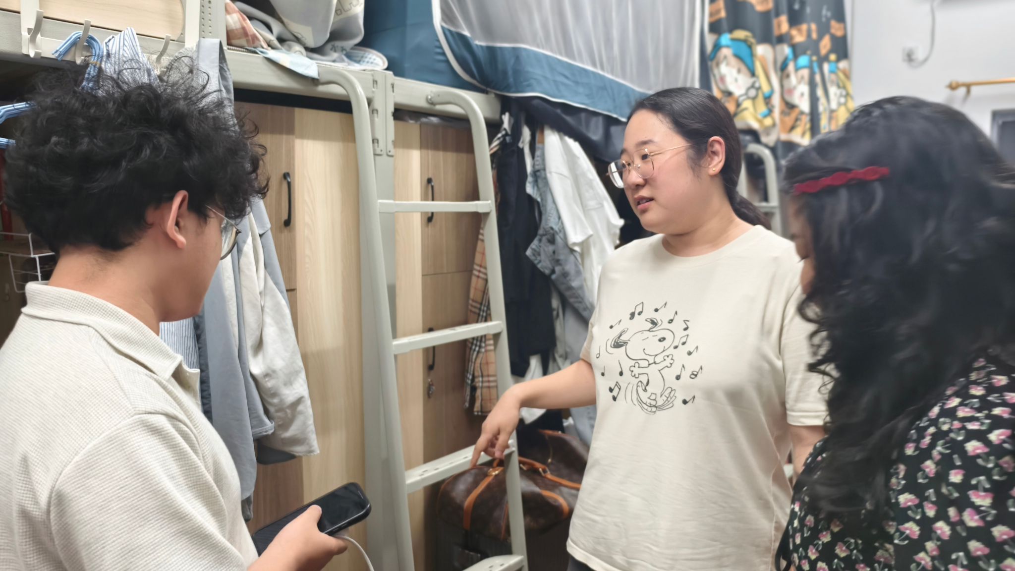 检查过程中,窗明几净的寝室环境令各位老师眼前一亮。“你们寝室总能保持如此整洁,有什么秘诀吗?”老师笑着询问。同学们相视一笑,指向墙上的奖状:"我们实行奖励制度,对值日认真、物品摆放规范的同学给予奖状表彰。"镜头聚焦处,一张手绘奖状映入眼帘,新颖的形式引得老师们会心一笑。"这个创意很好!"老师们一致赞赏该制度既能调动学生积极性,又为寝室生活增添了仪式感。在检查过程中,老师们不仅细致查看了卫生状况,还亲切询问同学们的近况,就学业规划、兴趣爱好等话题展开交流,现场始终洋溢着温馨融洽的氛围。