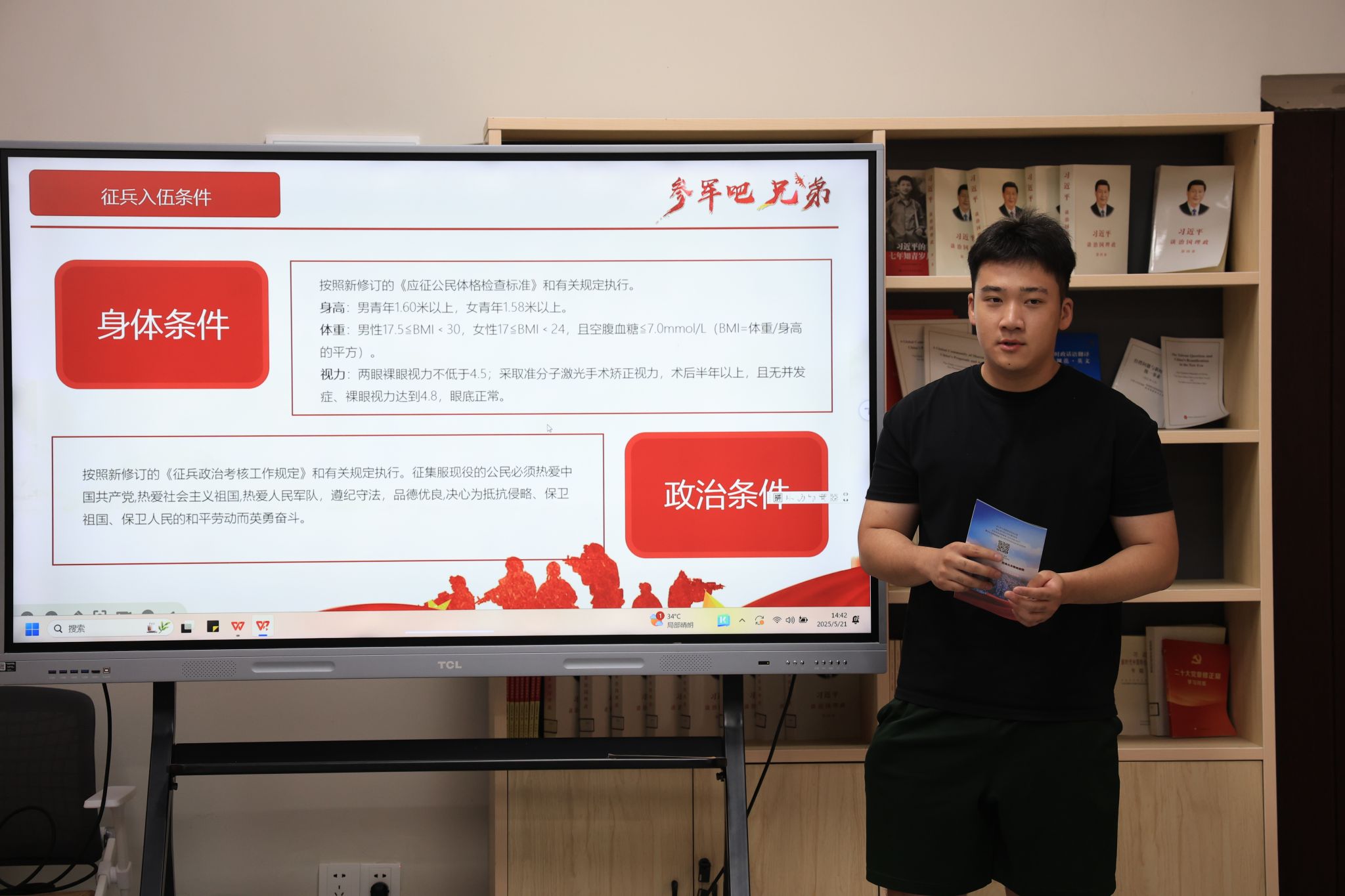 江旭东老师在开场就细致地为同学们讲解征兵要求,从年龄限制到身体素质标准,从学历条件到政治审查要点,每一项内容都结合具体案例进行说明。“在场有一些同学是戴了眼镜的,可能会担心视力不达标不能入伍,其实现在激光矫正手术符合规定,提前做好矫正通过体检也是没问题的。” 江旭东老师用这样通俗易懂的例子,让同学们对原本模糊的标准有了清晰认知,也为有意参军的同学指明了努力方向,以便他们提前做好入伍规划。