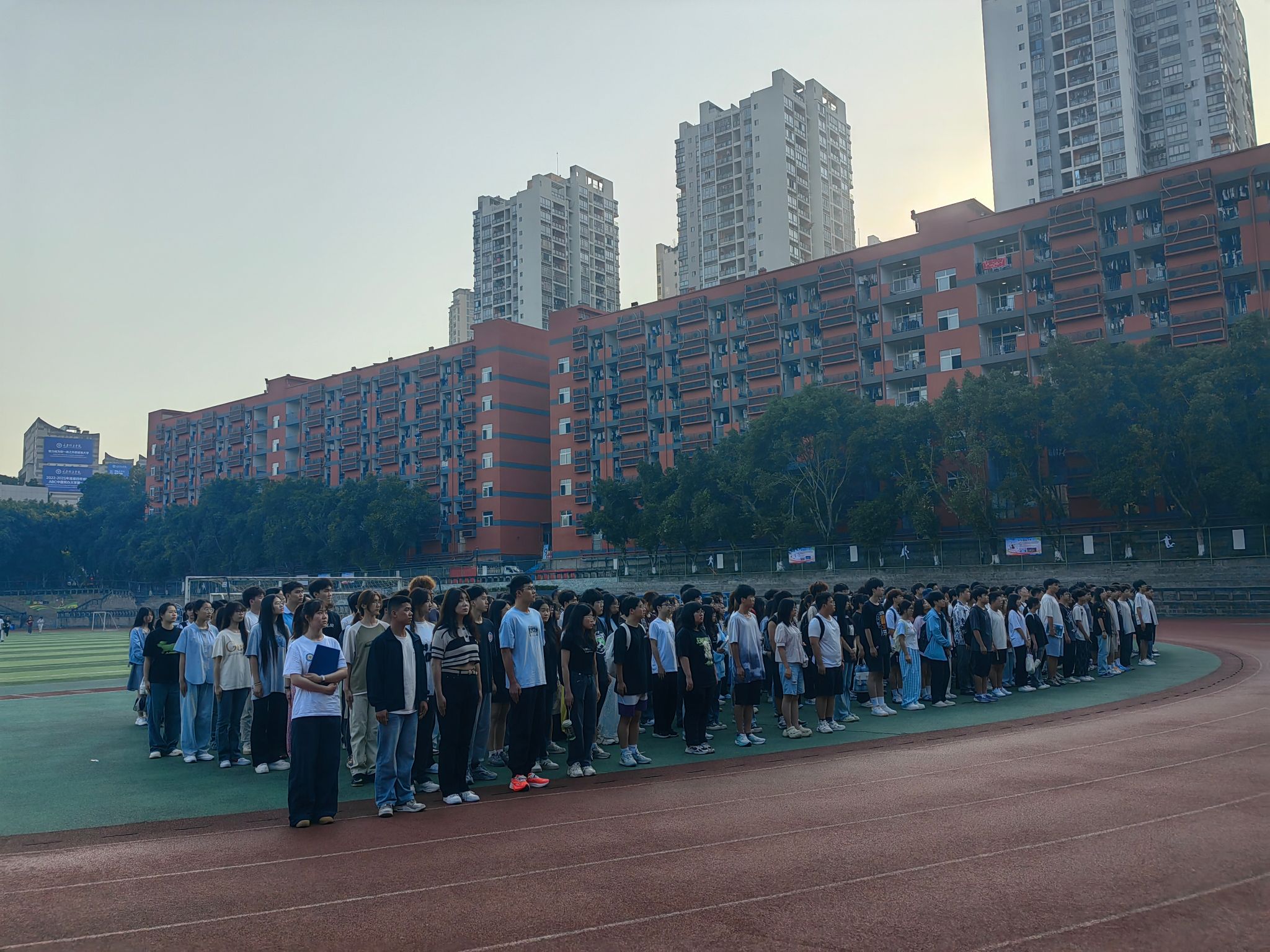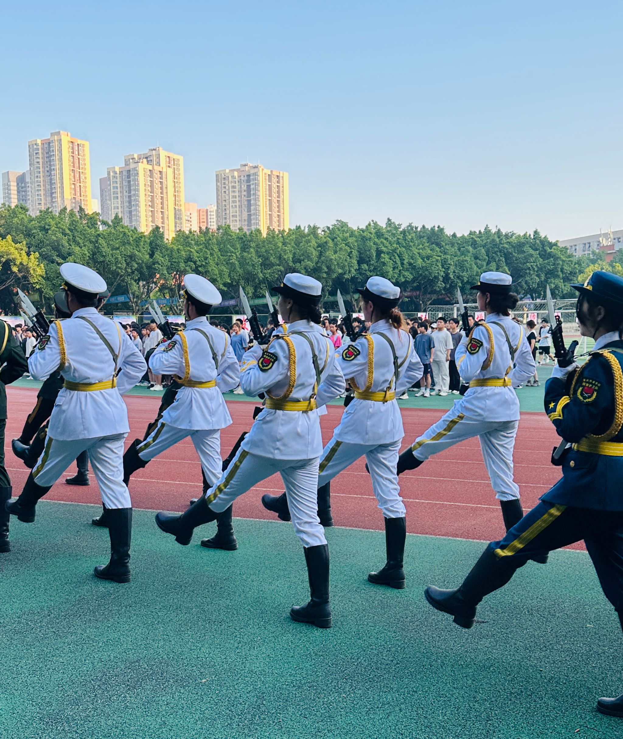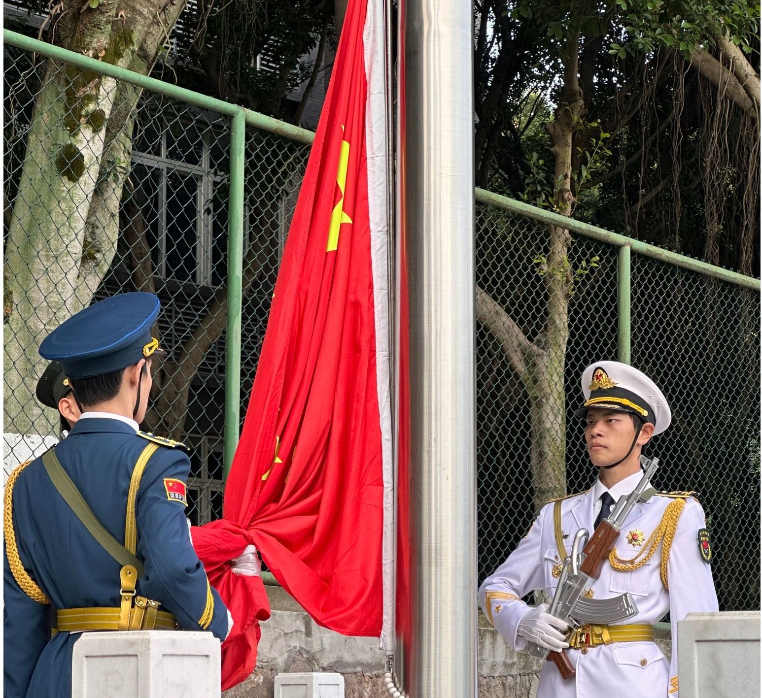 7:10,升国旗仪式正式开始。迎着朝阳,国旗护卫队踏着铿锵有力的步伐,庄重地将五星红旗护送至升旗台。随着雄浑的国歌奏响,五星红旗在轻风中缓缓升起,全体师生肃立,伴随着旋律齐声高唱国歌,向徐徐升起的旗帜行以崇高的注目礼。嘹亮的歌声回荡在操场,鲜艳的红旗映照着青春脸庞,爱国之情在每个人心中升腾,传递着身为中华儿女的骄傲与守护祖国的坚定信念。