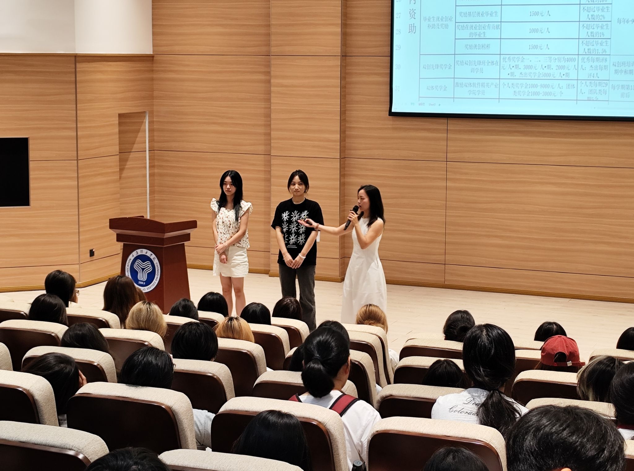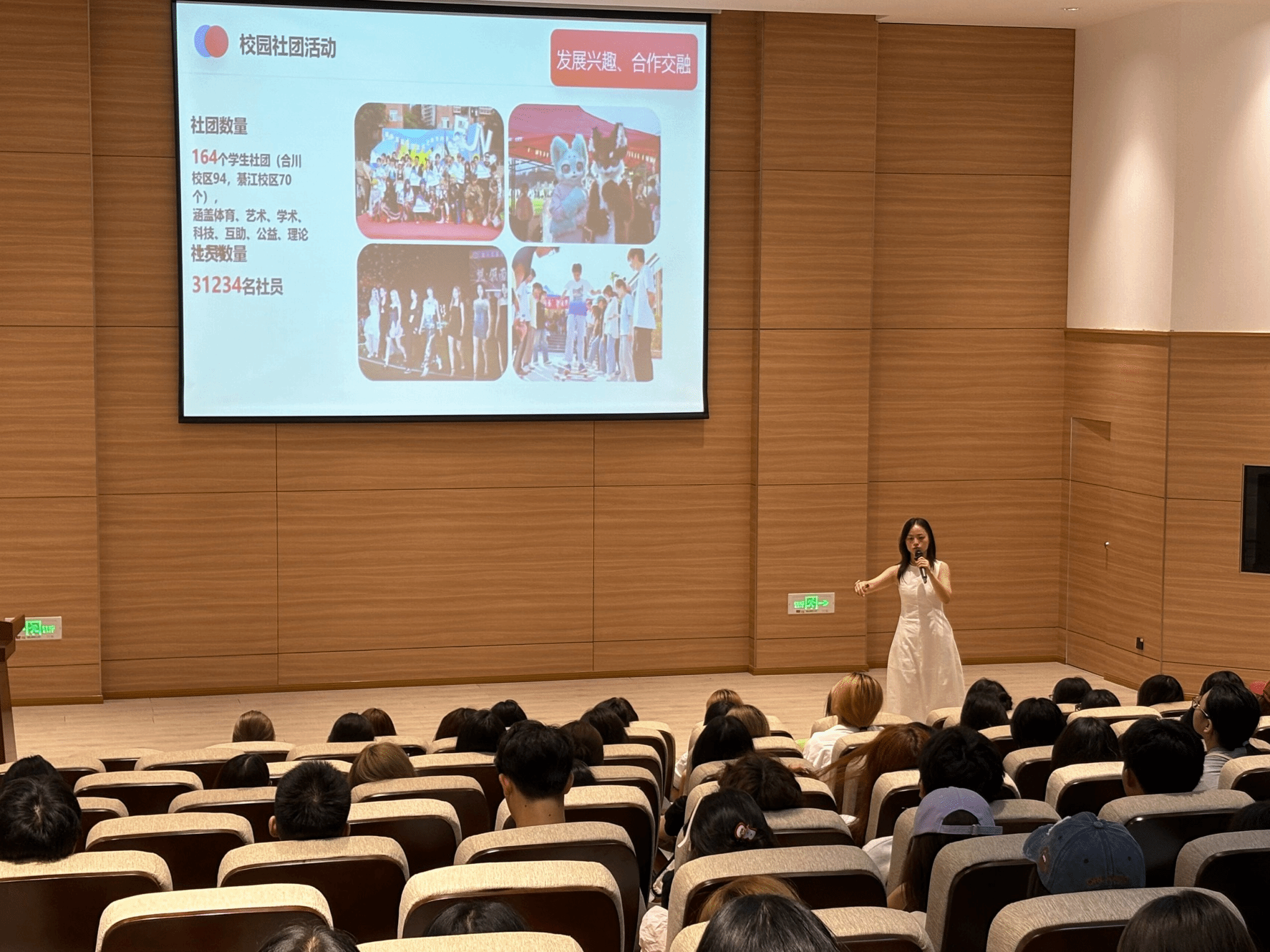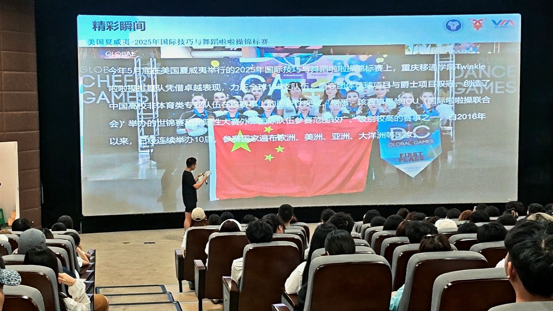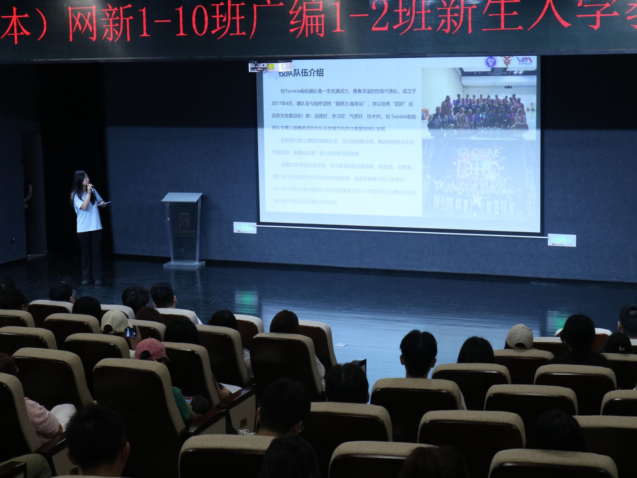 为增强入学教育的吸引力与感染力,学院特别邀请Twinkle啦啦操排舞队、创意写作学院、校游泳队等师生代表进行现场宣讲与展示。其中,Twinkle啦啦操队分享了2025年国际锦标赛双冠的辉煌战绩,号召新生积极参与体育活动,强健体魄、磨砺意志;创意写作学院房宙老师通过讲述人物典型、展示作品,激发新生的艺术兴趣与表达欲望;教师代表韩鹏伟老师分享了专业学习体验与成长历程,为新生树立可感可及的榜样力量。