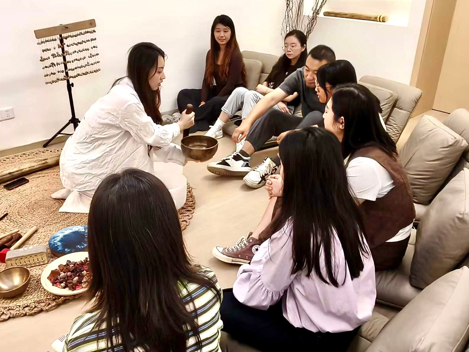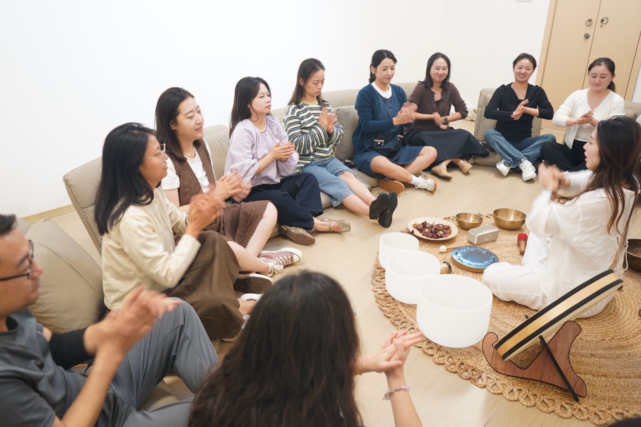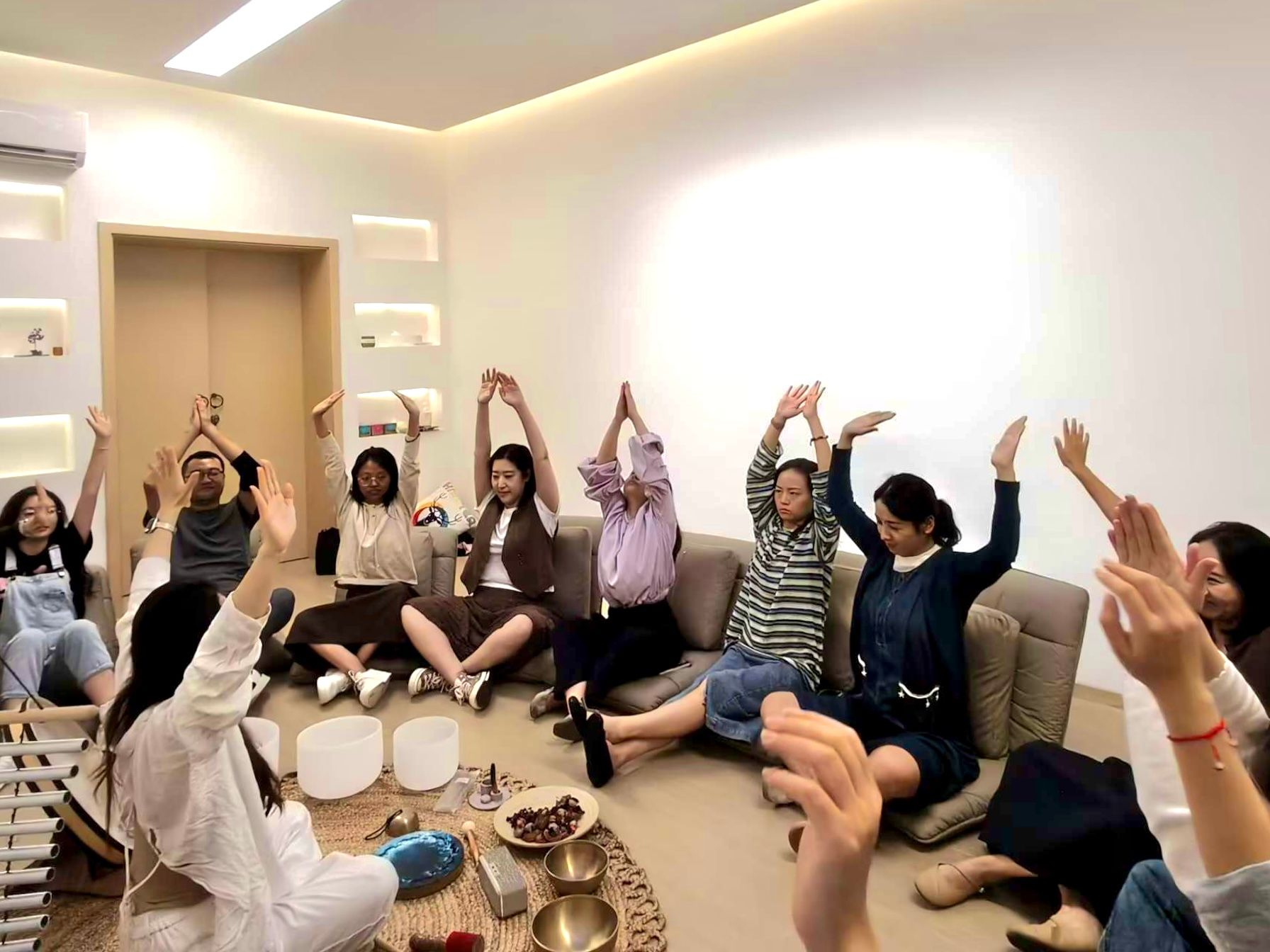 随着颂钵声缓缓响起,疗愈体验进入核心环节。老师们舒适地躺在沙发上,闭眼放空。轻柔绵长的声波像一双温柔的手,轻轻抚过身心——紧绷的肩膀慢慢舒展,急促的呼吸渐趋平缓,不少老师甚至在这治愈的声响中悄然入眠。现场静得能听见呼吸声,唯有颂钵声缓缓流淌,将一天的疲惫悄悄消融。