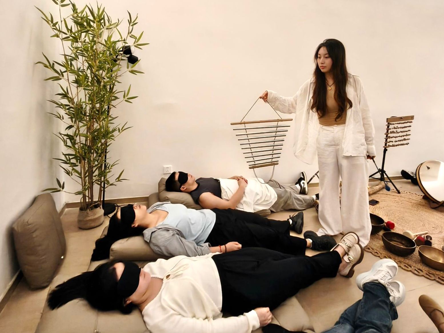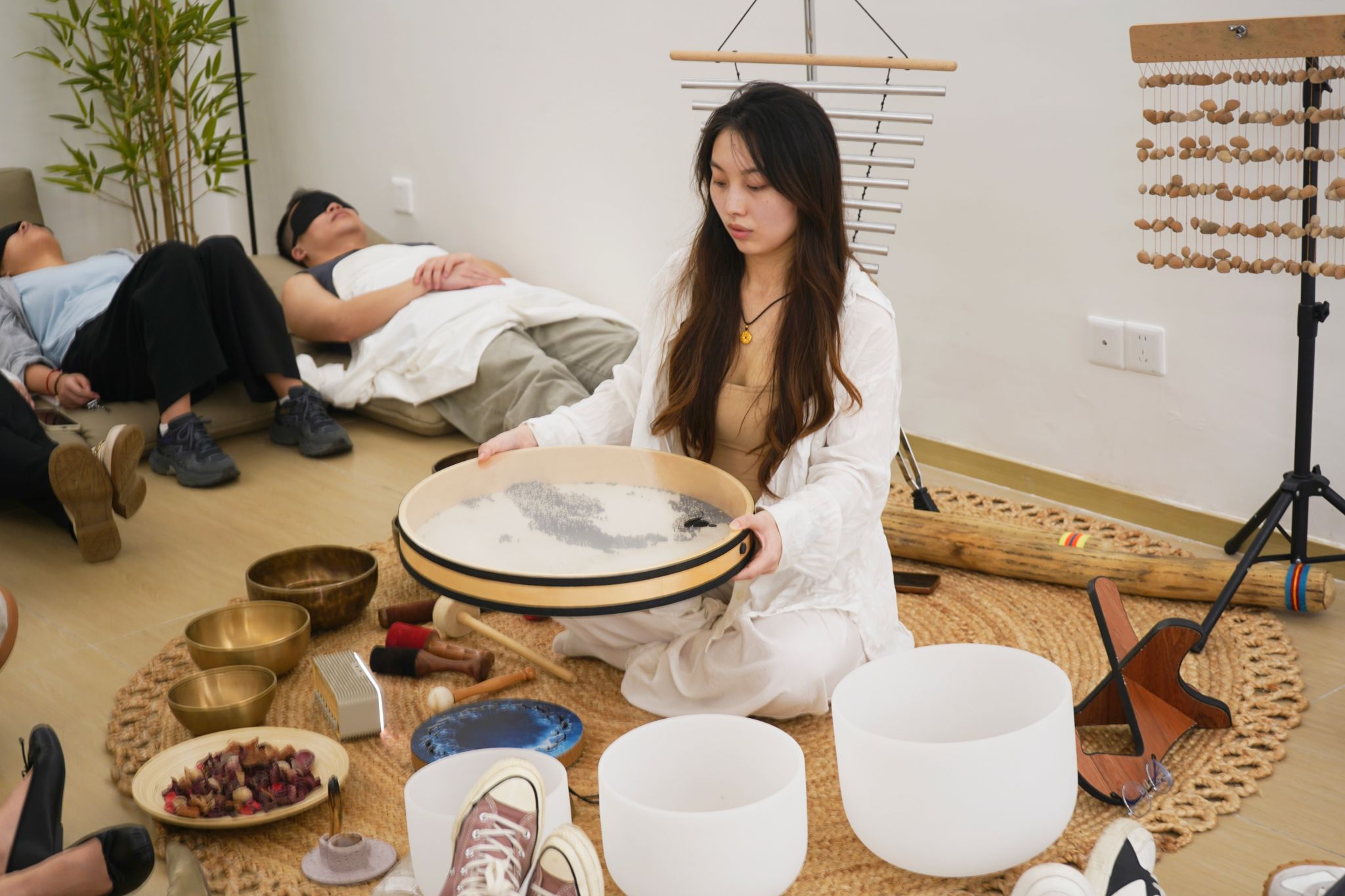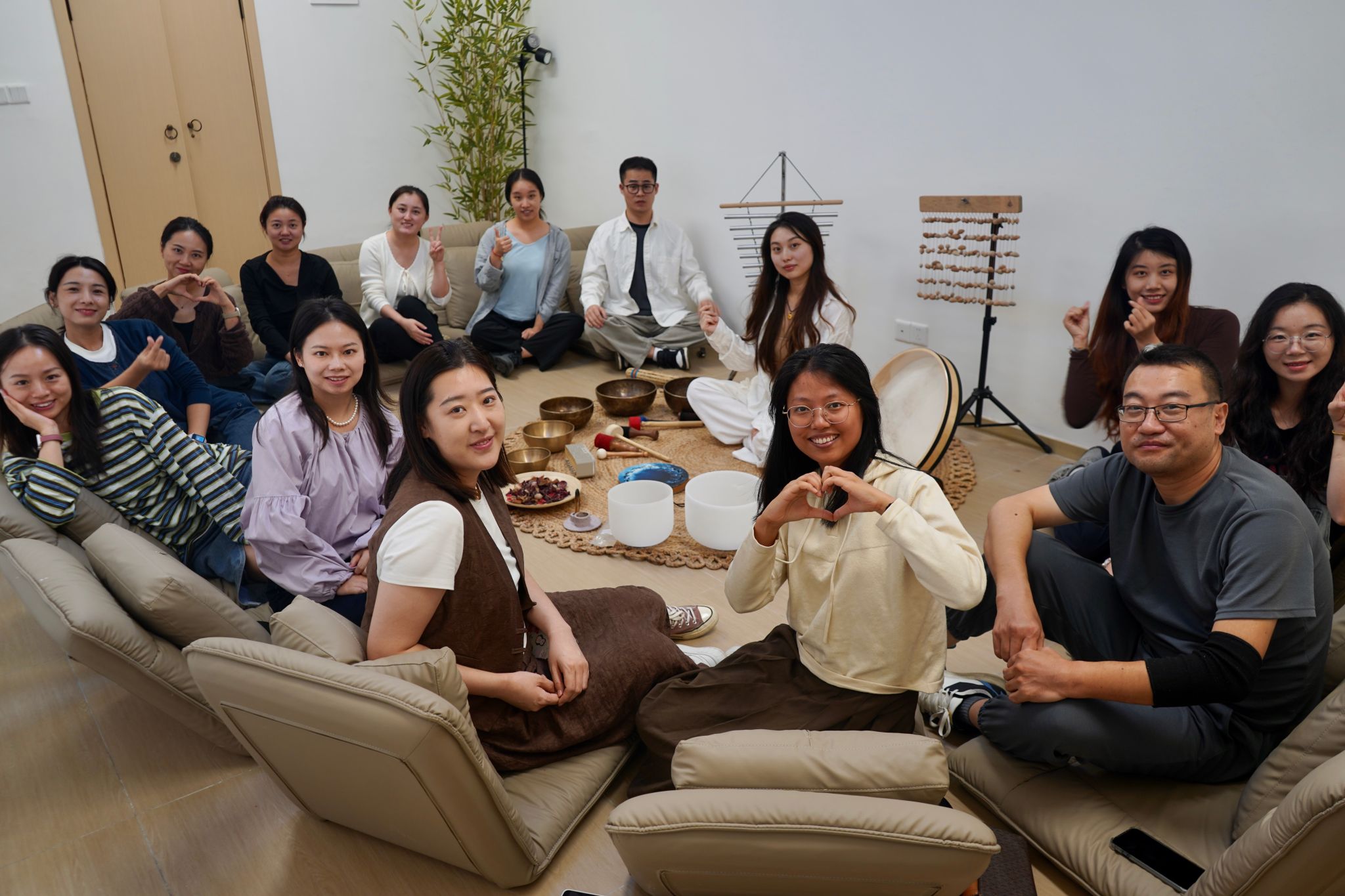 随着颂钵声缓缓响起,疗愈体验进入核心环节。老师们舒适地躺在沙发上,闭眼放空。轻柔绵长的声波像一双温柔的手,轻轻抚过身心——紧绷的肩膀慢慢舒展,急促的呼吸渐趋平缓,不少老师甚至在这治愈的声响中悄然入眠。现场静得能听见呼吸声,唯有颂钵声缓缓流淌,将一天的疲惫悄悄消融。