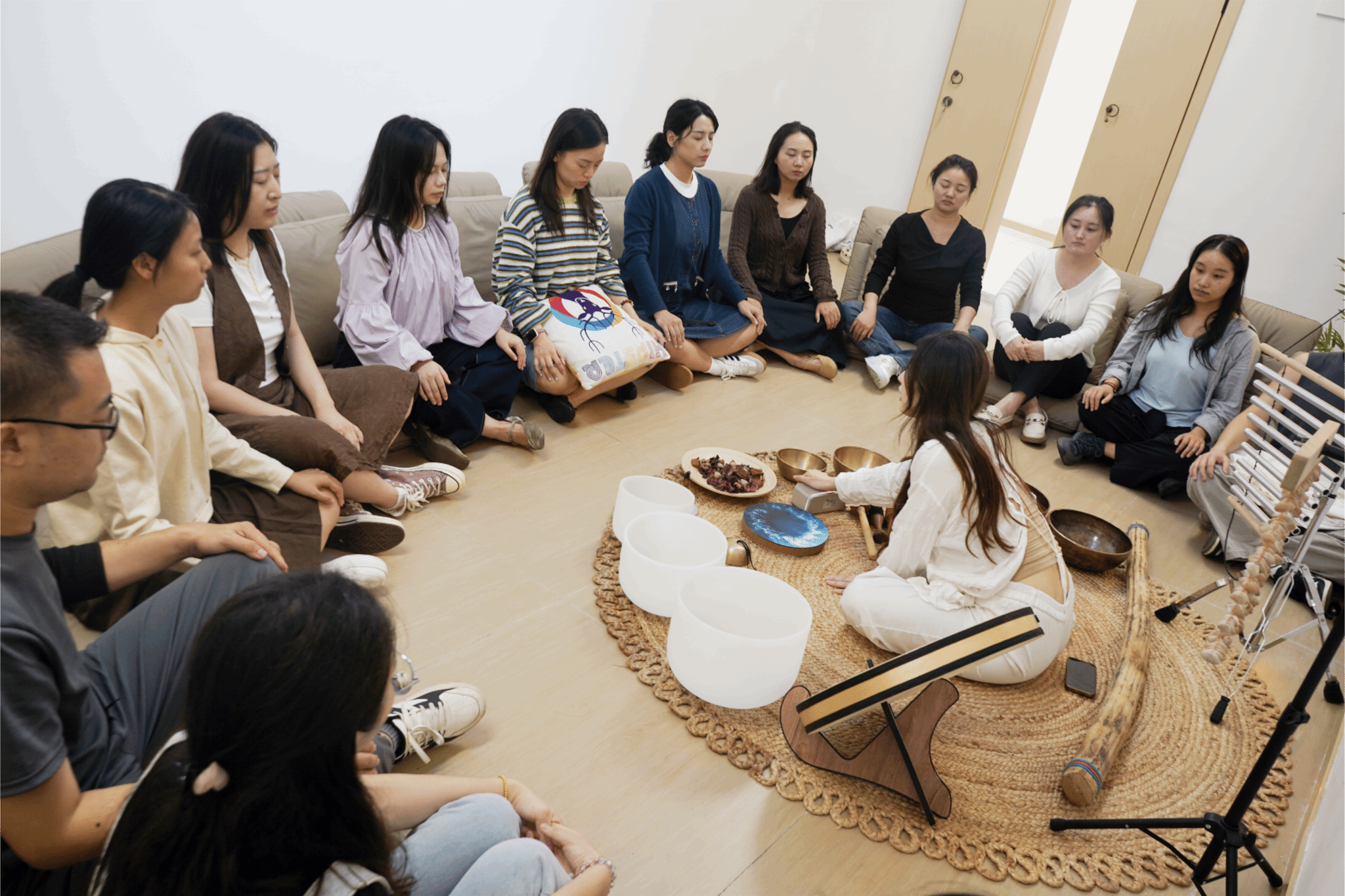教育工作繁杂细碎,辅导员群体常承载多重压力。为帮助大家卸下疲惫,疗愈身心,以更饱满的状态投入育人工作,2025年9月26日下午14点,艺术传媒学院联合鱼城书院,组织全体辅导员赴鱼城书院1号楼冥想小屋开展颂钵疗愈体验活动。活动特别邀请到鱼城书院学生发展导师、颂钵疗愈师赵晨老师带领,用沉浸式音疗为辅导员们送上一份“心灵舒缓礼”。