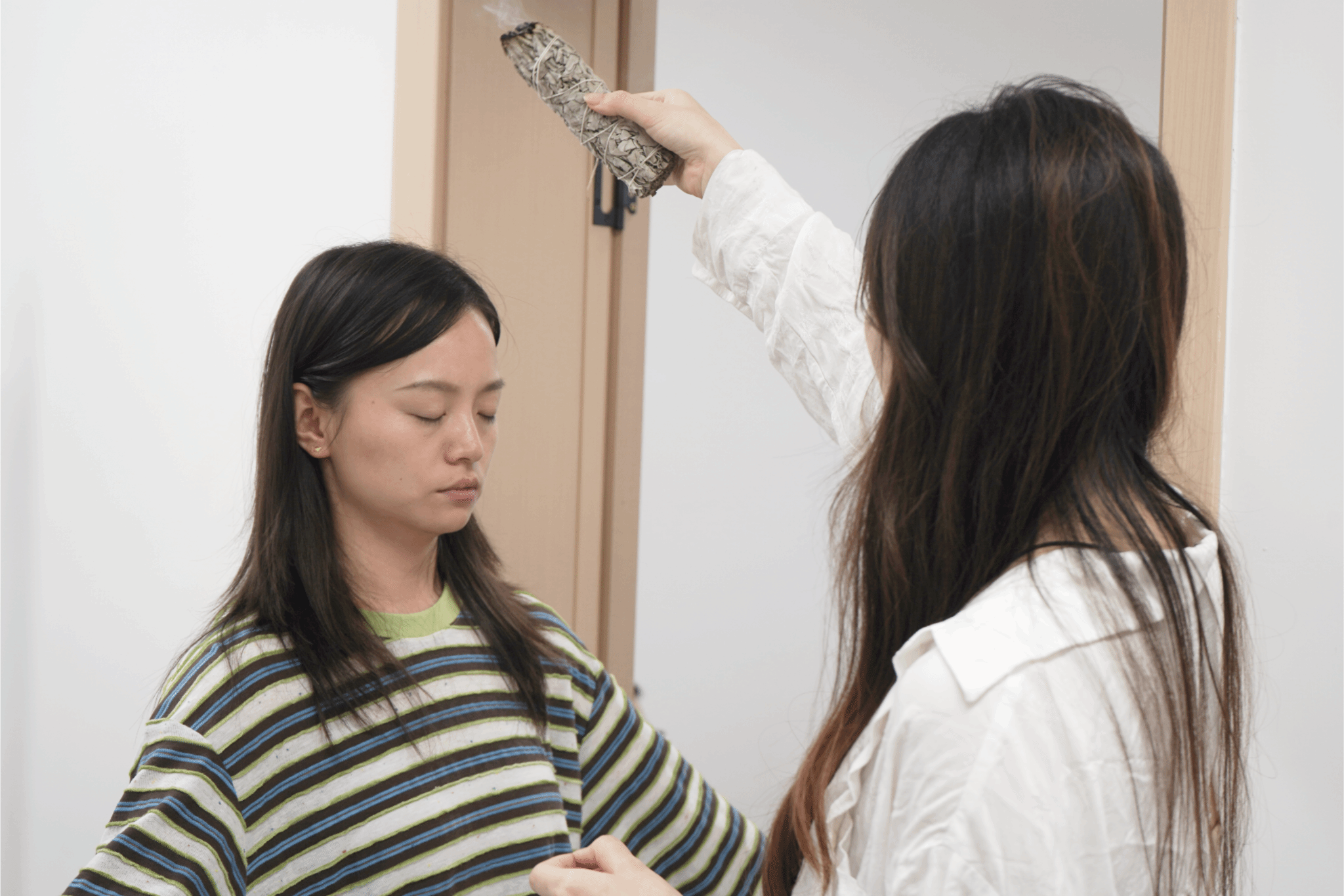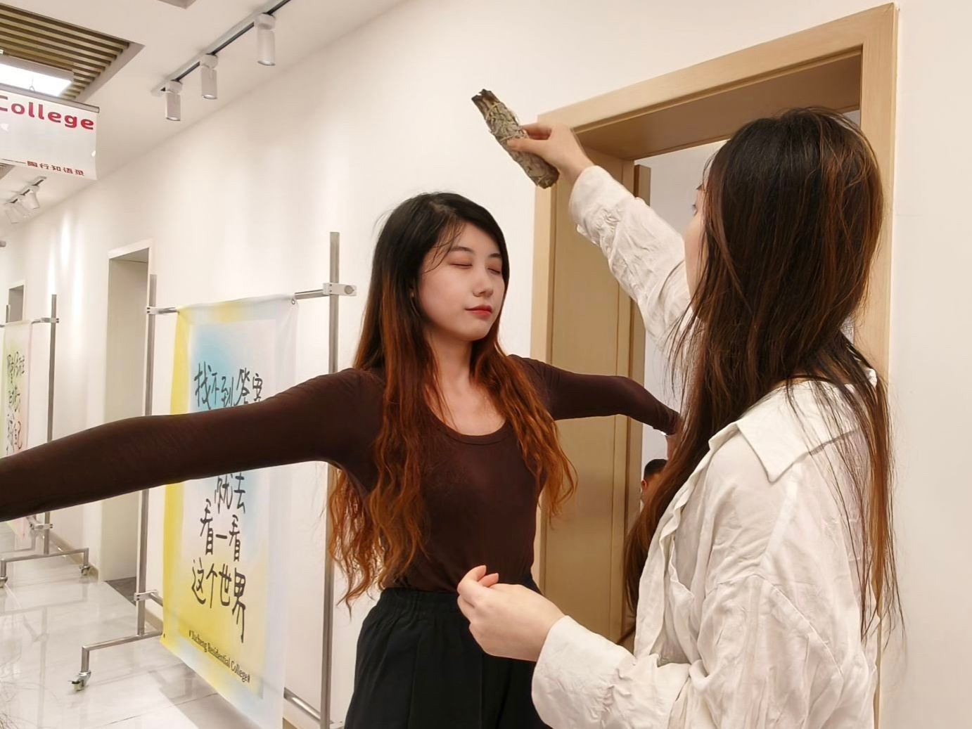活动开场便满溢仪式感。赵晨老师点燃白色鼠尾草,辅导员们有序列队进入小屋,清新的鼠尾草香气随微风漫过周身。“放轻松,慢慢闭眼,抛开所有烦恼,双手自然打开,让鼠尾草香带走你的疲惫。”她一边手持白色鼠尾草把在老师们身边缓缓移动,一边用温柔的话语引导,让大家在香气与安抚中逐渐沉静下来。