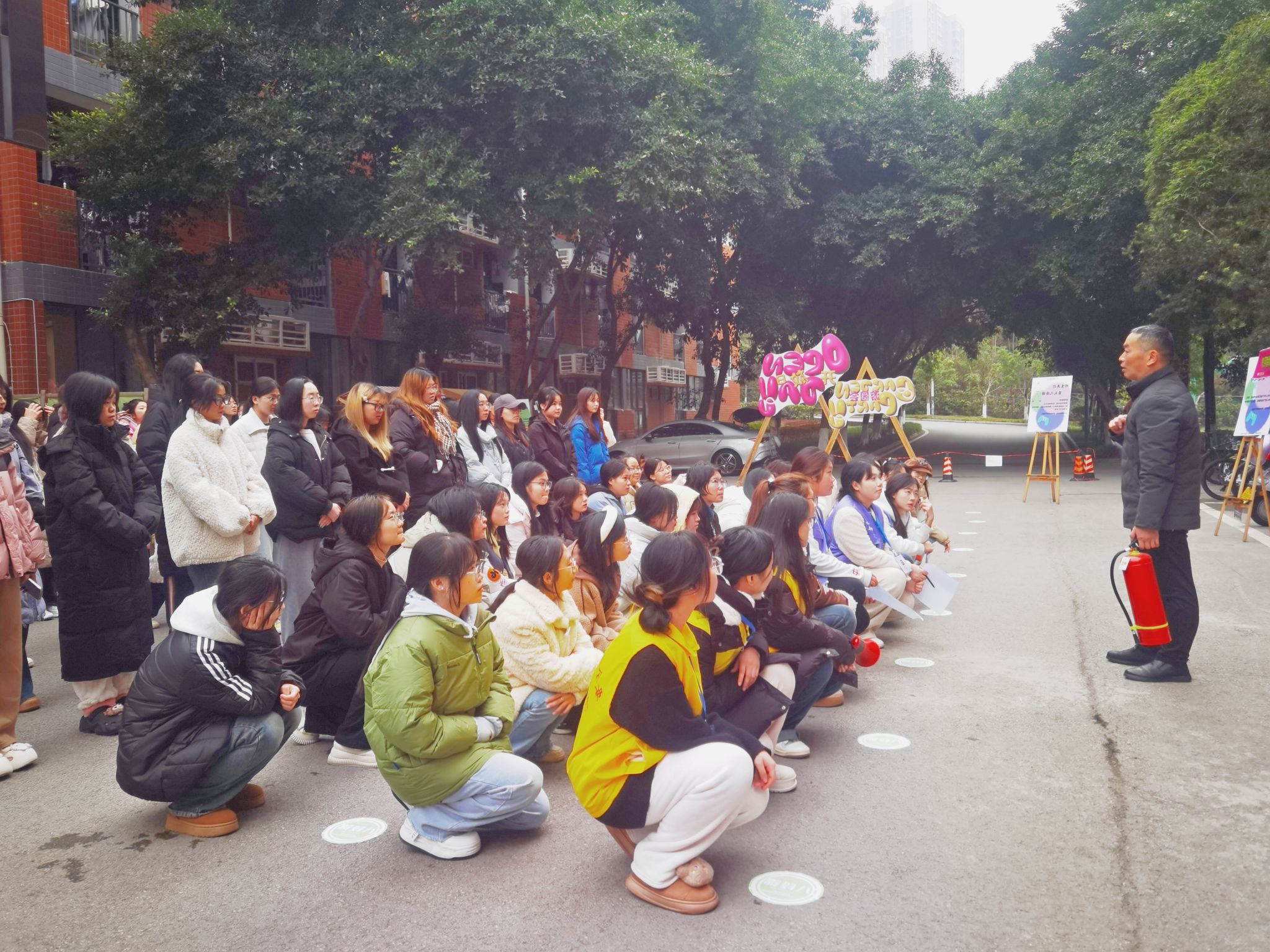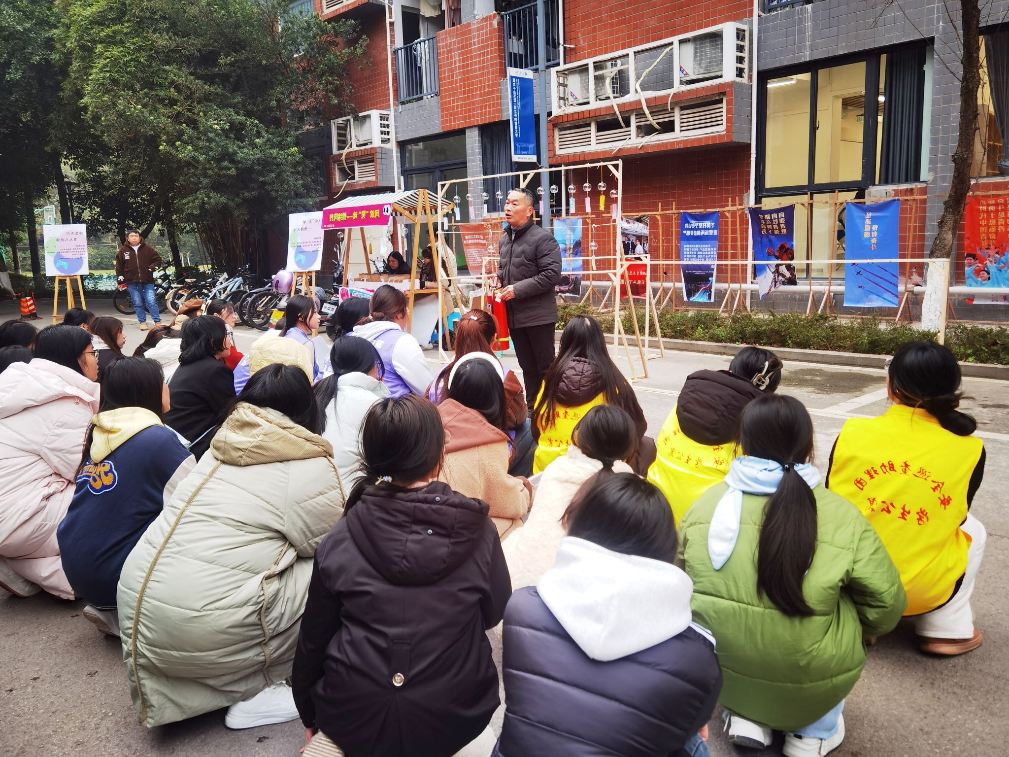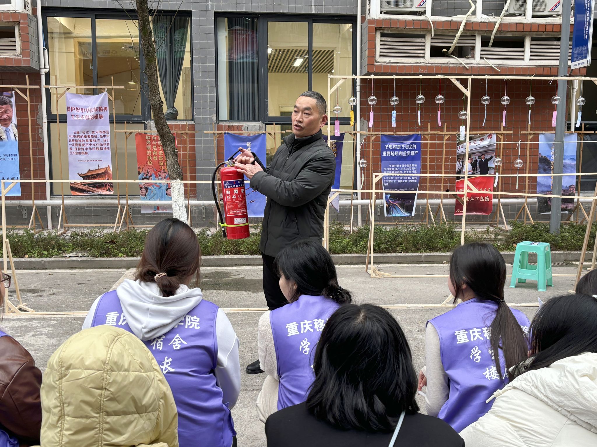 疏散演练正式开始前,宿舍管理中心、保卫处、鱼城书院1号楼内的淬炼商学院以及德国工程学院学生代表于宿舍楼旁空地集合,疏散演练总指挥、保卫处彭洪处长,向同学们讲解灭火器使用技巧和疏散演练的必要性,彭处长讲到本次演练不止适用于火灾,还适用于其他需要紧急疏散建筑物内人员的突发事件,同时强调了火灾逃生中的注意事项、误区、预防等知识。随后,鱼城书院主管老师黄灿给在场人员讲解疏散演练路线,培训结束,学生们返回宿舍等待疏散指令。