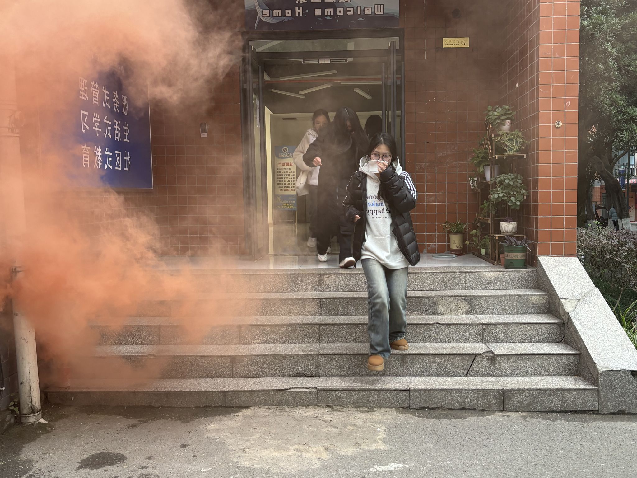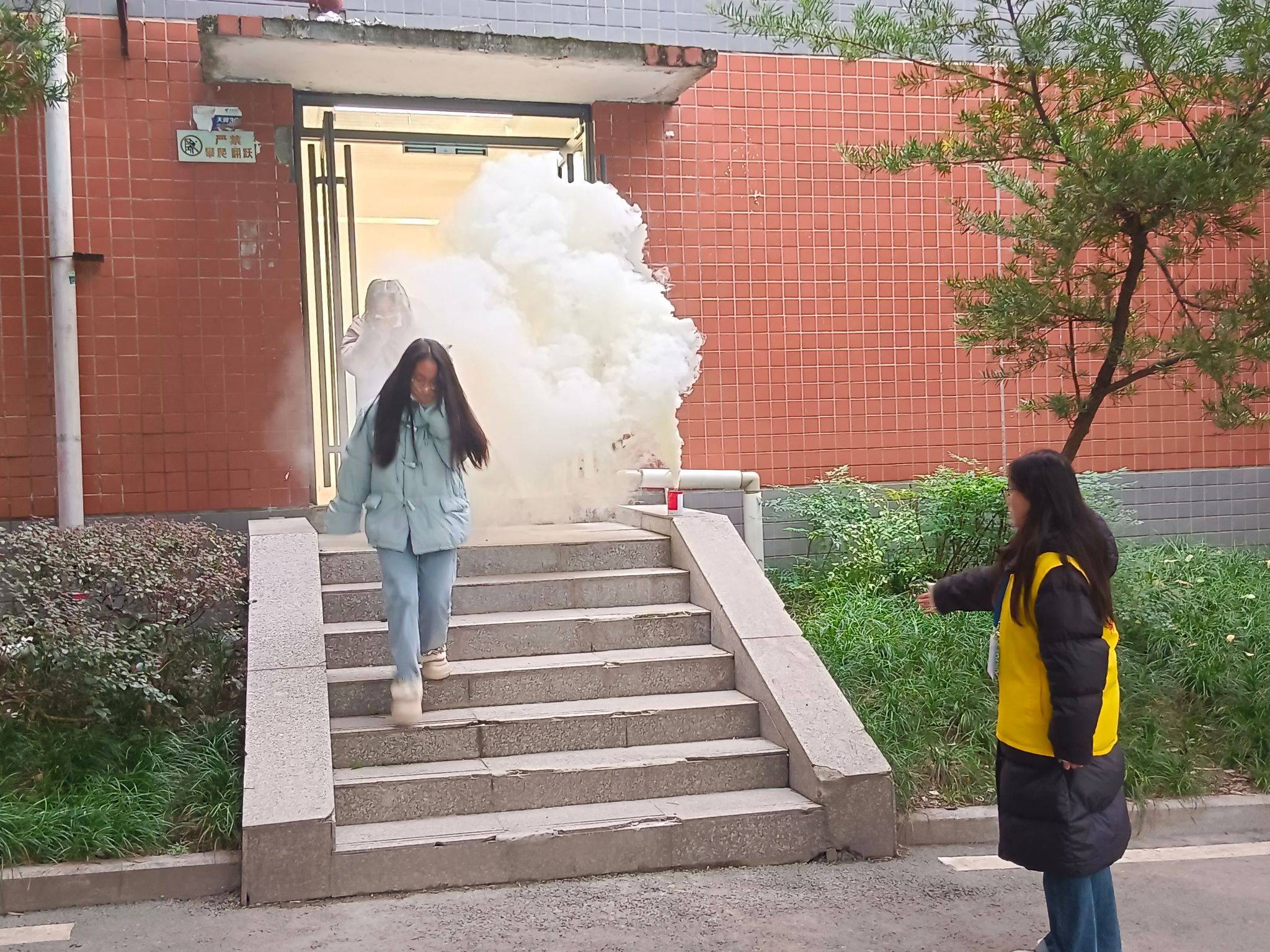 疏散演练正式开始,按预定计划模拟楼栋内失火,随着模拟烟雾升起,彭处长吹响口哨,鱼城书院1号楼内的人员在安全巡查助理、楼层长、宿舍值班员的指引下按照预定路线有序撤离,“弯腰伏身、手肘或湿毛巾捂口鼻、扶墙靠边”,疏散期间秩序谨然,无嬉戏打闹、拥挤等发生,2分钟内完成全部疏散并到空地集合,随后鱼城安全巡查助理以及楼层长完成人数清点并向现场总指挥报告。所有人员安全到达集合地点,演练总指挥彭洪处长对本次疏散演练进行总结,对同学们的表现给与肯定。