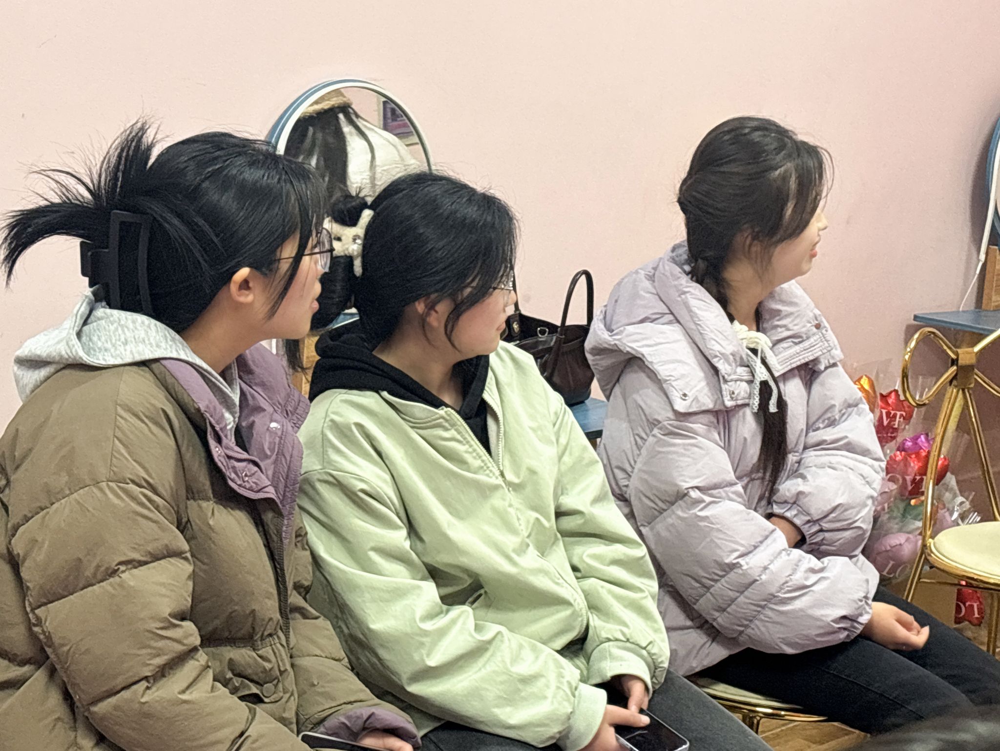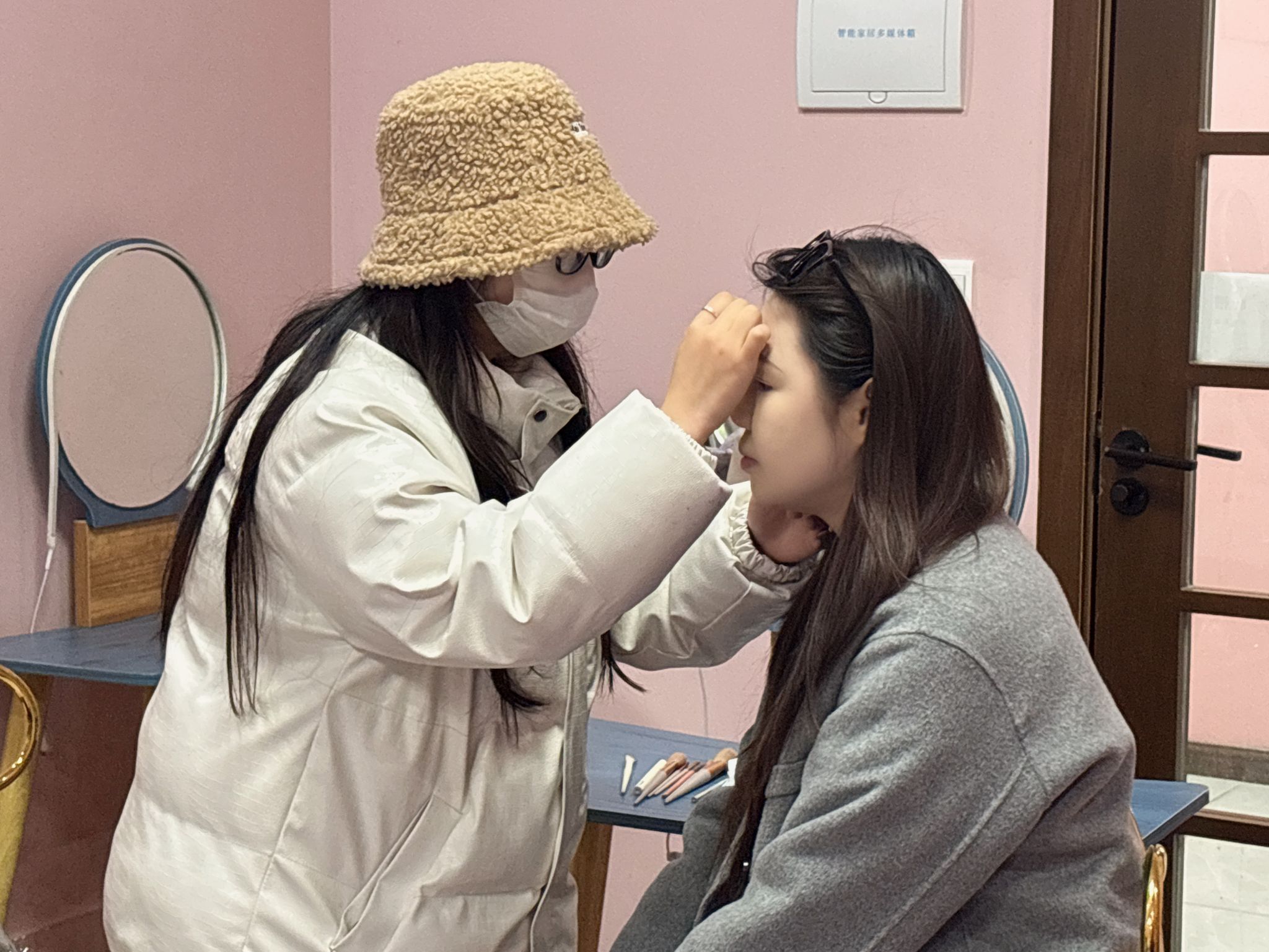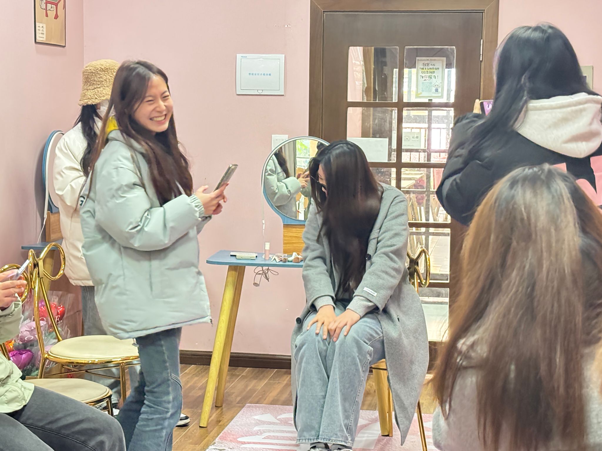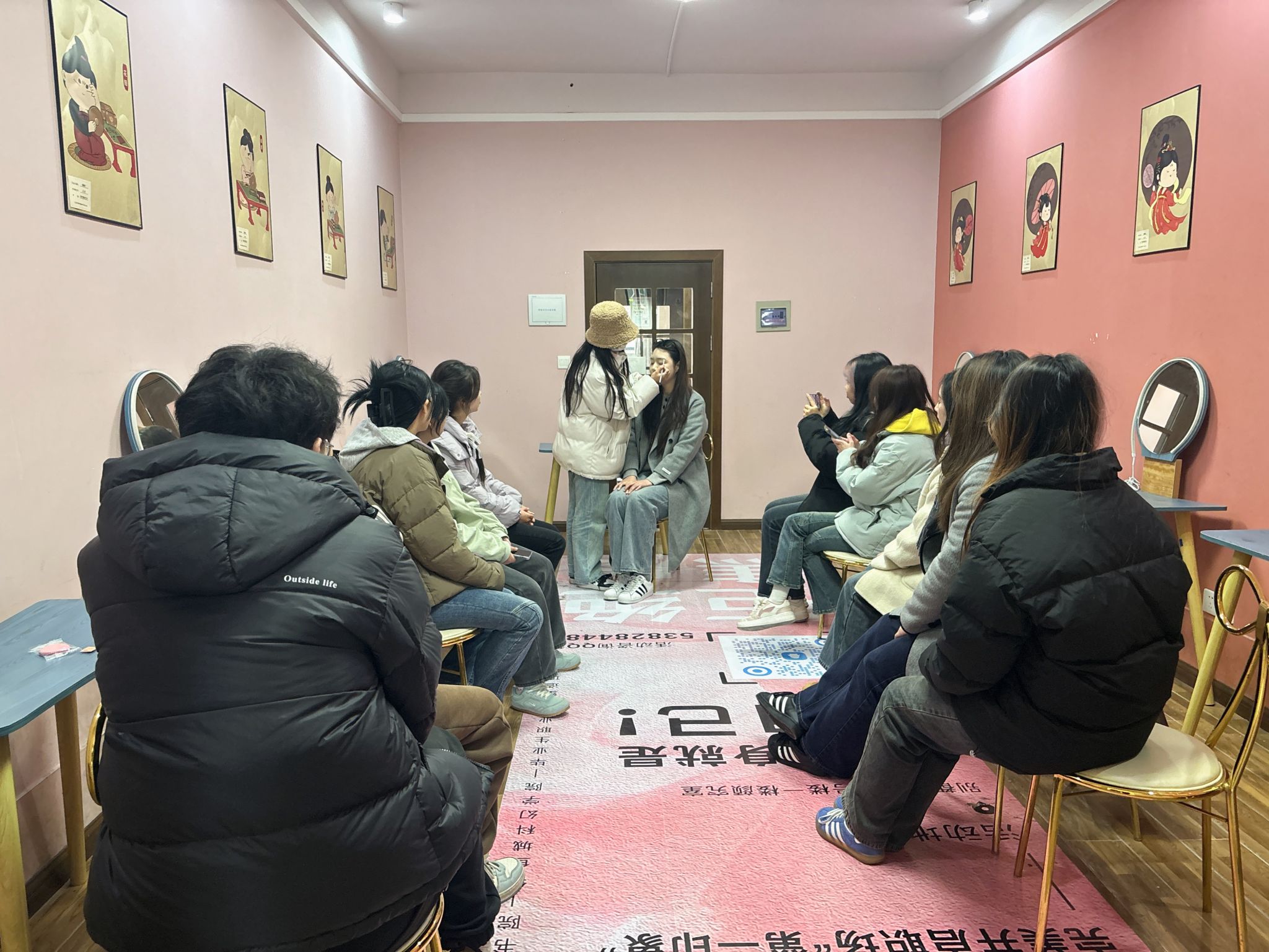 紧接着,同学们两两一组,进入互助化妆环节。你为我描眉,我为你涂唇,镜前的她们专注而认真,手中的化妆刷仿佛化作画笔,勾勒出青春最美的模样。美妆师与志愿者们穿梭其间,耐心解答疑问、纠正手法,确保每一位同学都能在互动中学习与成长。这一刻,美妆不再是简单的技艺,而是女性之间彼此支持、共同成长的温暖纽带。