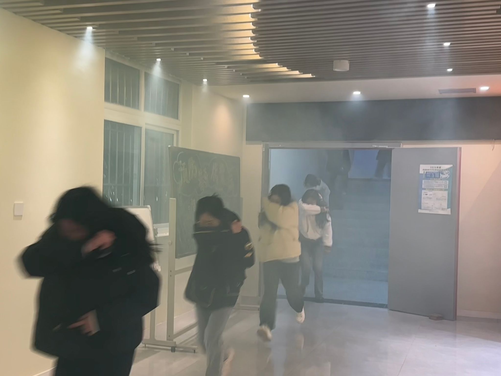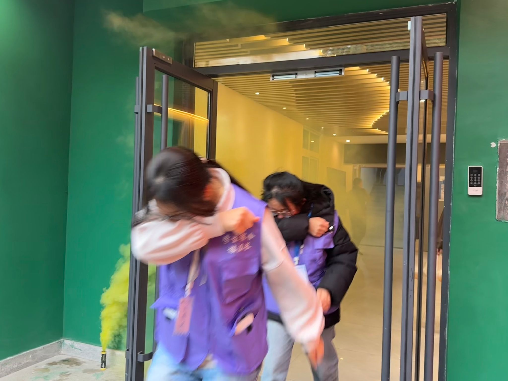 15时35分演练正式开始,保卫处科长郑好与黄兵老师通过释放烟雾模拟学生公寓楼发生“火情”,浓烟迅速蔓延,在彭处长的哨声中,楼内学生在楼层长的引导带领下,用衣袖捂住口鼻,弯腰低姿沿安全通道,快速有序撤离至楼外广场集合点。彭处长对本次同学们的表现给予了肯定与表扬,再次强调了增强安全意识的重要性和掌握正确有效逃生方式的必要性。