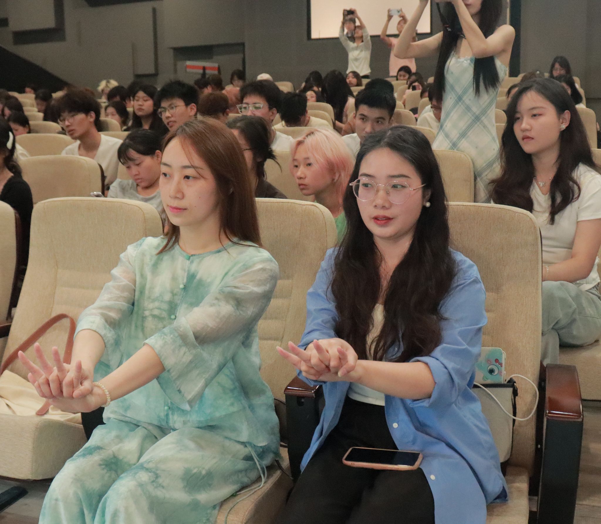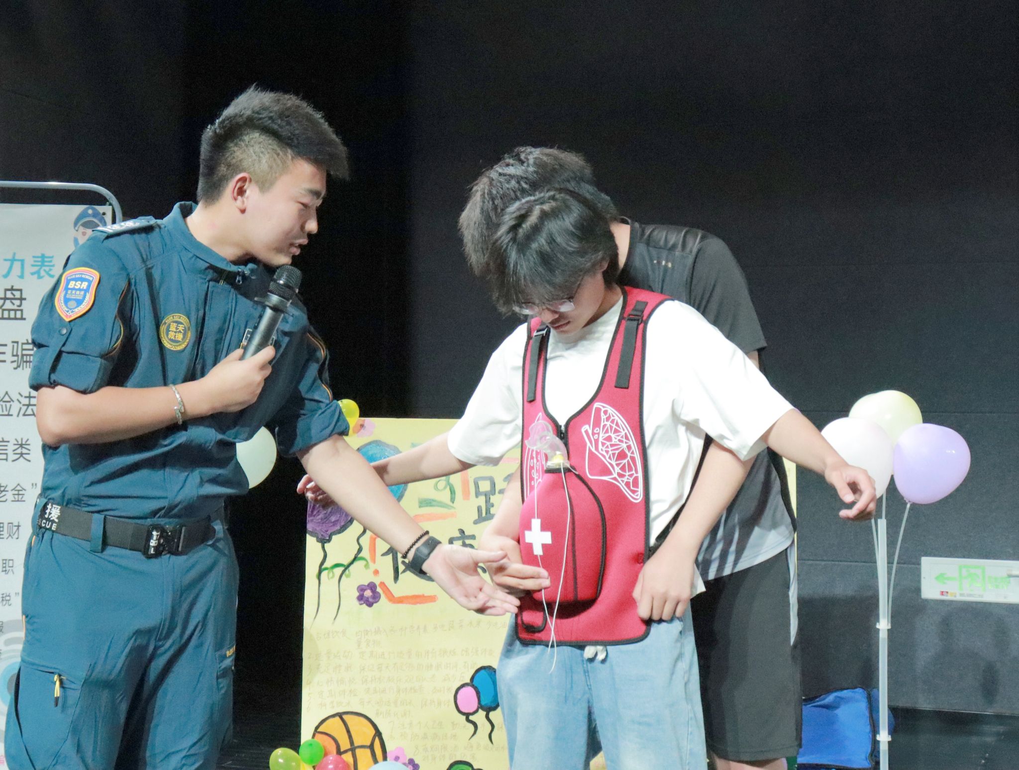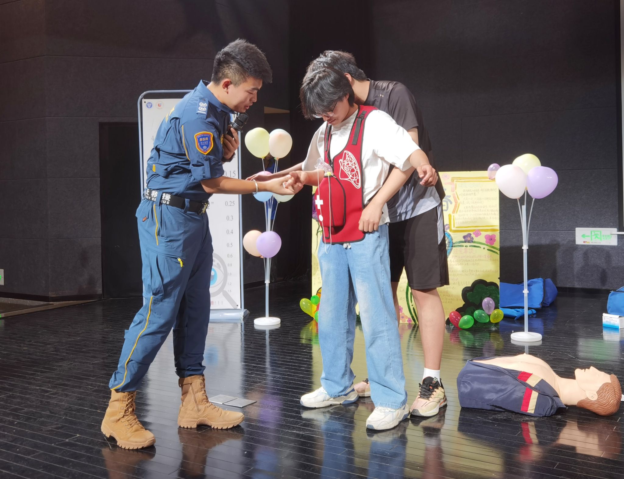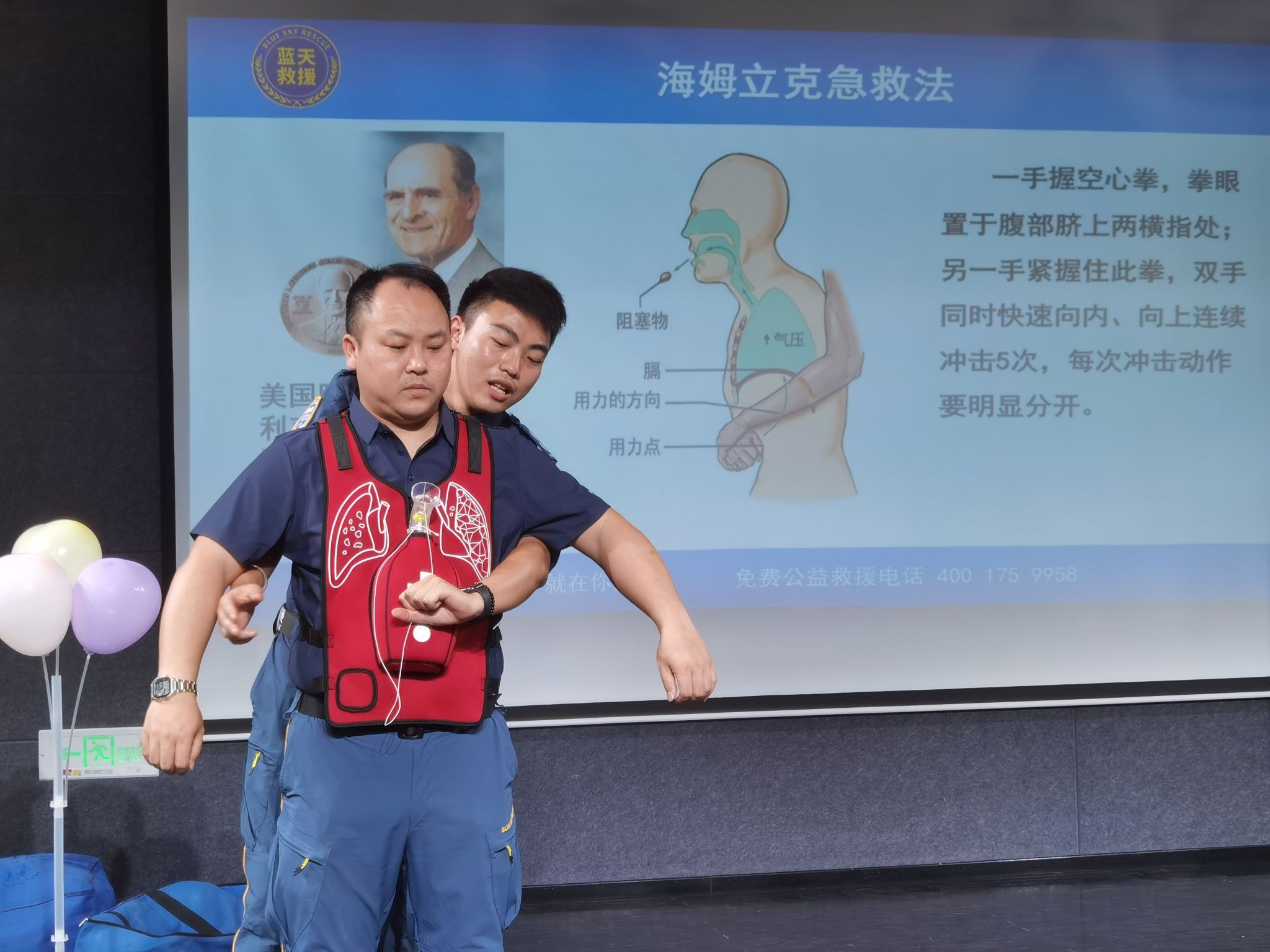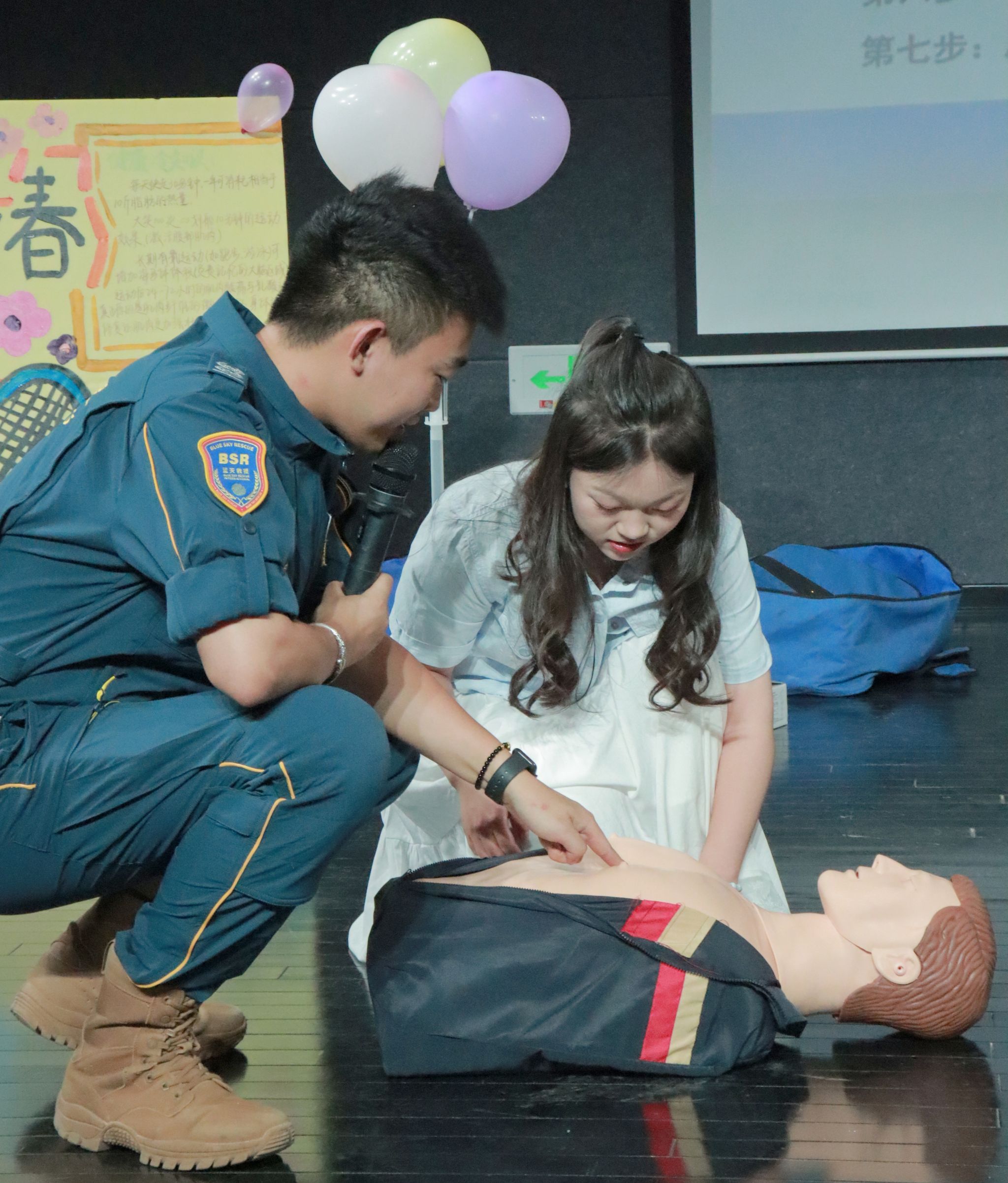 在随后的“气道异物梗阻解除术”环节,讲师结合生活场景,讲解自救与互救要点,结合海姆立克背心演示了成人及婴幼儿海姆立克急救法的差异操作,并强调“剪刀、石头、布”手法口诀,帮助同学们快速记忆操作要领。