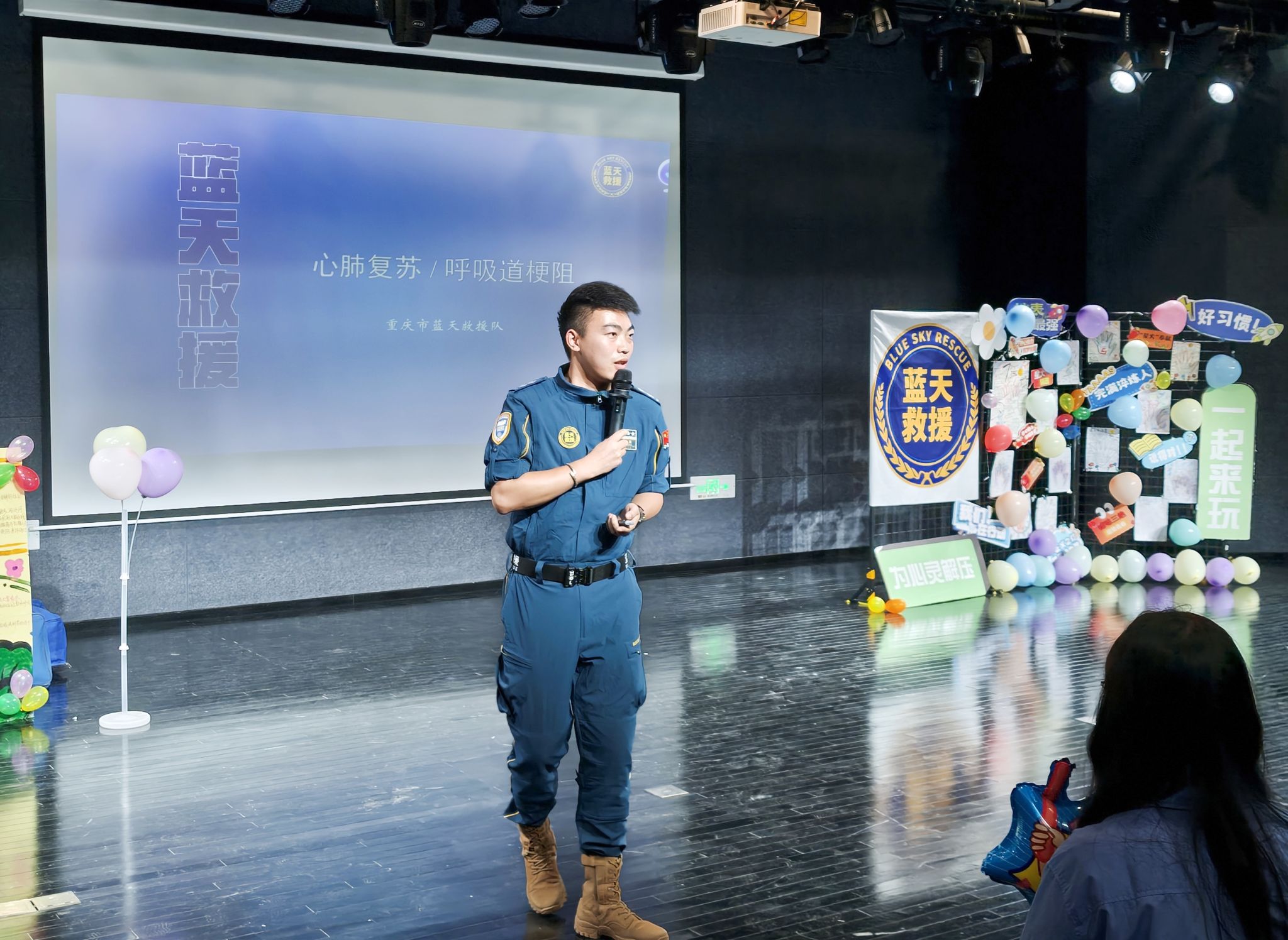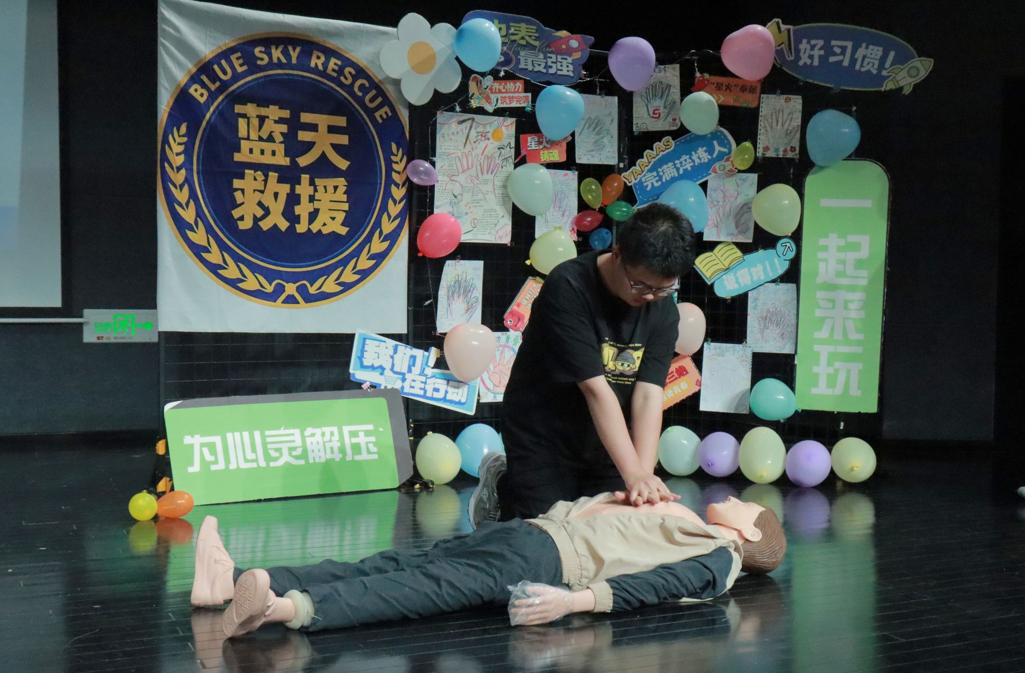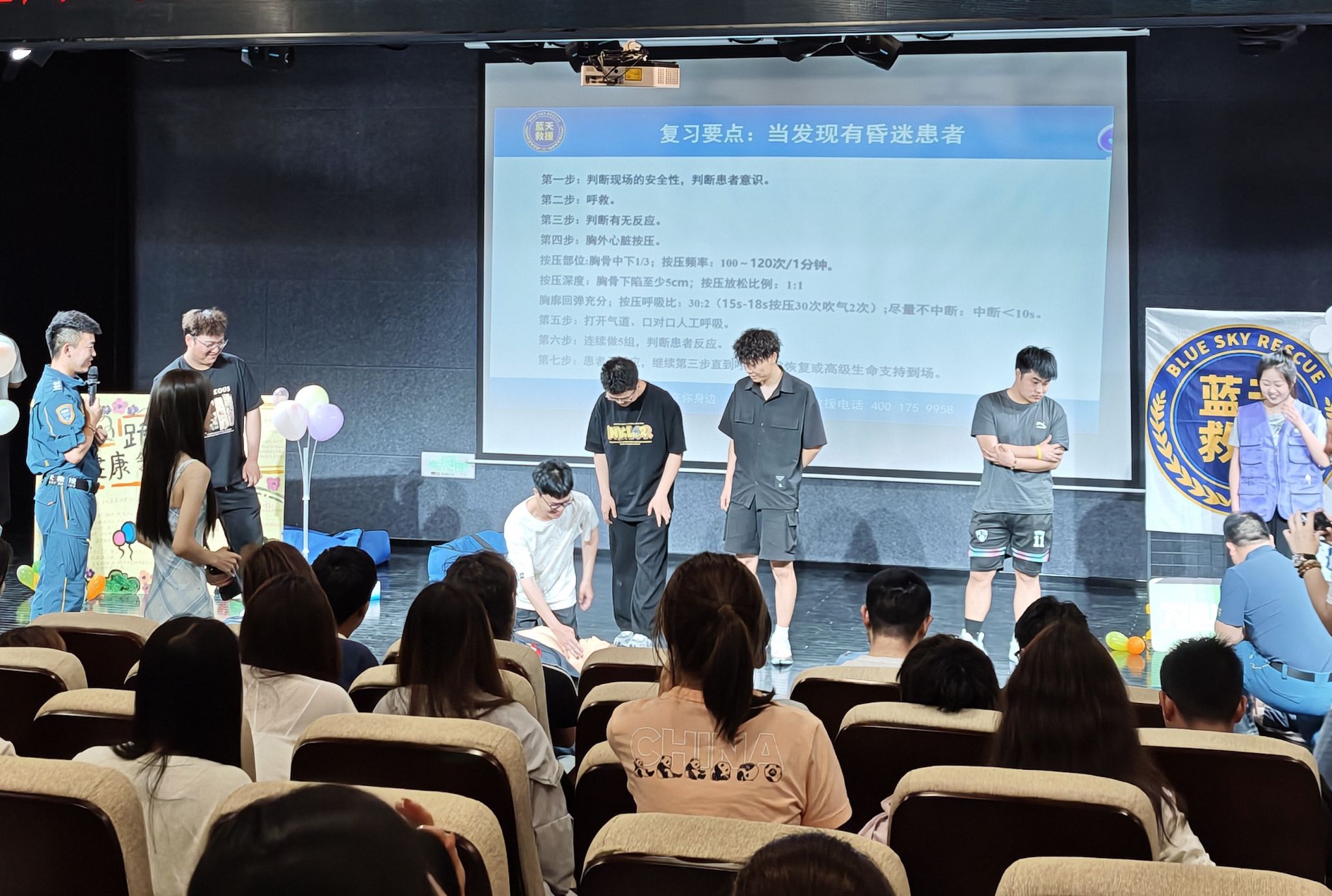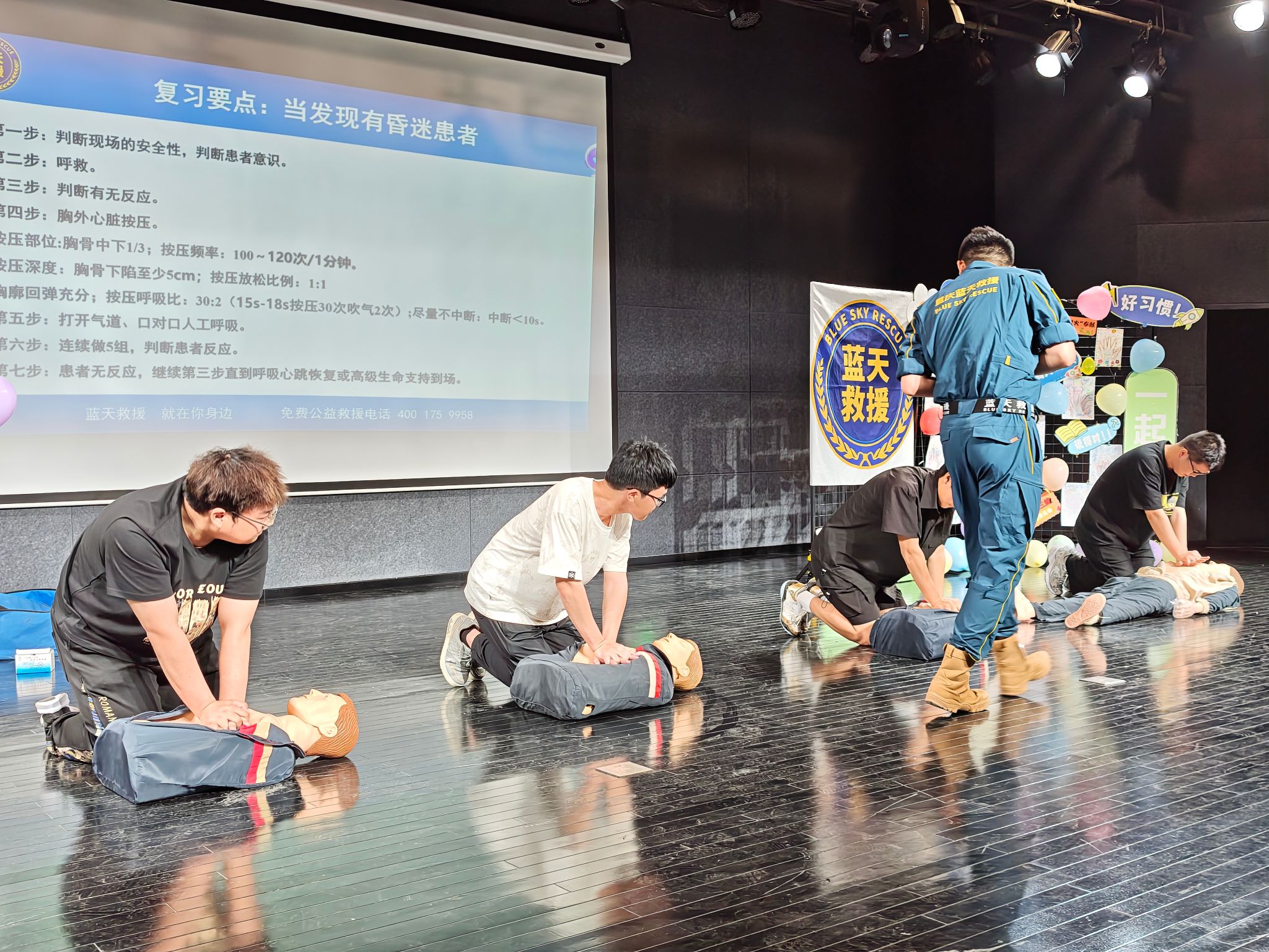 为强化校园安全防线,我校持续开展急救知识与技能的系列课程,逐步使更多的师生成为校园安全的守护者,确保“第一响应人”能够有效实施自救互救,切实掌握打开生命之门的“金钥匙”。鉴于此,学生处宿舍管理中心特邀有着丰富实战经验、专业素养过硬的合川区蓝天救援队承担师资,课程内容为心肺复苏术、AED的使用、气道异物梗阻解除术的知识讲座与技能实操,此次课程由淬炼商学院协办,于4月16日在六度空间-黑匣子剧场开展,淬炼商学院师生代表共计180人参加。