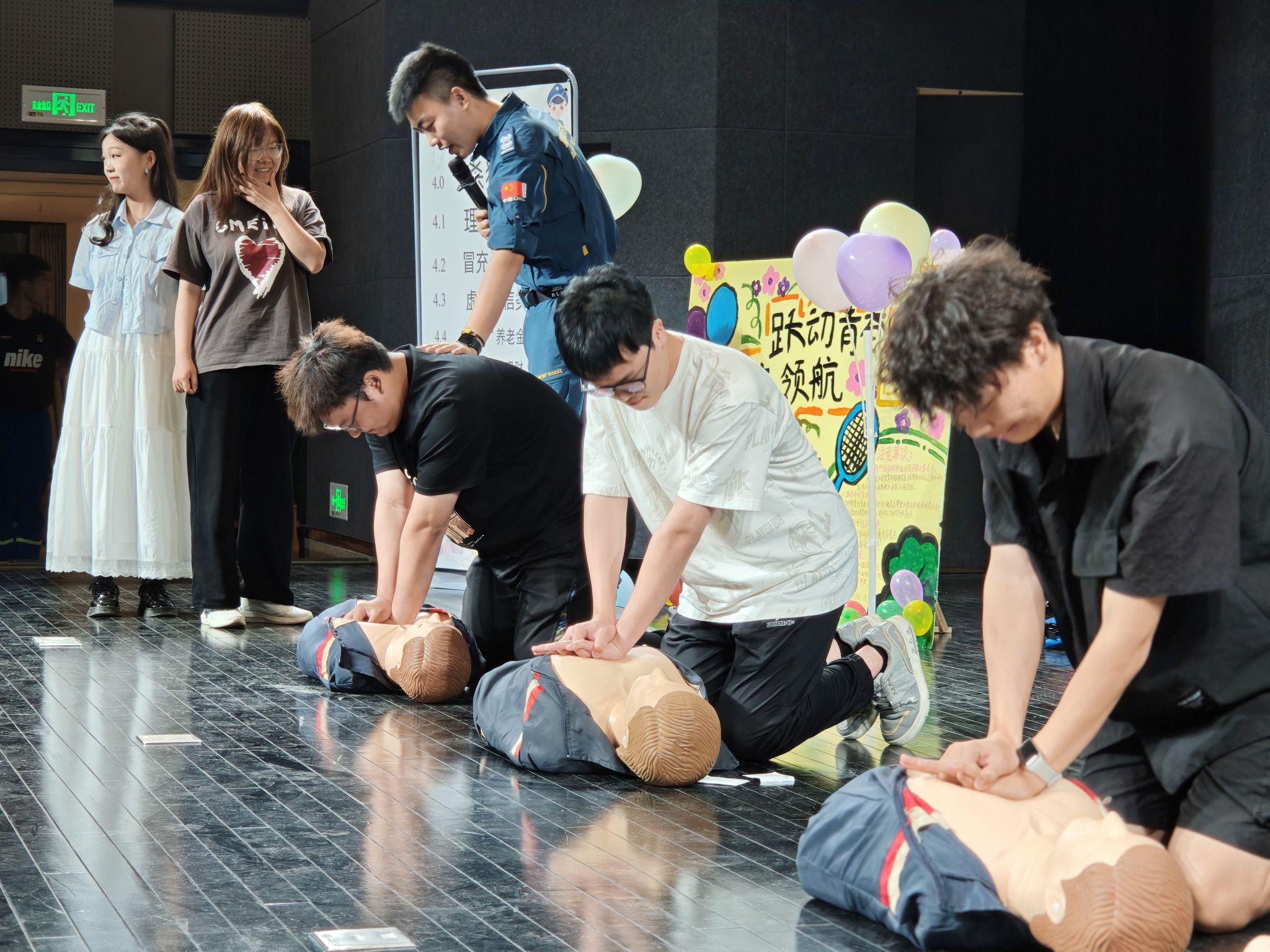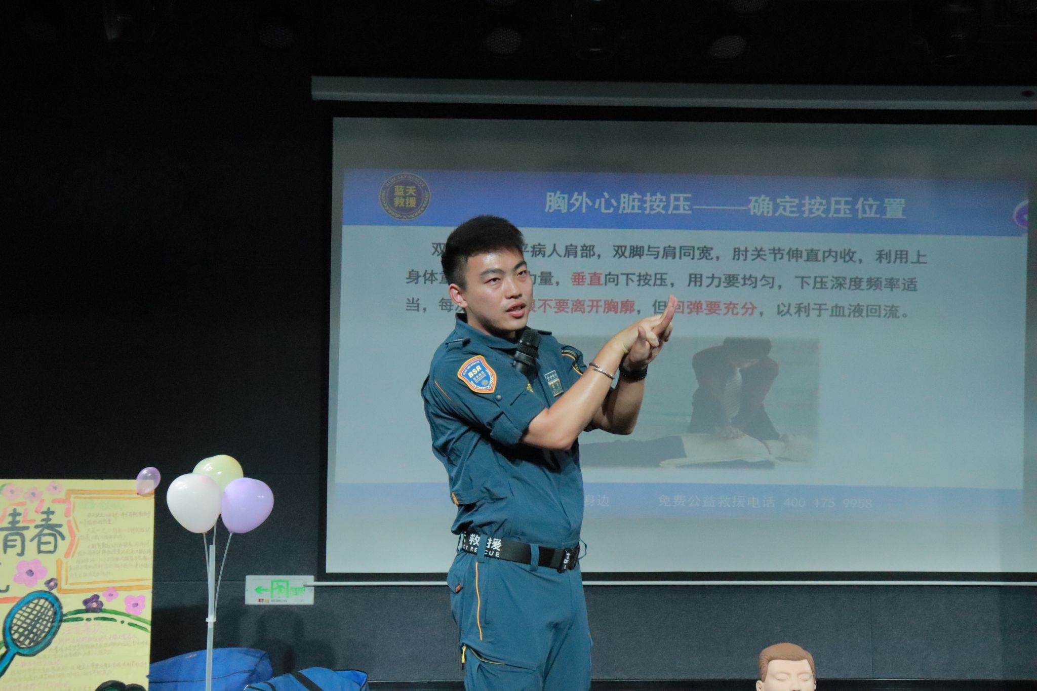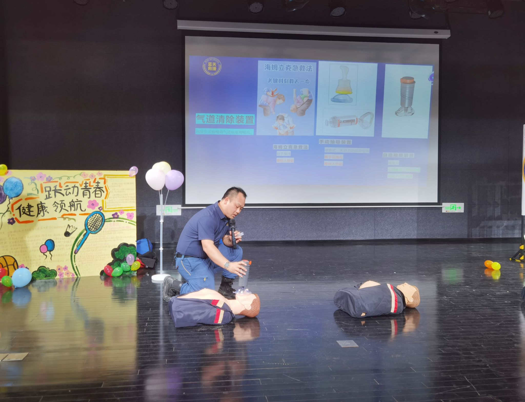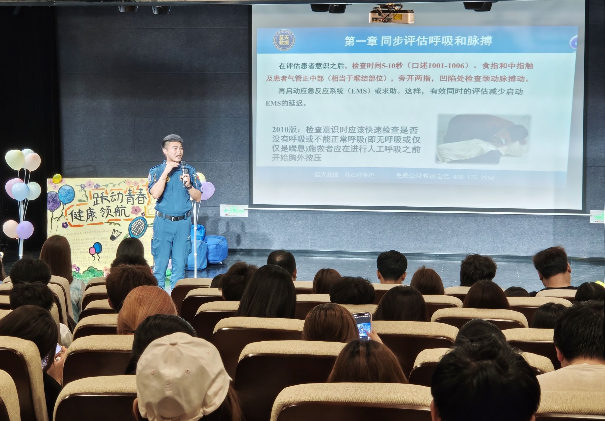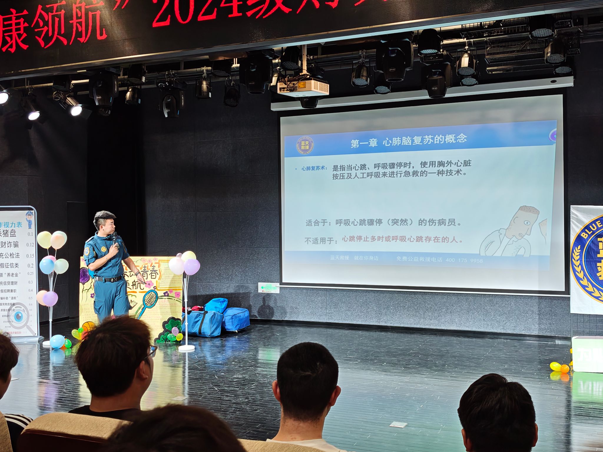 课程伊始,合川区蓝天救援队的副队长杨航老师以生动的案例引入急救知识的重要性。“心脏骤停后的‘黄金4分钟’是挽救生命的关键,而正确使用AED和心肺复苏术能将生存率提高50%以上。”杨航老师通过图文并茂的PPT,详细讲解了心肺复苏的操作流程、按压频率与深度、人工呼吸要点,以及AED设备的操作步骤和注意事项。同学们全神贯注,不时记录要点,现场互动氛围热烈。