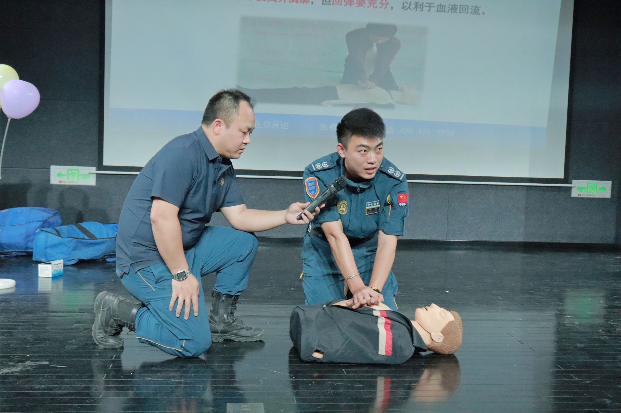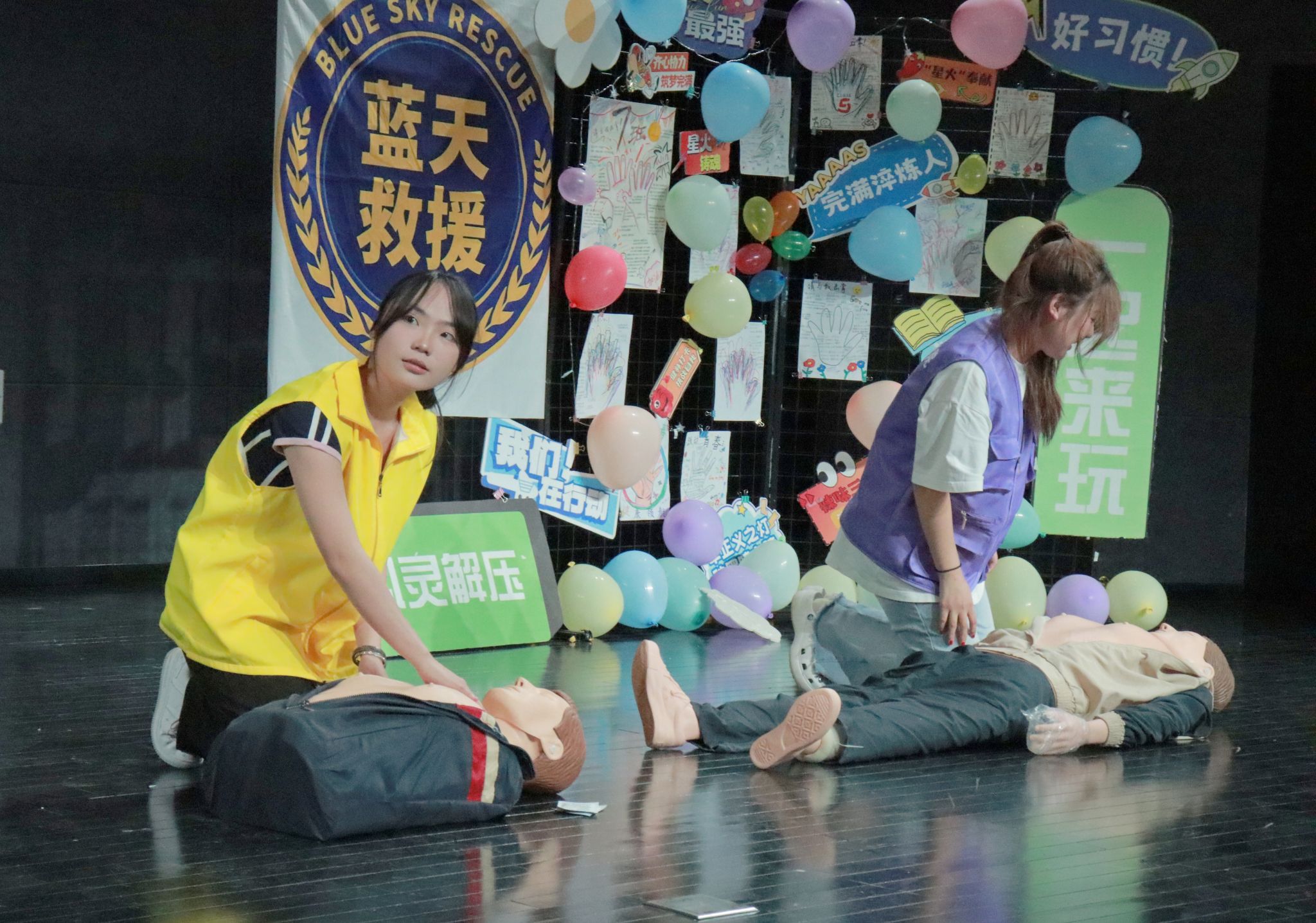 理论讲解结束后,培训进入实操演练环节。蓝天救援队老师们利用心肺复苏模拟人和海姆立克训练背心进行分步示范,从环境评估、呼救报警到胸外按压、开放气道,每一步骤都细致拆解。同学们分组上台,在救援队老师的“一对一”指导下进行练习。“手臂要伸直,用上半身力量垂直下压”“AED贴片位置不能错”……老师们手把手纠正动作,确保操作规范。