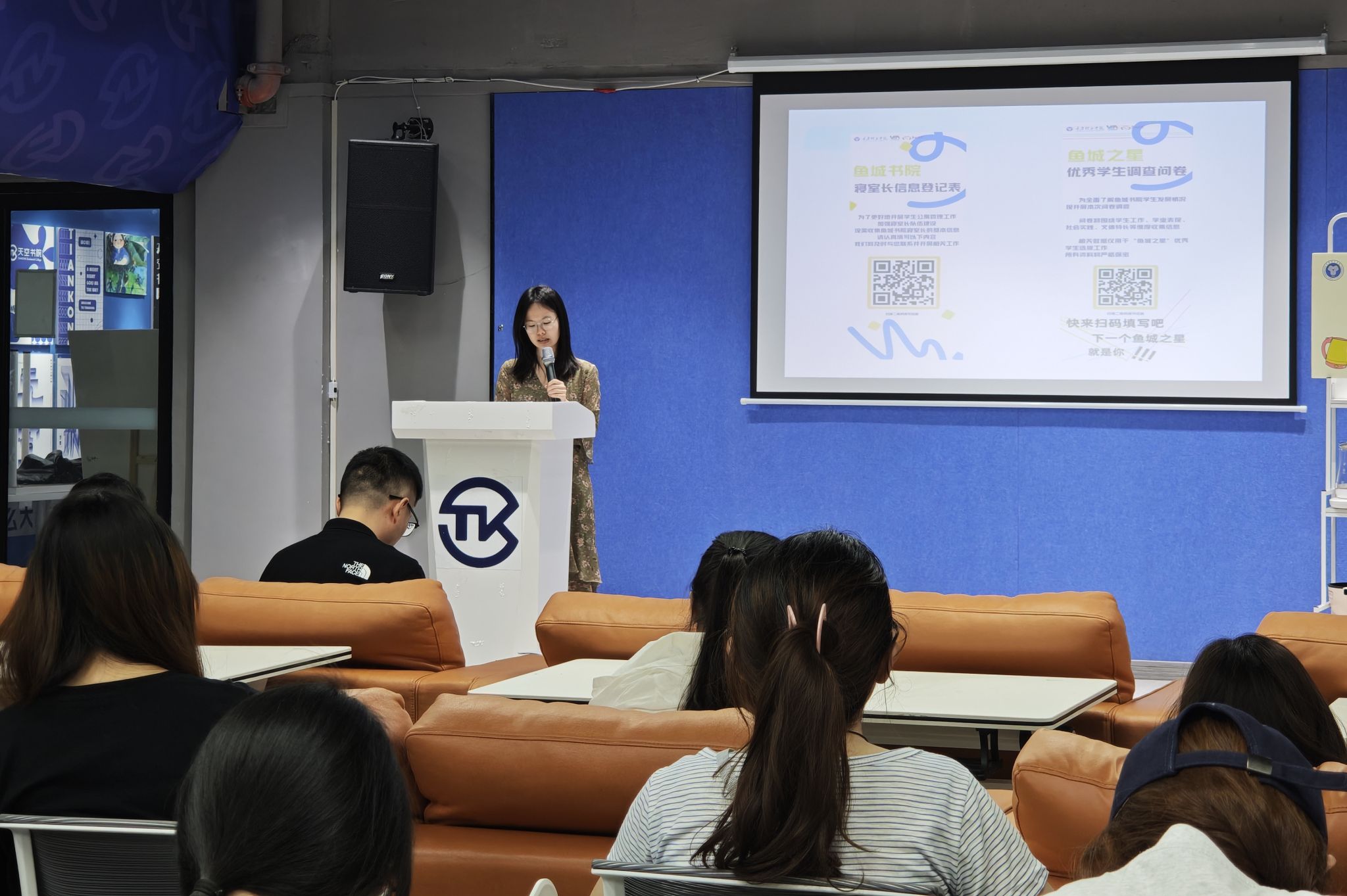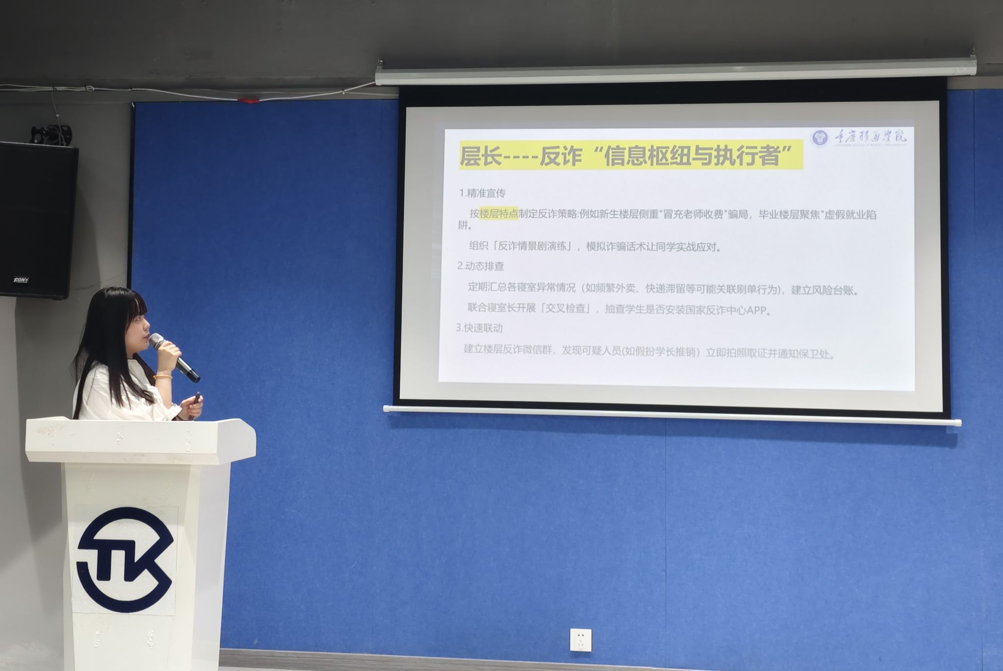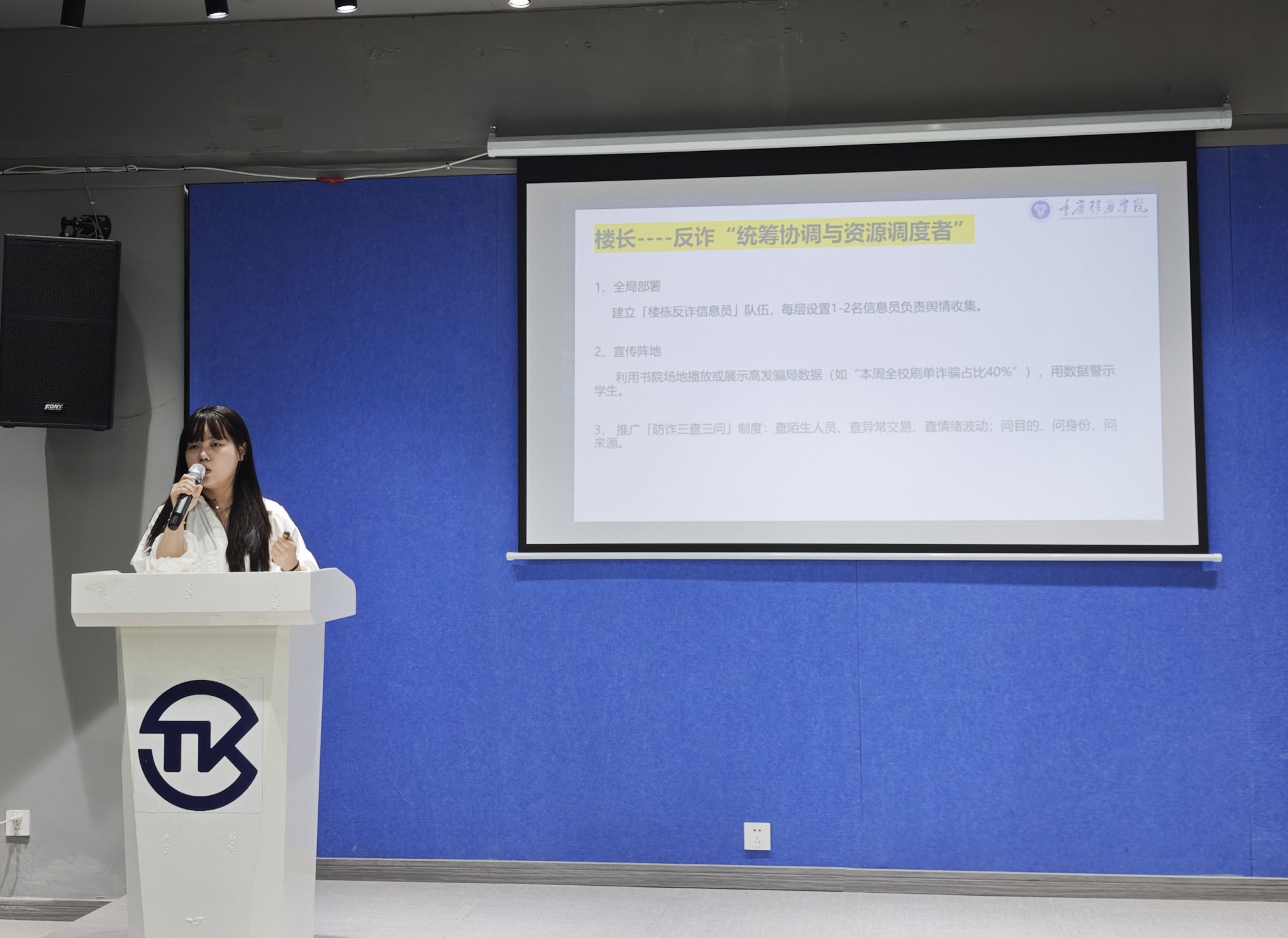 鱼城书院的杨钊熙老师围绕鱼城书院空间主理人召集、书院育人典型示范之信息收集、功能室的使用及反馈等做出详细讲解。保卫处的罗倩老师就当今电信诈骗的类别、案例做出详细讲解,同时结合三长分别的职责特点做出相应的在反诈中的工作提醒。