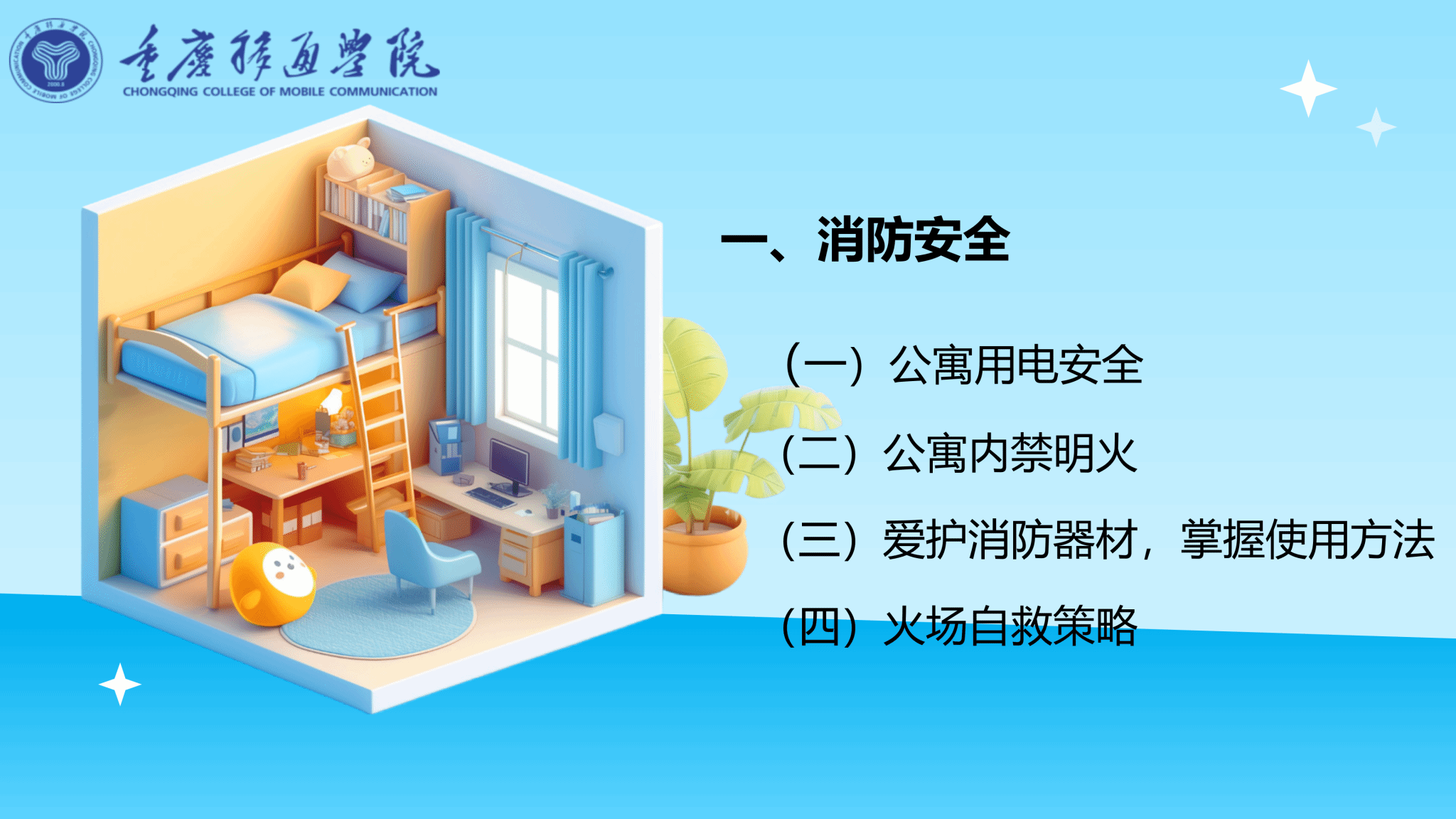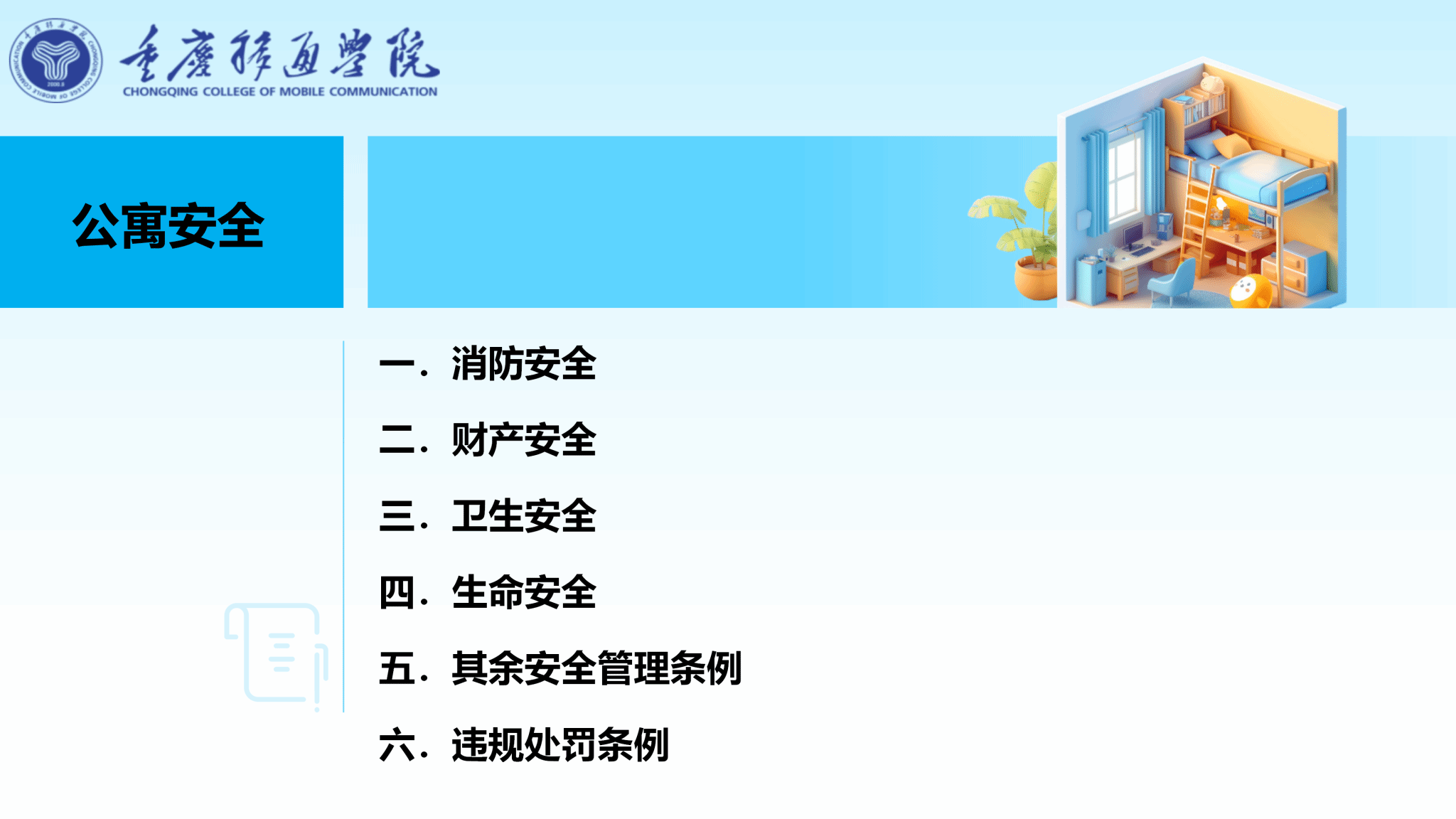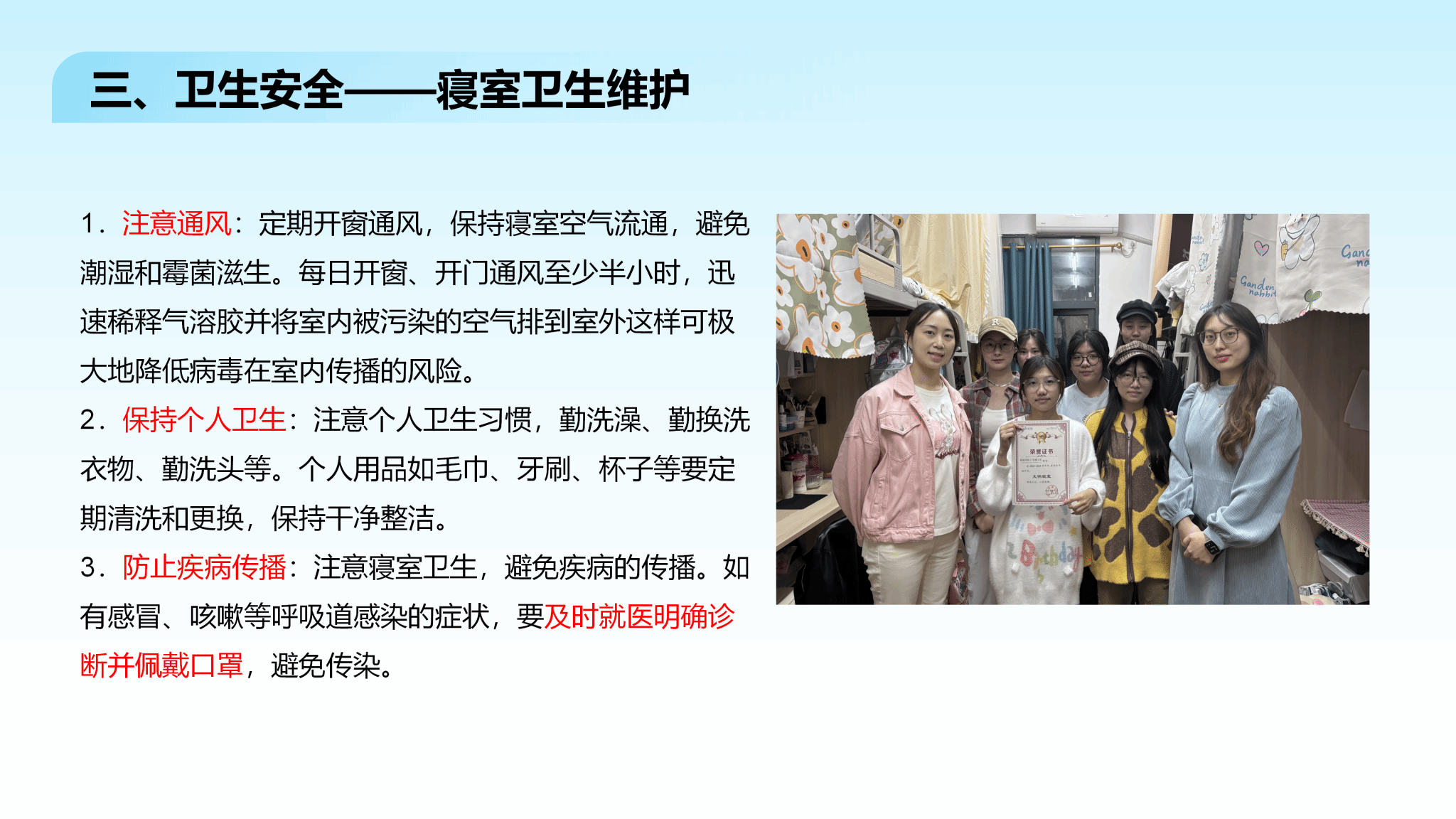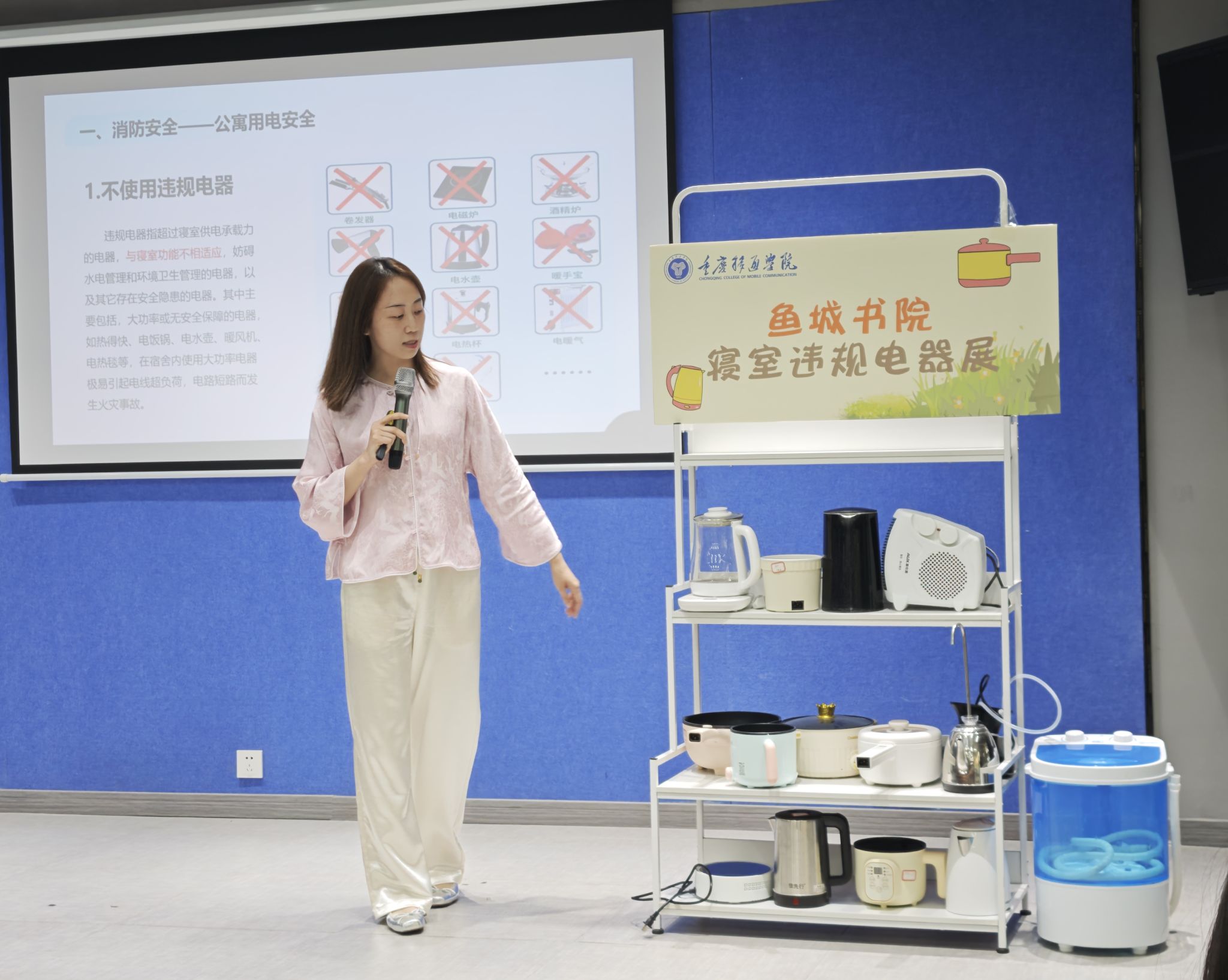在消防安全的讲解中,黄灿老师通过违规电器展和真实案例引出公寓禁明火及用电安全的细则,同时讲解鱼城书院内消防器材位置和使用方法,以及火场自救策略,增强三长安全防范意识,遵守公寓管理规定。在财产安全、卫生安全等其余公寓安全知识讲解中,从识别到处理,细致讲解每一步流程,如通风的方式、个人卫生涵盖内容、公寓设施的正确使用等让三长听得懂,记得牢。
