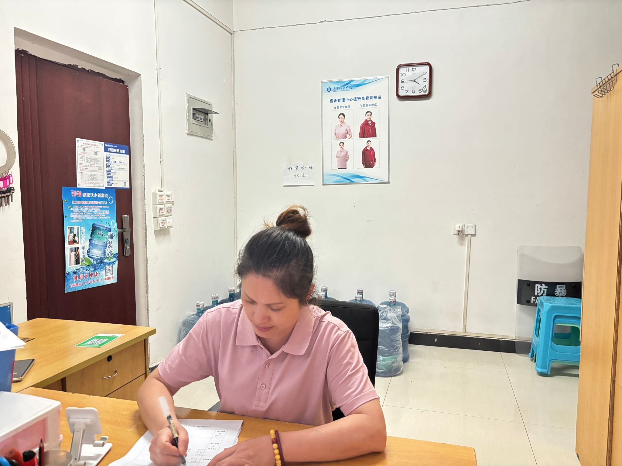 新工作服发放后,值班员们纷纷换上崭新的制服,以全新的面貌投入到工作中。统一的着装不仅提升了值班员自身的职业认同感与责任感,也让广大师生感受到了宿舍管理团队的专业与规范。