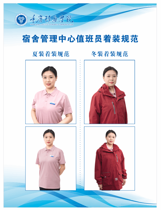 同时,宿舍管理中心以拍摄的着装照为基础,制定了详细的宿舍管理中心值班员着装规范示例。该示例以图文并茂的形式,对工作服的穿着场合、搭配要求、仪容仪表等方面进行了明确规定,为值班员提供了清晰的着装指南。确保了值班员队伍形象的统一性和规范性。