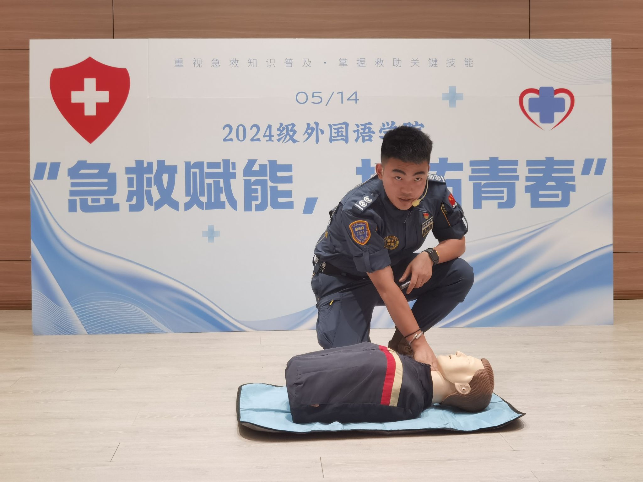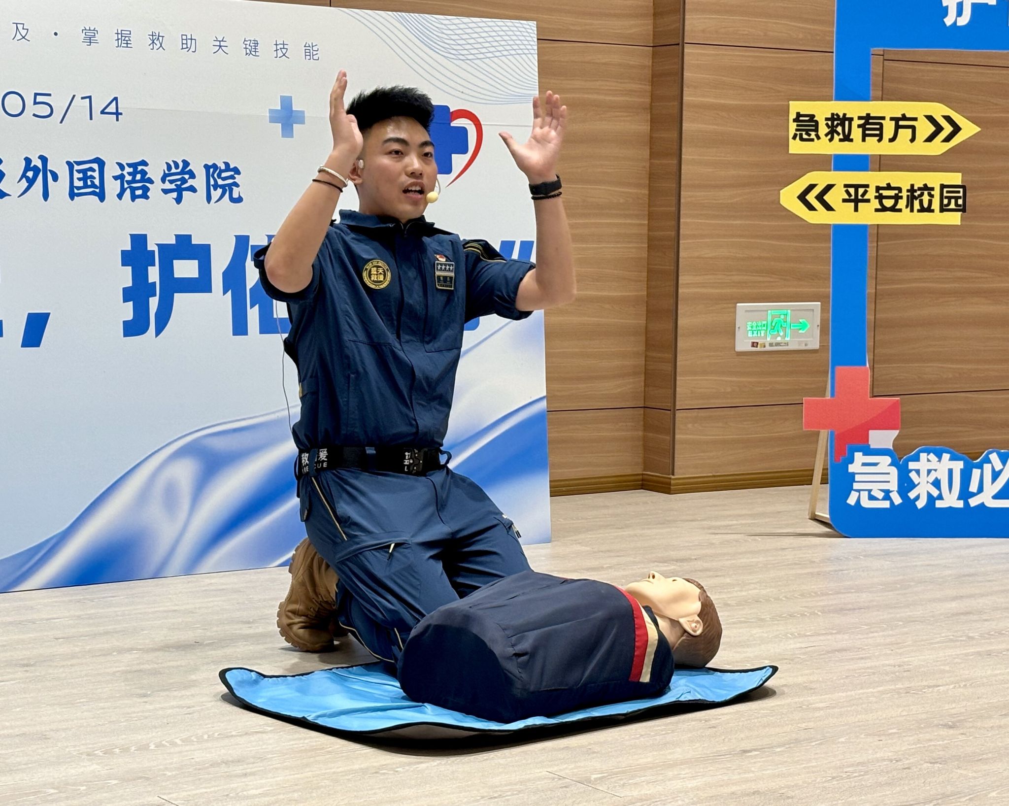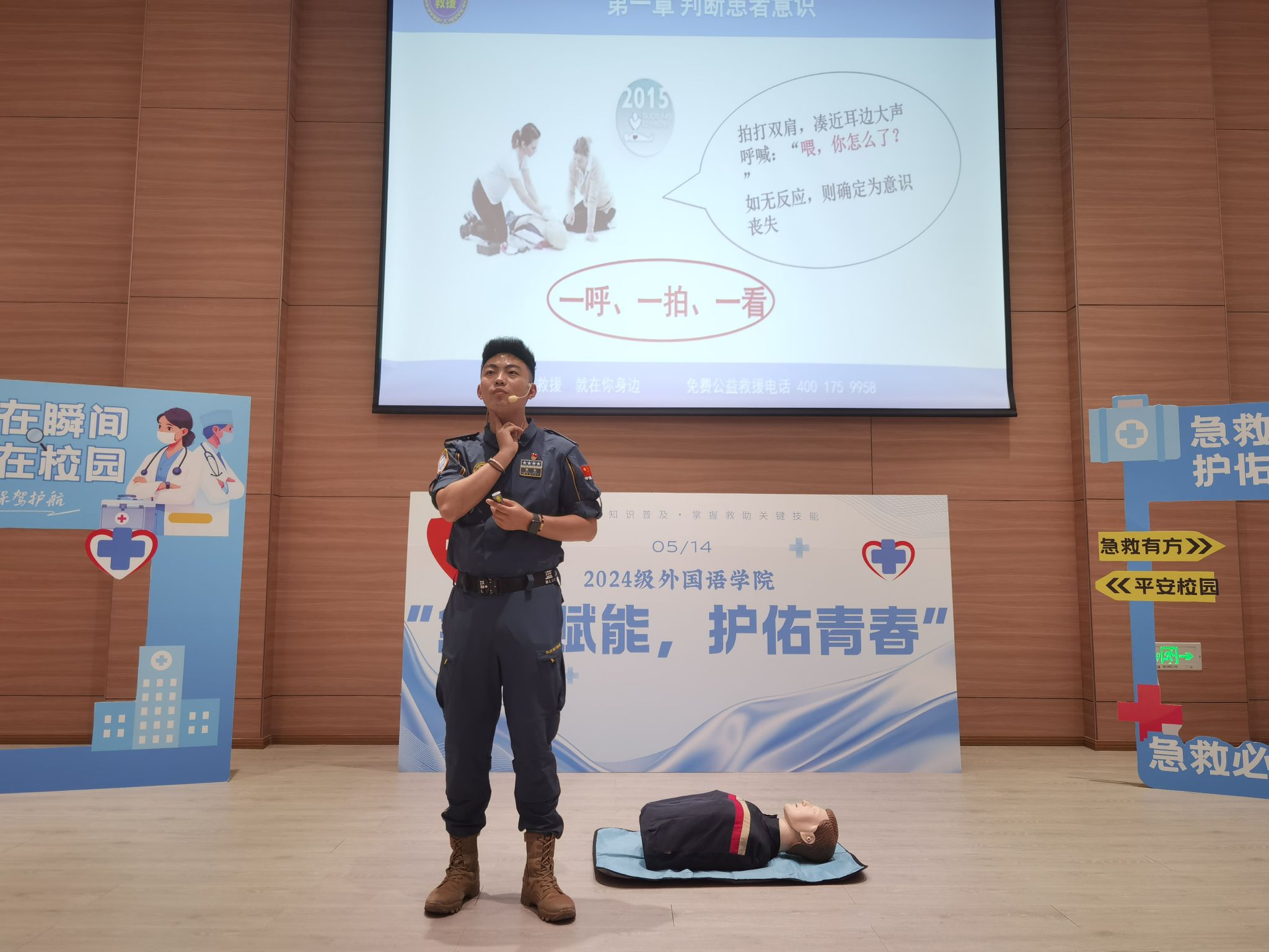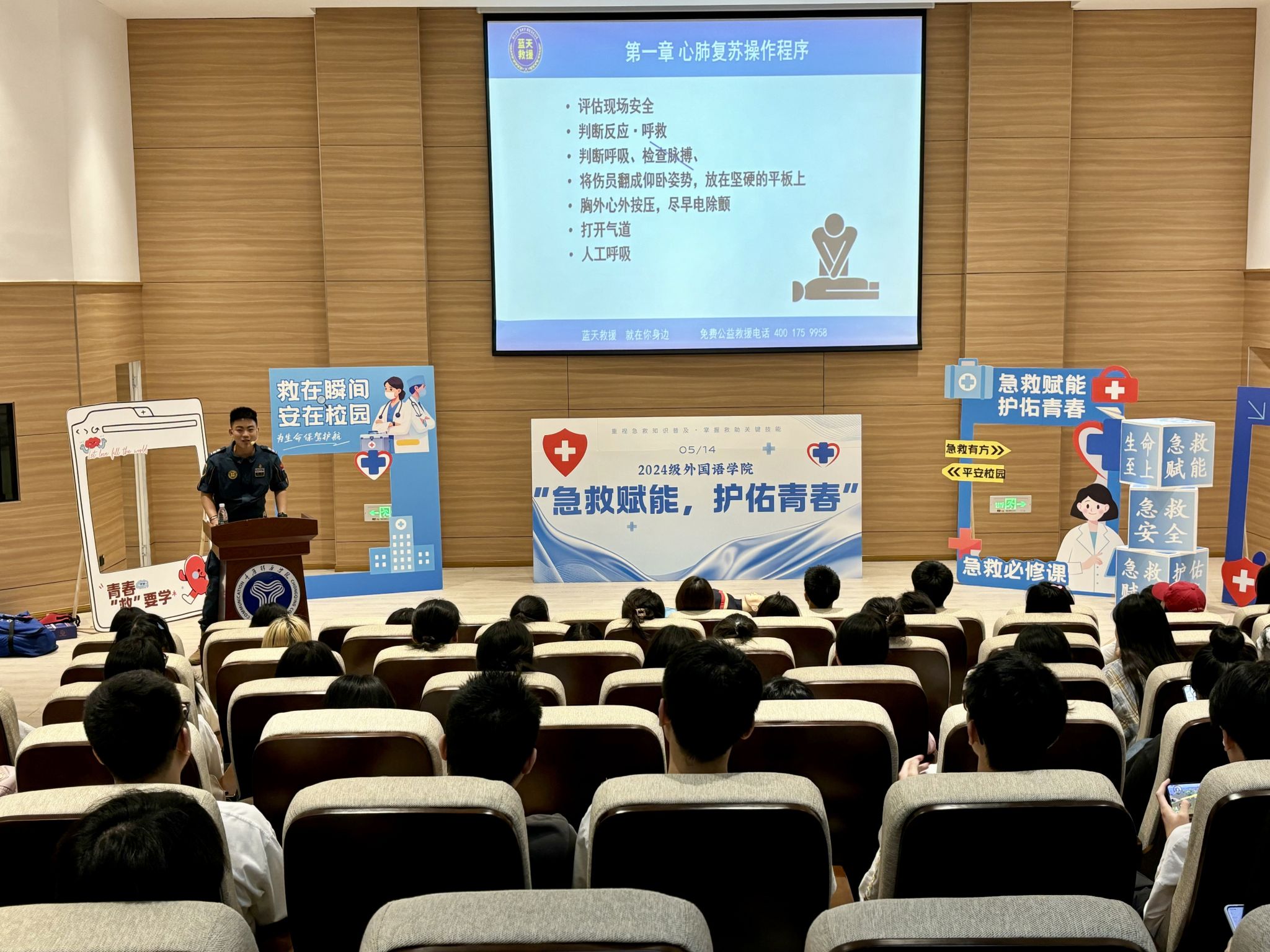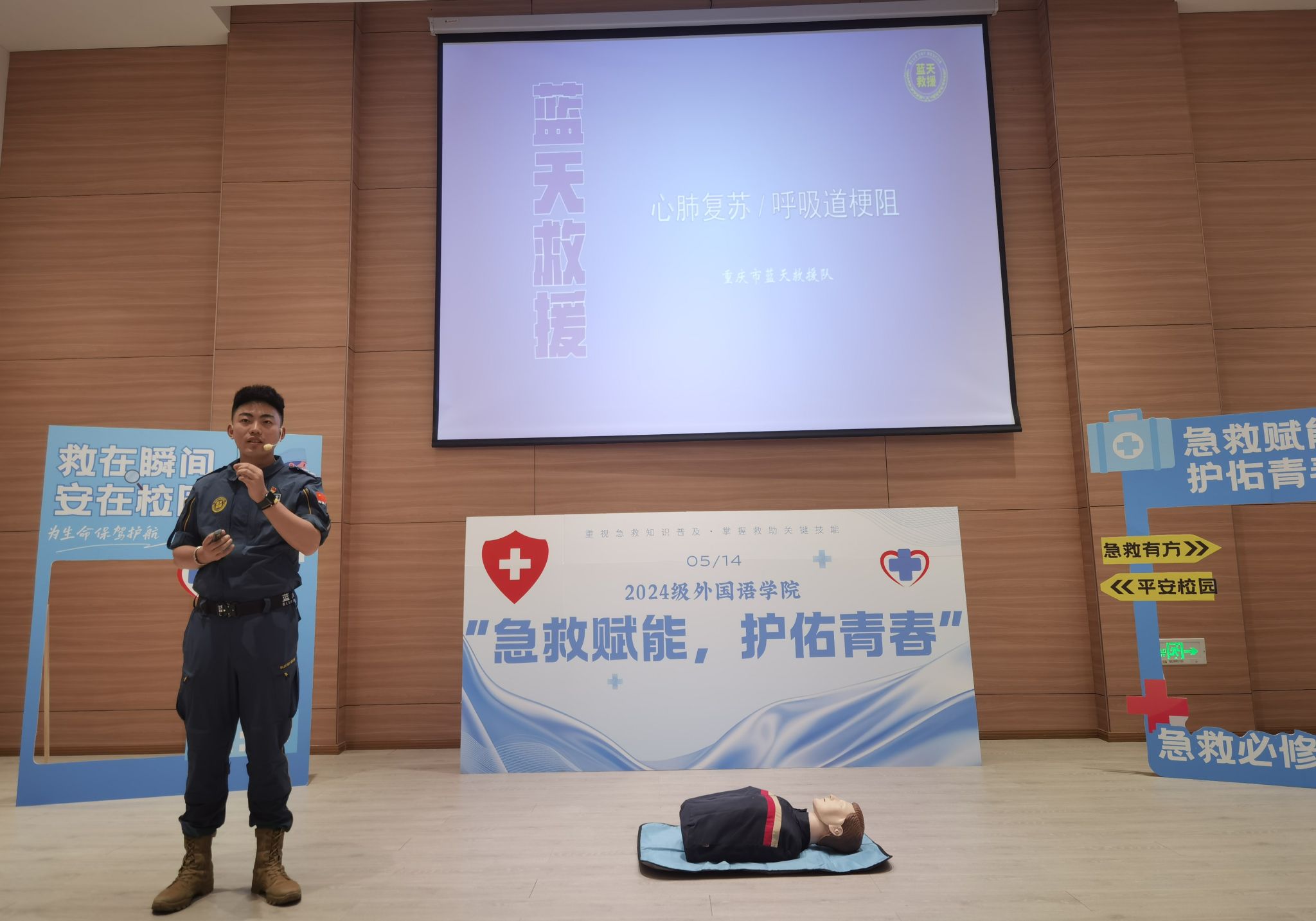 为响应本科教学评估,深化校园安全教育体系建设,切实提升学生应急救护能力,打造"人人敢救、人人会救"的平安校园环境,我校学生处宿舍管理中心联合外国语学院,于5月14日在六度空间-创梦空间开展第十四期急救知识与技能课程。本次活动特邀合川区蓝天救援队副队长杨航担任主讲,外国语学院师生代表共200余人参与课程,课程涵盖心肺复苏术(CPR)、AED设备操作及气道异物梗阻解除术三大核心急救技能。