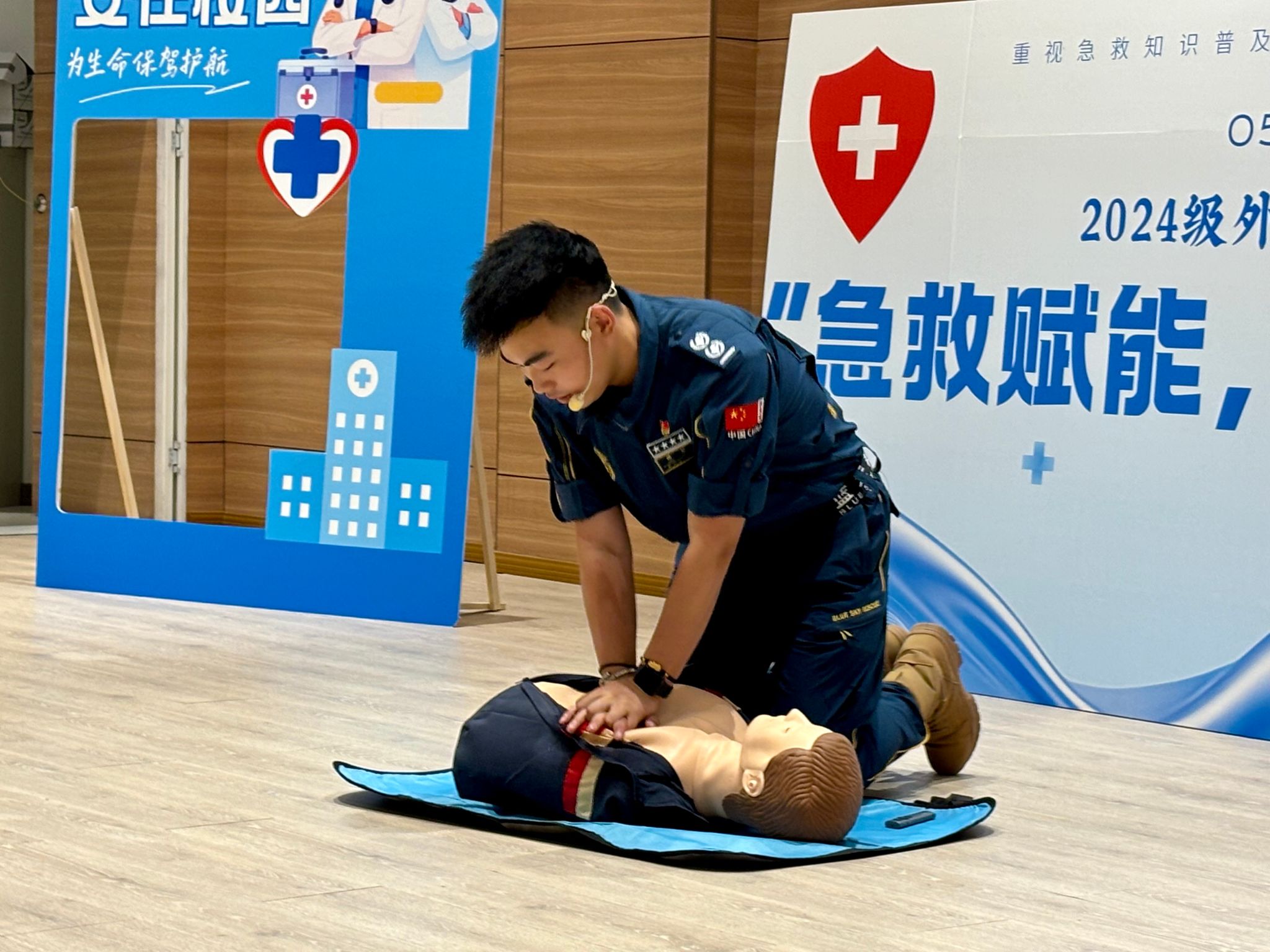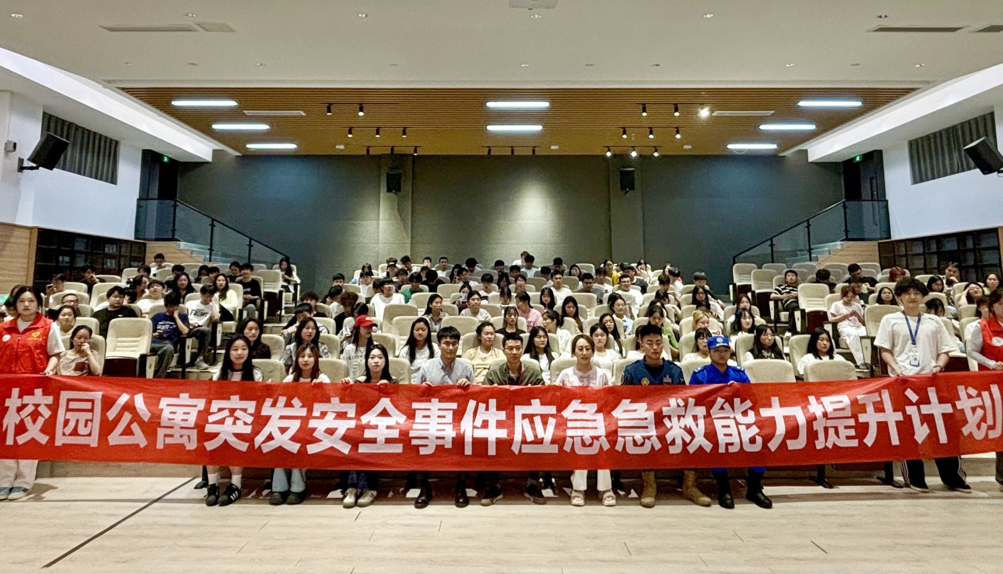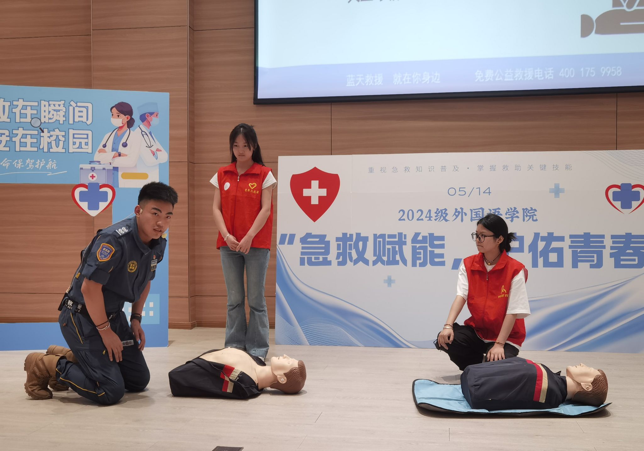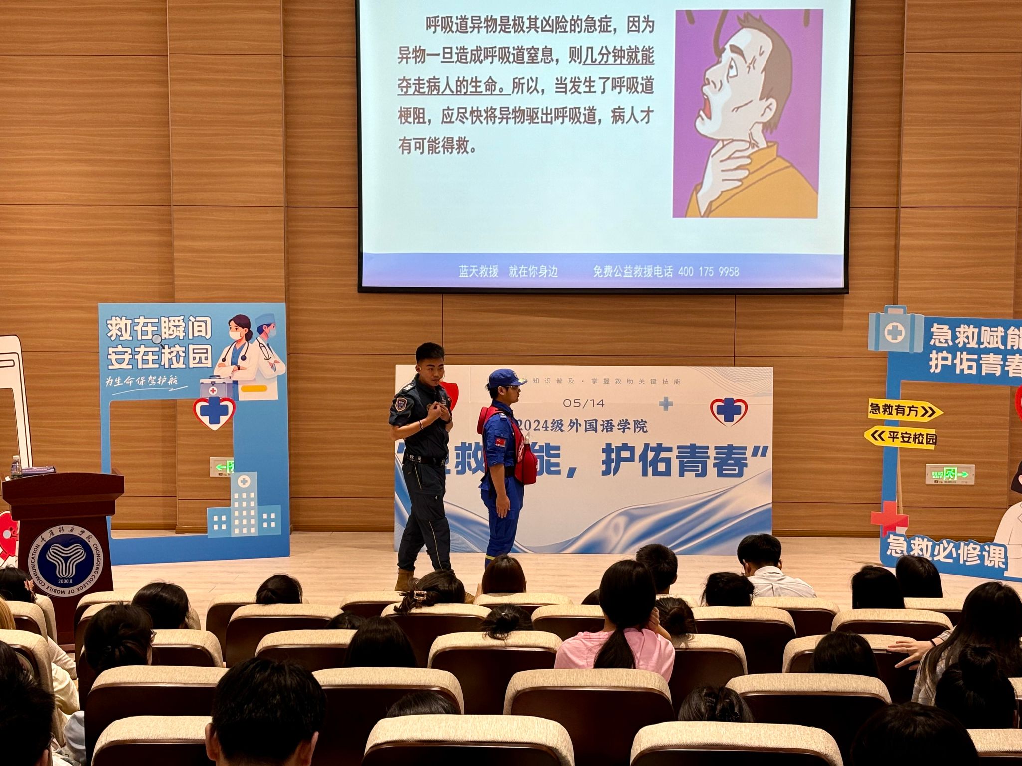 为响应本科教学评估,深化校园安全教育体系建设,切实提升学生应急救护能力,打造"人人敢救、人人会救"的平安校园环境,我校学生处宿舍管理中心联合外国语学院,于5月14日在六度空间-创梦空间开展第十四期急救知识与技能课程。本次活动特邀合川区蓝天救援队副队长杨航担任主讲,外国语学院师生代表共200余人参与课程,课程涵盖心肺复苏术(CPR)、AED设备操作及气道异物梗阻解除术三大核心急救技能。