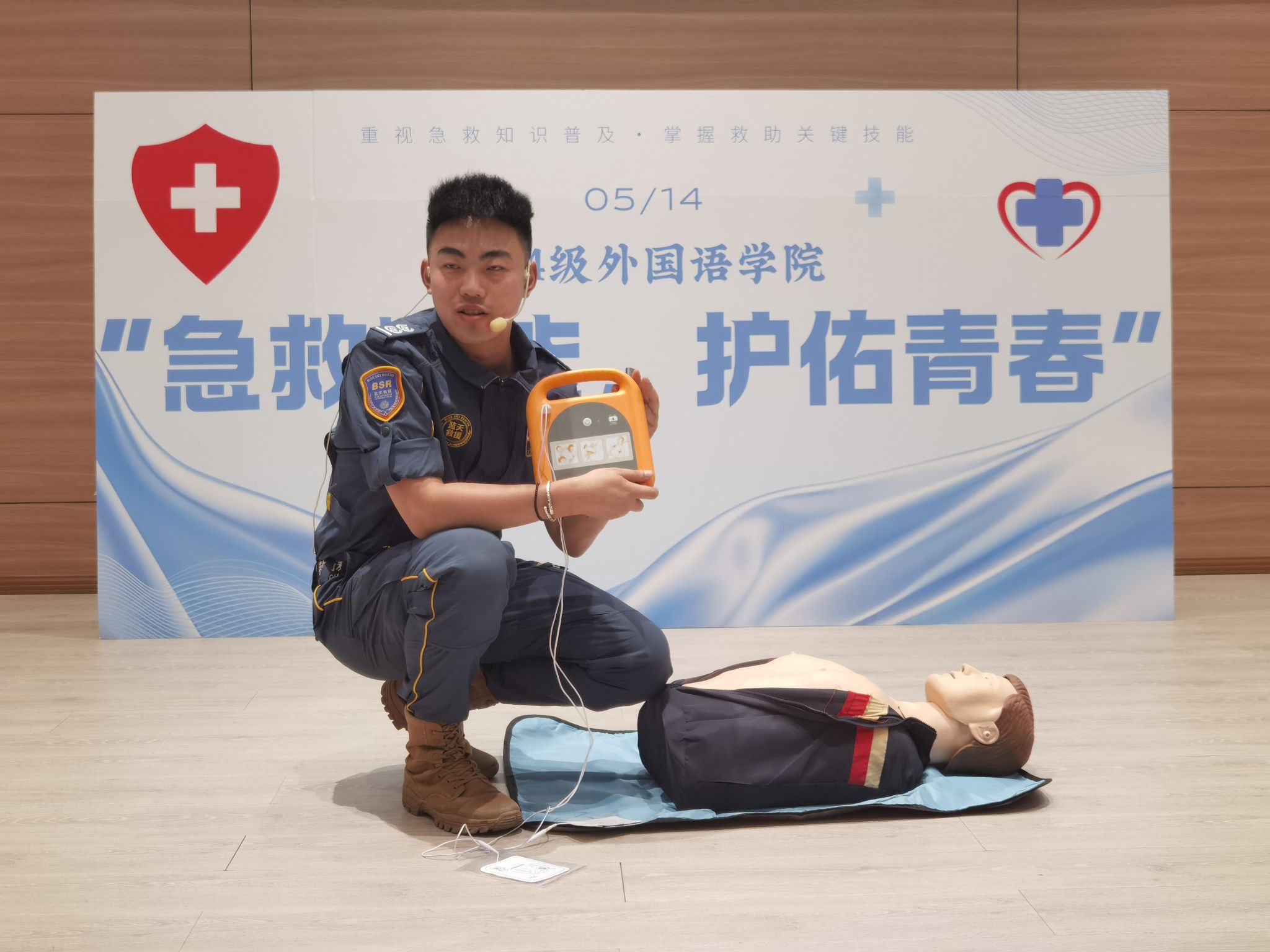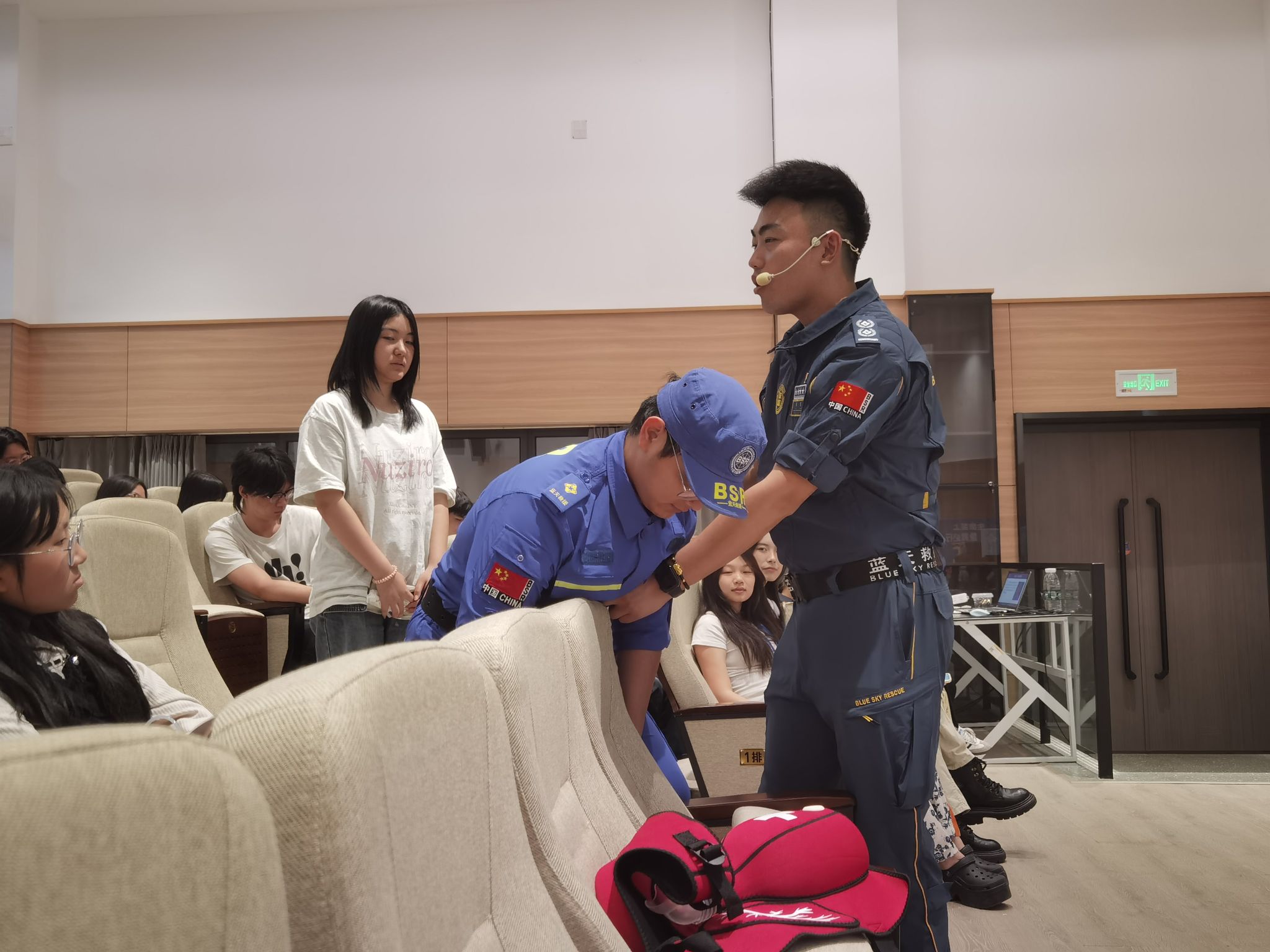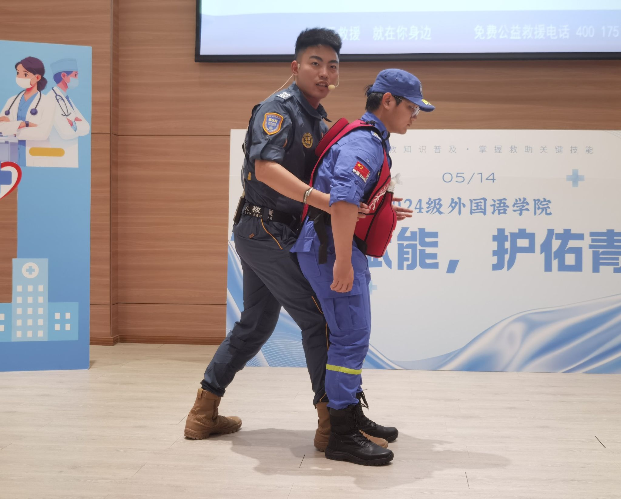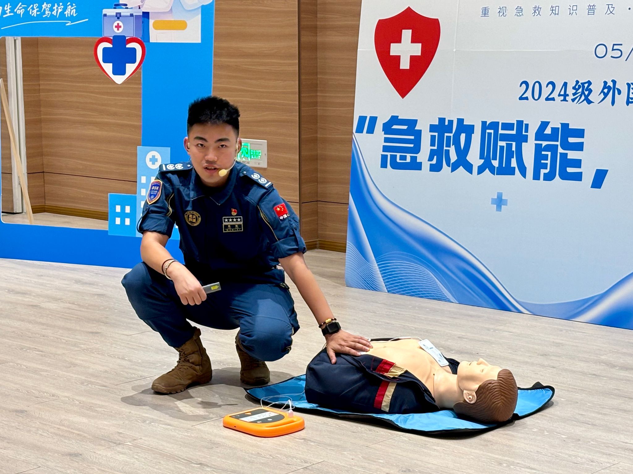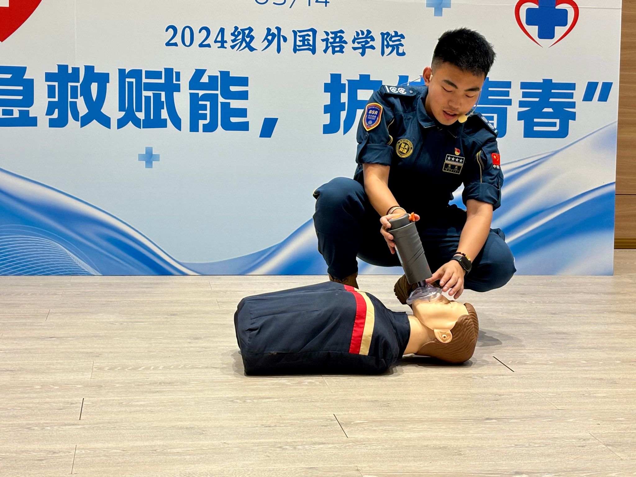 为响应本科教学评估,深化校园安全教育体系建设,切实提升学生应急救护能力,打造"人人敢救、人人会救"的平安校园环境,我校学生处宿舍管理中心联合外国语学院,于5月14日在六度空间-创梦空间开展第十四期急救知识与技能课程。本次活动特邀合川区蓝天救援队副队长杨航担任主讲,外国语学院师生代表共200余人参与课程,课程涵盖心肺复苏术(CPR)、AED设备操作及气道异物梗阻解除术三大核心急救技能。