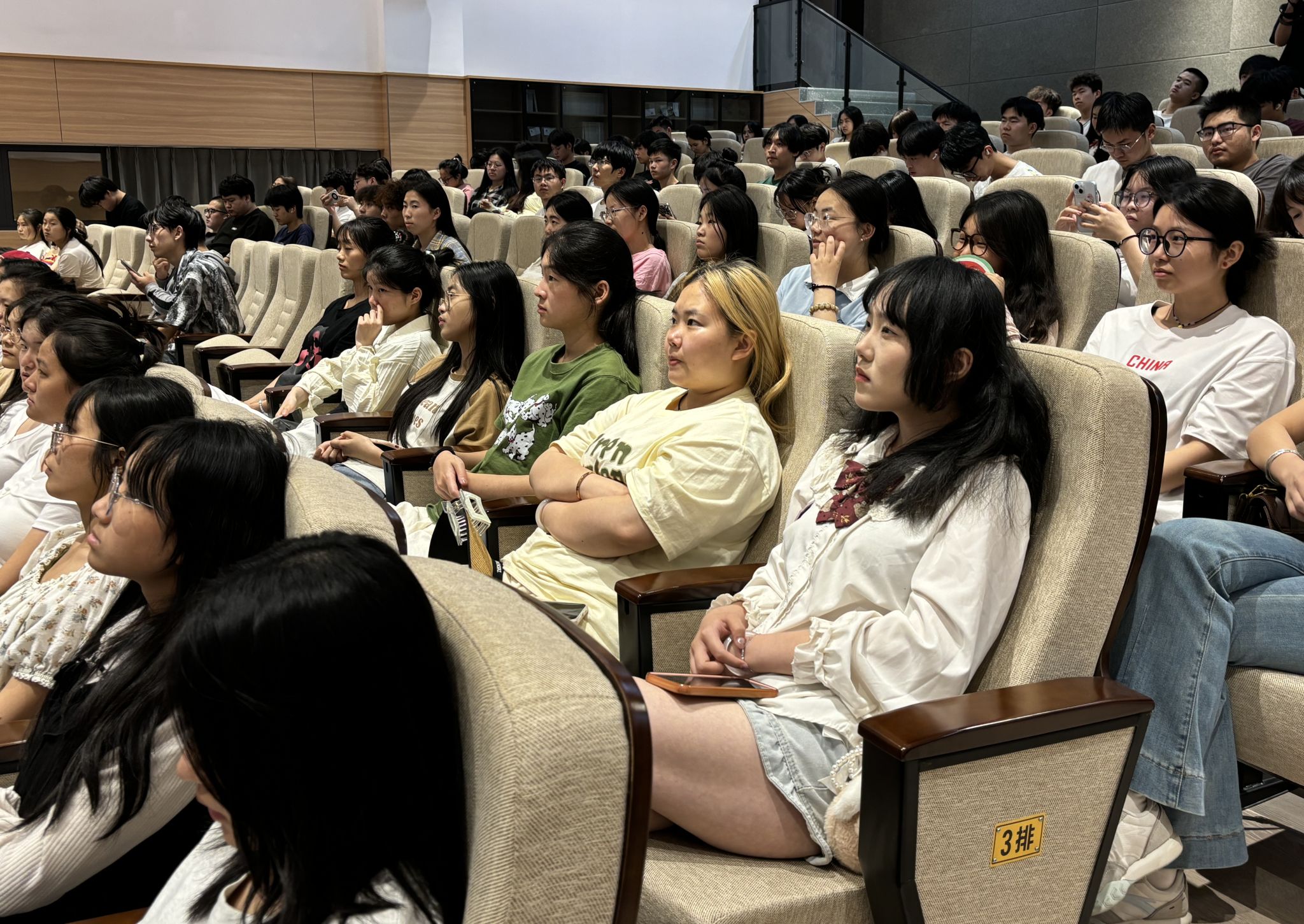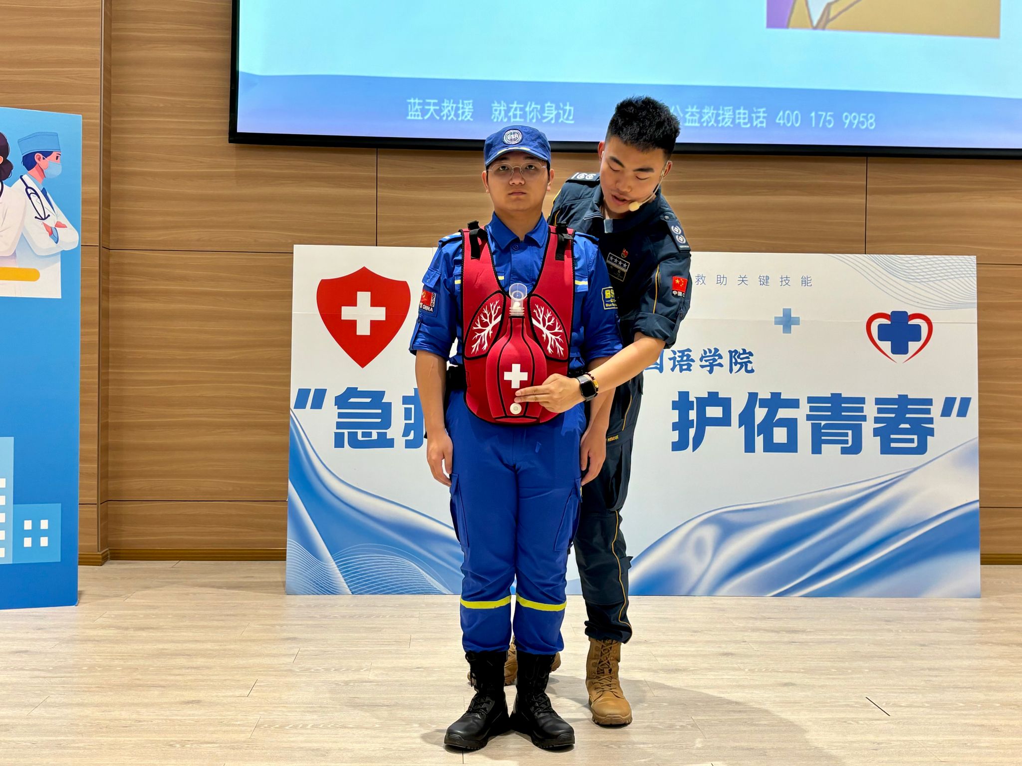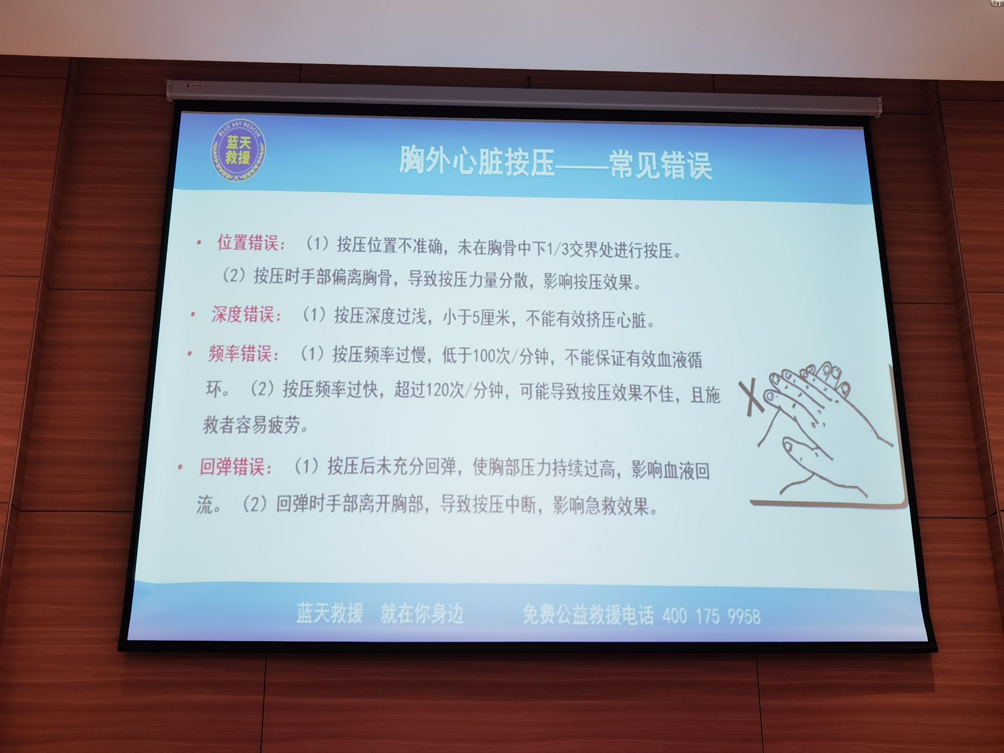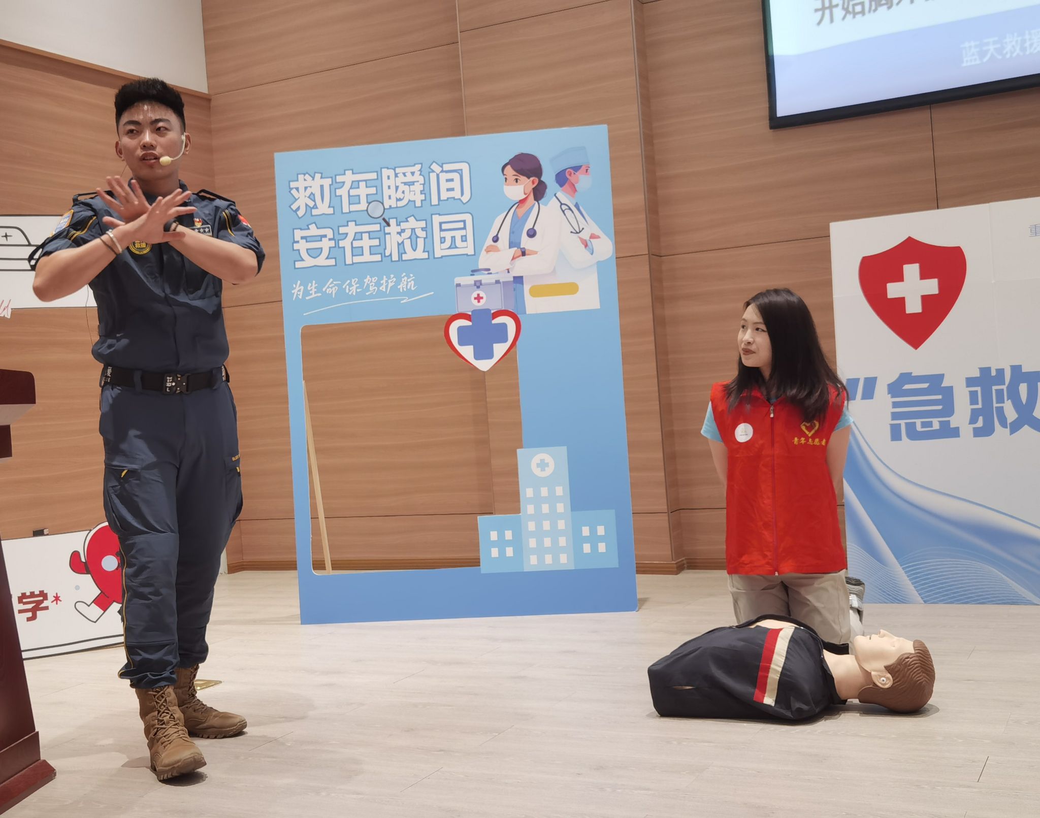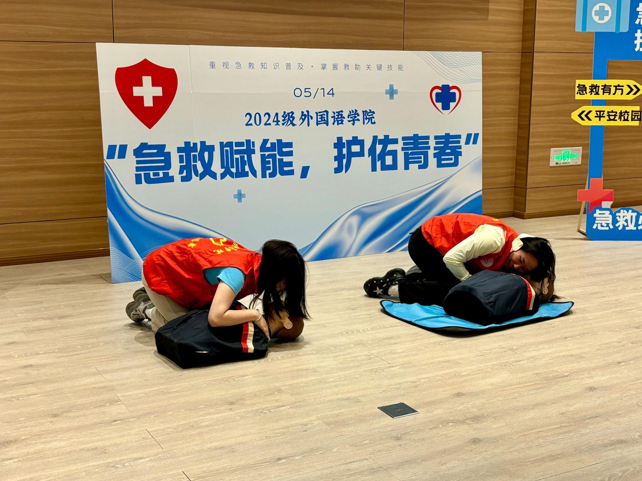 为响应本科教学评估,深化校园安全教育体系建设,切实提升学生应急救护能力,打造"人人敢救、人人会救"的平安校园环境,我校学生处宿舍管理中心联合外国语学院,于5月14日在六度空间-创梦空间开展第十四期急救知识与技能课程。本次活动特邀合川区蓝天救援队副队长杨航担任主讲,外国语学院师生代表共200余人参与课程,课程涵盖心肺复苏术(CPR)、AED设备操作及气道异物梗阻解除术三大核心急救技能。