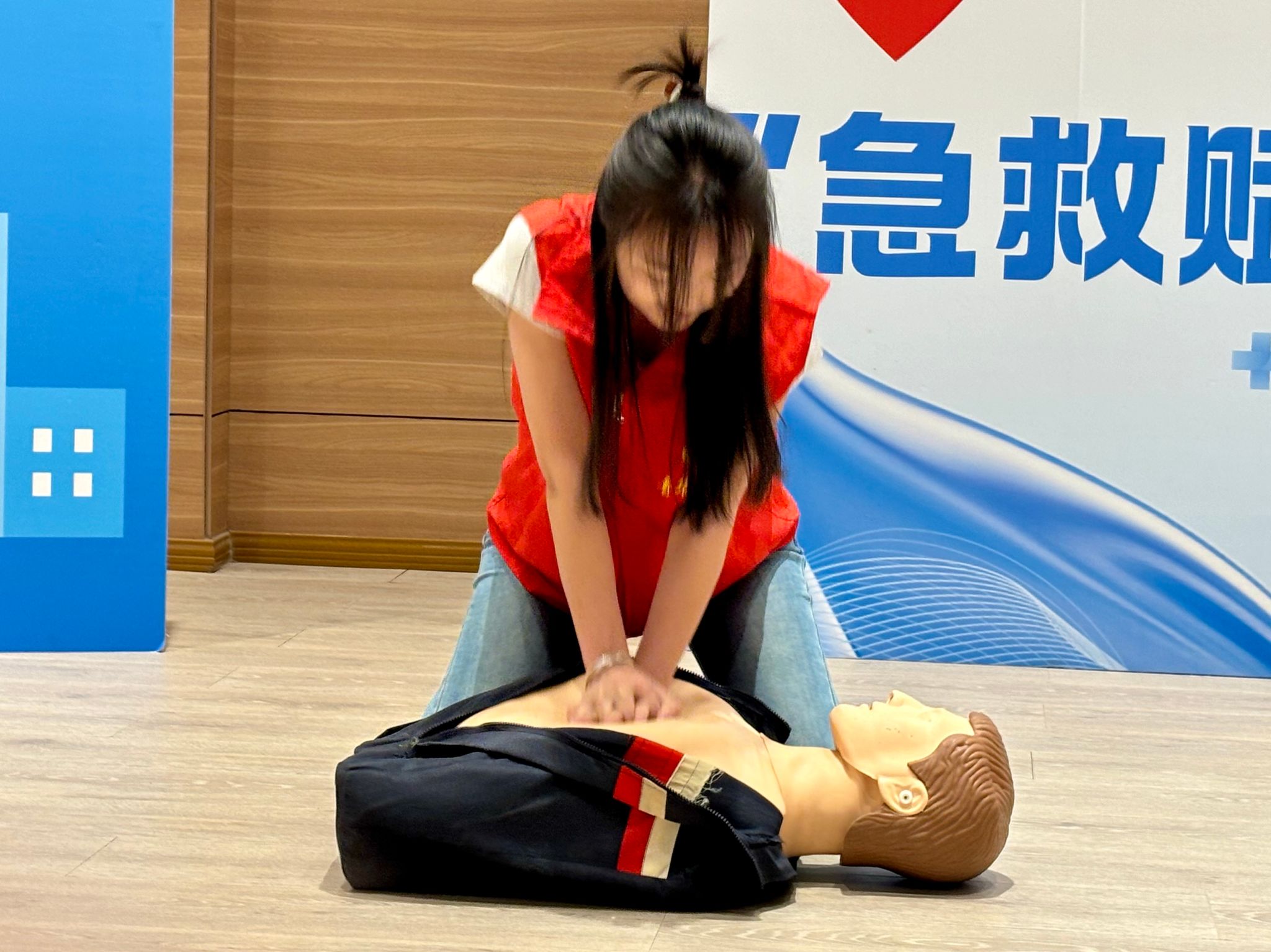 理论讲解后,参训师生分组进入实操环节。蓝天救援队通过心肺复苏模拟人、海姆立克训练背心及AED教学设备,构建沉浸式急救场景。搭建起运动场猝死、教室心脏骤停、食堂异物梗阻等三大校园高频急救场景,全面检验学员的应变能力。在"评估现场安全—判断意识呼吸—启动应急系统—实施高质量CPR—AED介入"全流程演练中,一对一逐项纠正按压手势、人工呼吸角度等细节。在“运动场急救区”,学员需模拟发现倒地无反应的“患者”,迅速完成环境安全评估、意识判断、呼救报警等流程。救援队员重点指导胸外按压的标准化操作:“按压深度必须达到5-6厘米,掌根始终贴紧胸壁,肩肘腕成直线发力。”参与实操的学生在连续2分钟高强度按压后坦言:“看似简单的动作,实际对体力和专注力都是巨大考验。”