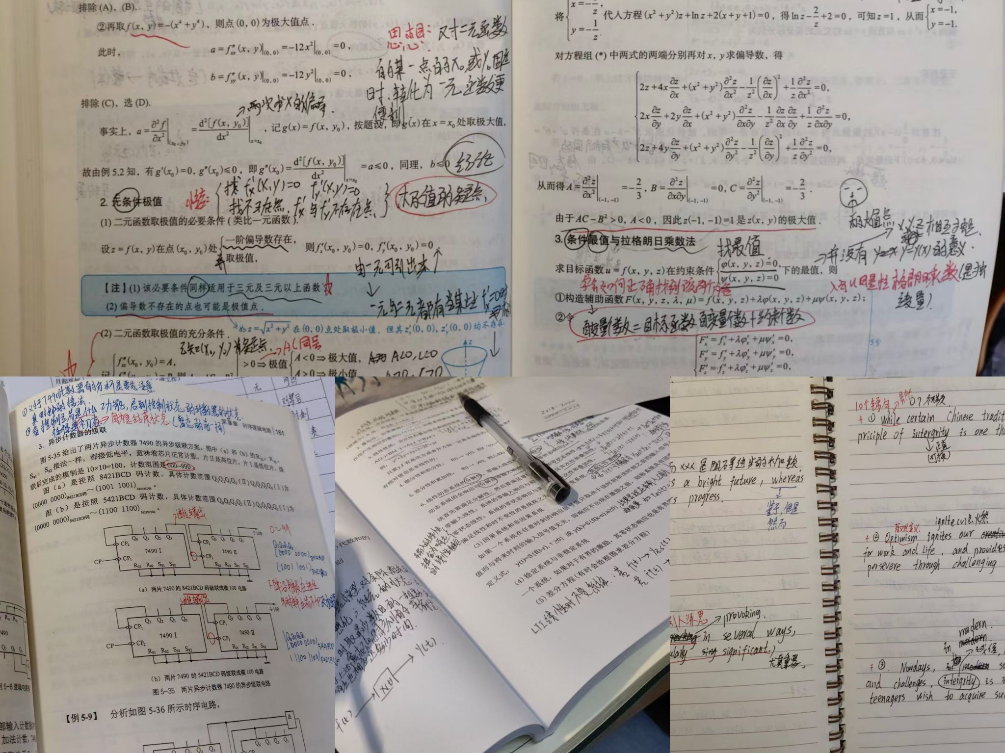 像这样的学生不是个例,别都书院4号楼302的蔡林君被重庆邮电大学光电信息工程专业录取。蔡林君的桌面俨然一座微型实验室:书架堆叠着《光电子技术》《半导体物理》等专著,每本书侧边都用不同颜色的胶带标注着“未攻克章节”;A4纸打印的历年真题被订成厚册,边角卷起处密密麻麻挤满红色批注;最醒目的是那本“战损级”错题本——封皮用医用胶布反复粘贴,内页公式推导处布满指甲掐出的凹痕,仿佛一本记载着思维突围的战地日记。